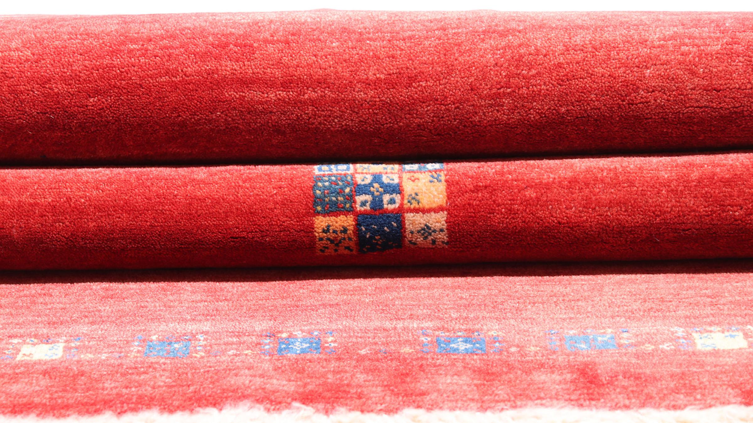 This beautiful rug is a Persian Gabbeh, one of the highest quality Gabbeh rugs available. These rugs are hand-knotted by nomads or semi-nomads in Iran using traditional artisan techniques. The simple motifs and patterns are often inspired by the nomads' immediate surroundings, featuring elements like camels, trees, or bushes. Persian Gabbeh carpets are made from wool sourced from locally raised sheep herds, with the wool typically spun by hand. Thus each of these Oriental rugs thus embodies a unique character steeped in centuries-old culture.