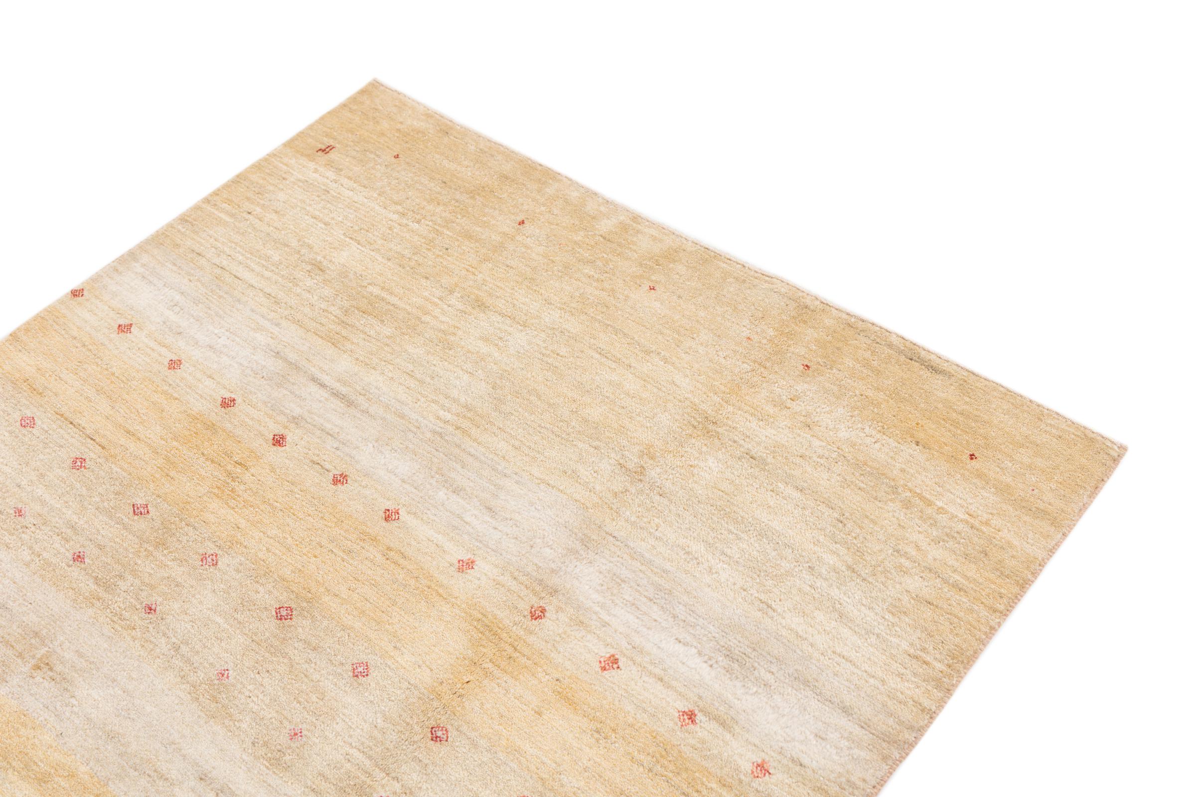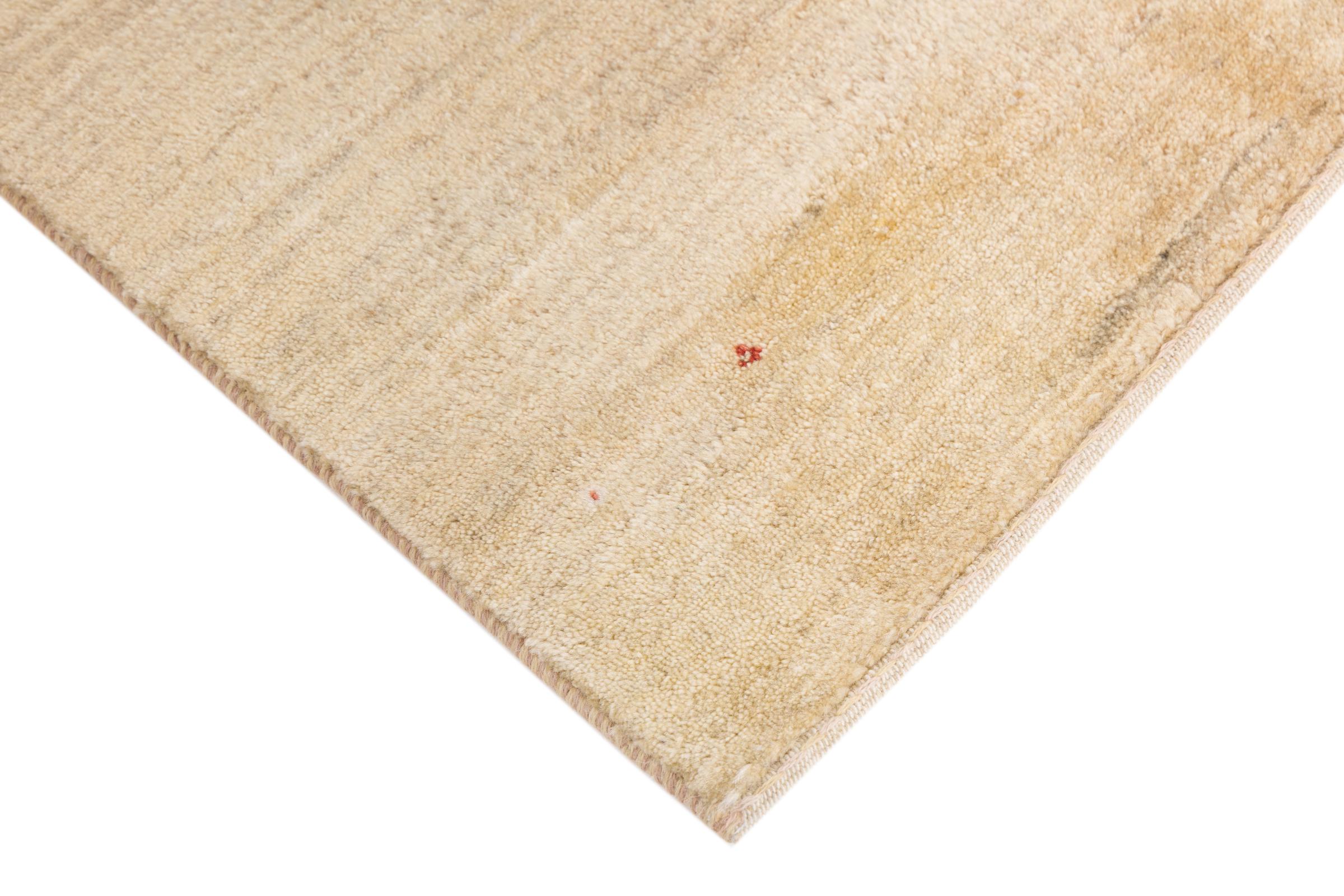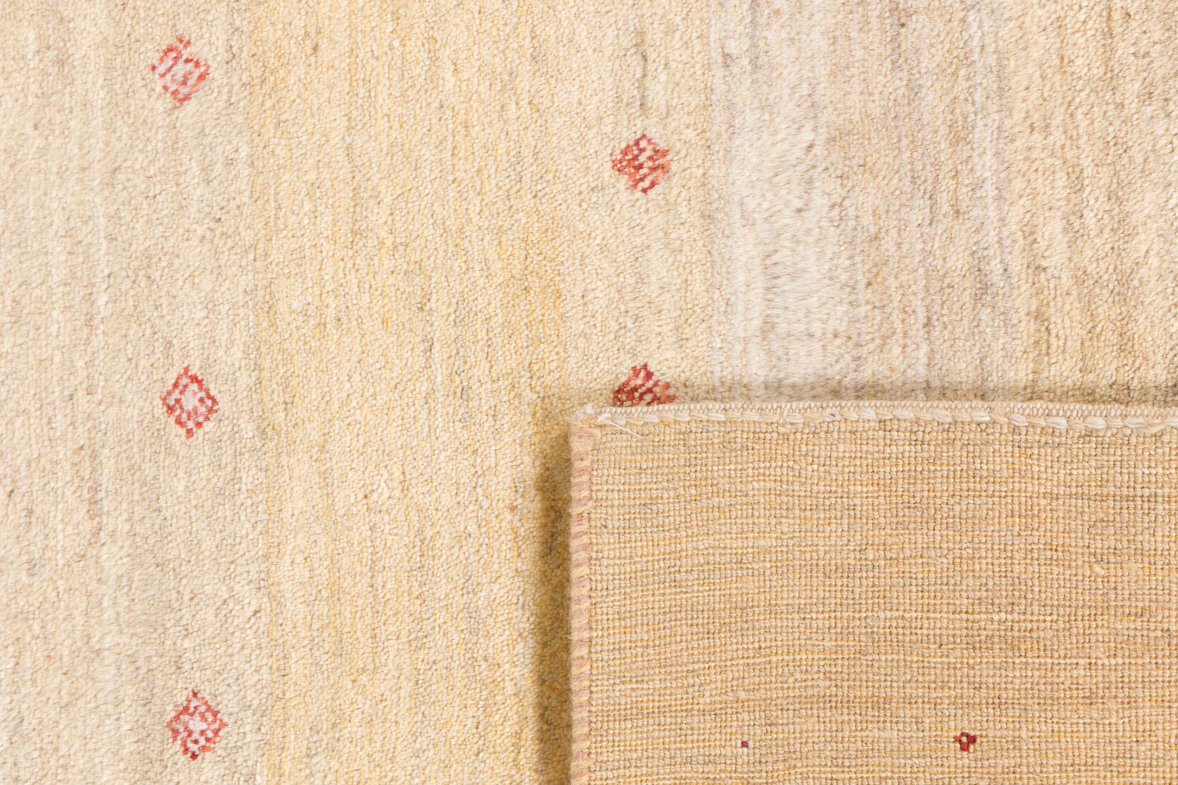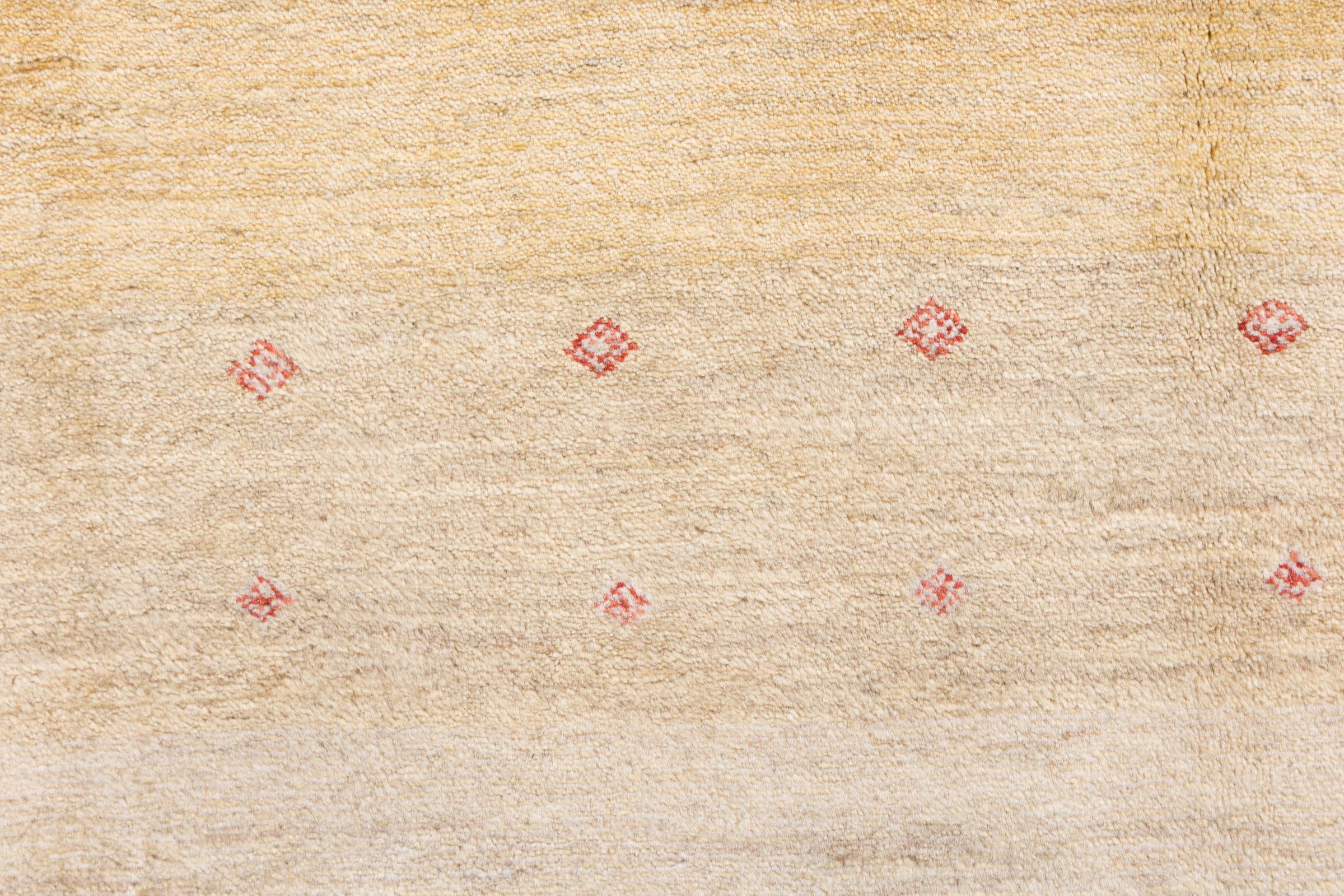 This beautiful rug is a Persian Gabbeh, one of the highest quality Gabbeh rugs available. These rugs are hand-knotted by nomads or semi-nomads in Iran using traditional artisan techniques. The simple motifs and patterns are often inspired by the nomads' immediate surroundings, featuring elements like camels, trees, or bushes. Persian Gabbeh carpets are made from wool sourced from locally raised sheep herds, with the wool typically spun by hand. Thus each of these Oriental rugs thus embodies a unique character steeped in centuries-old culture.
