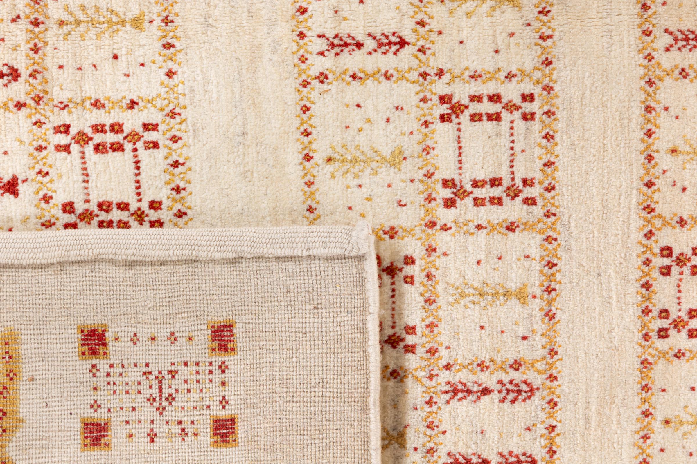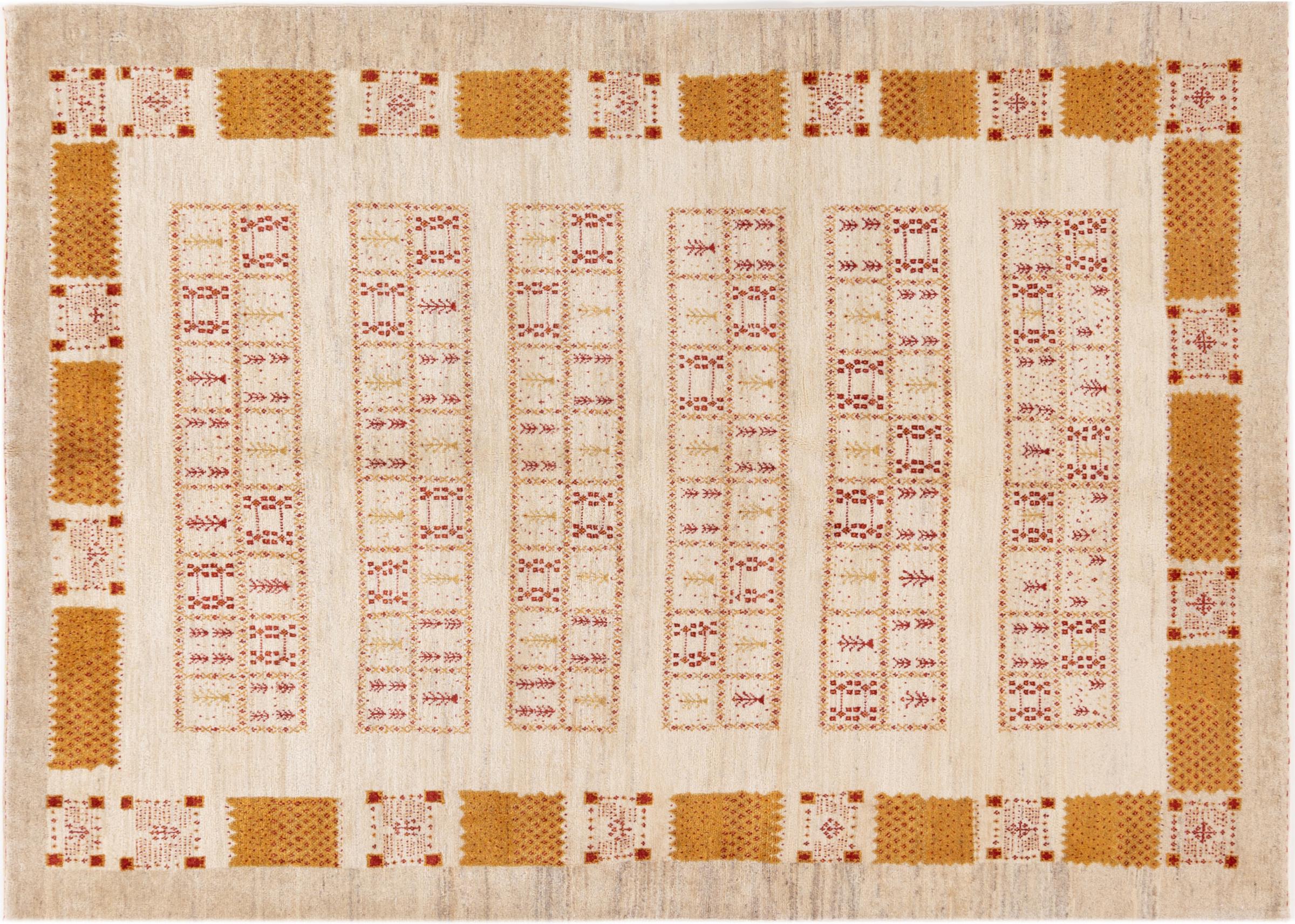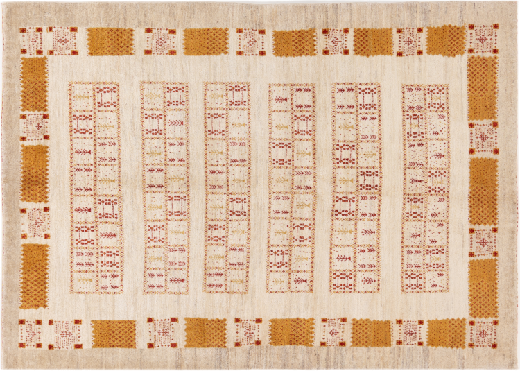This beautiful rug is a Persian Gabbeh, one of the highest quality Gabbeh rugs available. These rugs are hand-knotted by nomads or semi-nomads in Iran using traditional artisan techniques. The simple motifs and patterns are often inspired by the nomads' immediate surroundings, featuring elements like camels, trees, or bushes. Persian Gabbeh carpets are made from wool sourced from locally raised sheep herds, with the wool typically spun by hand. Thus each of these Oriental rugs thus embodies a unique character steeped in centuries-old culture.