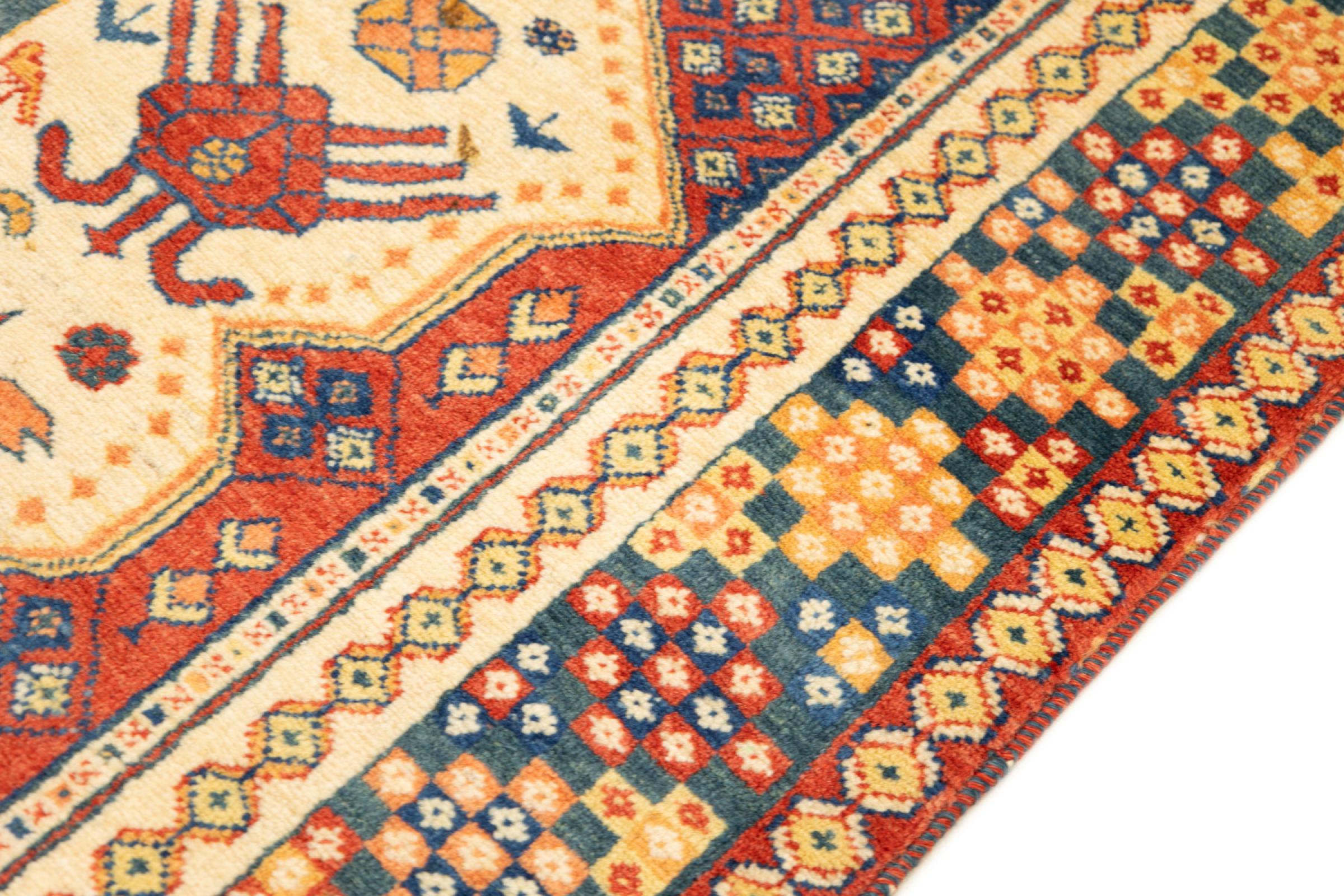 This beautiful rug is a Persian Gabbeh, one of the highest quality Gabbeh rugs available. These rugs are hand-knotted by nomads or semi-nomads in Iran using traditional artisan techniques. The simple motifs and patterns are often inspired by the nomads' immediate surroundings, featuring elements like camels, trees, or bushes. Persian Gabbeh carpets are made from wool sourced from locally raised sheep herds, with the wool typically spun by hand. Thus each of these Oriental rugs thus embodies a unique character steeped in centuries-old culture.