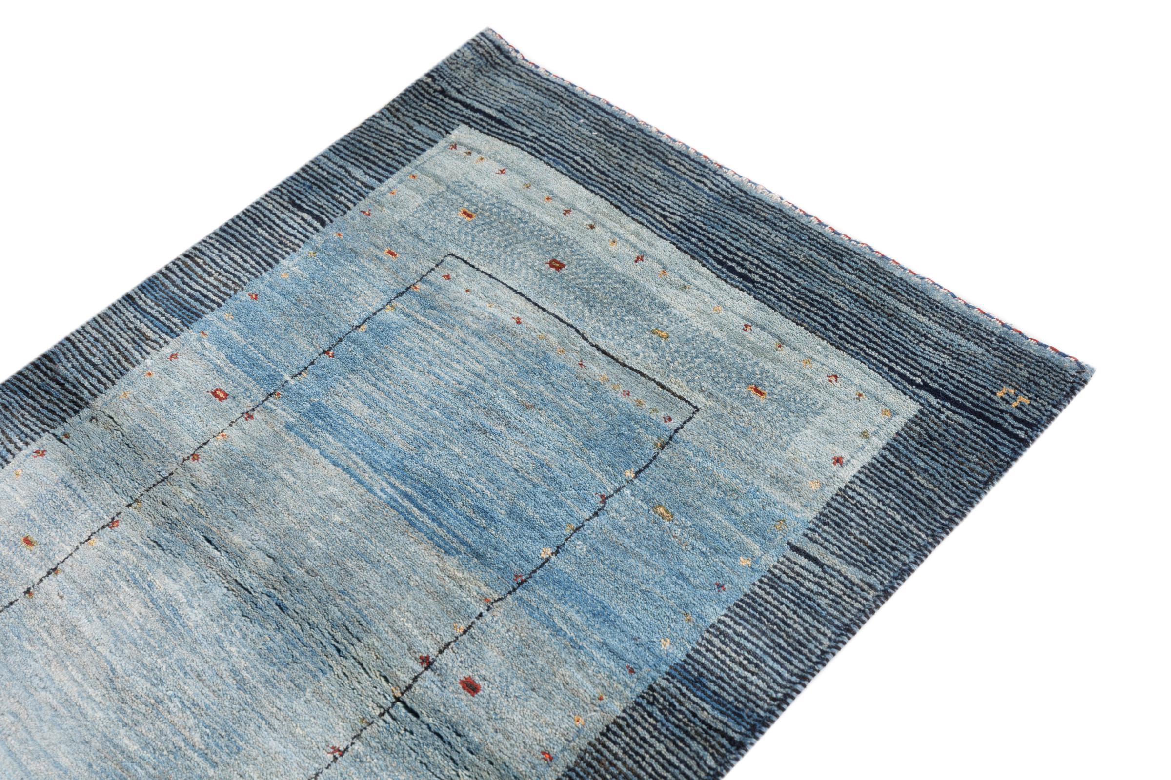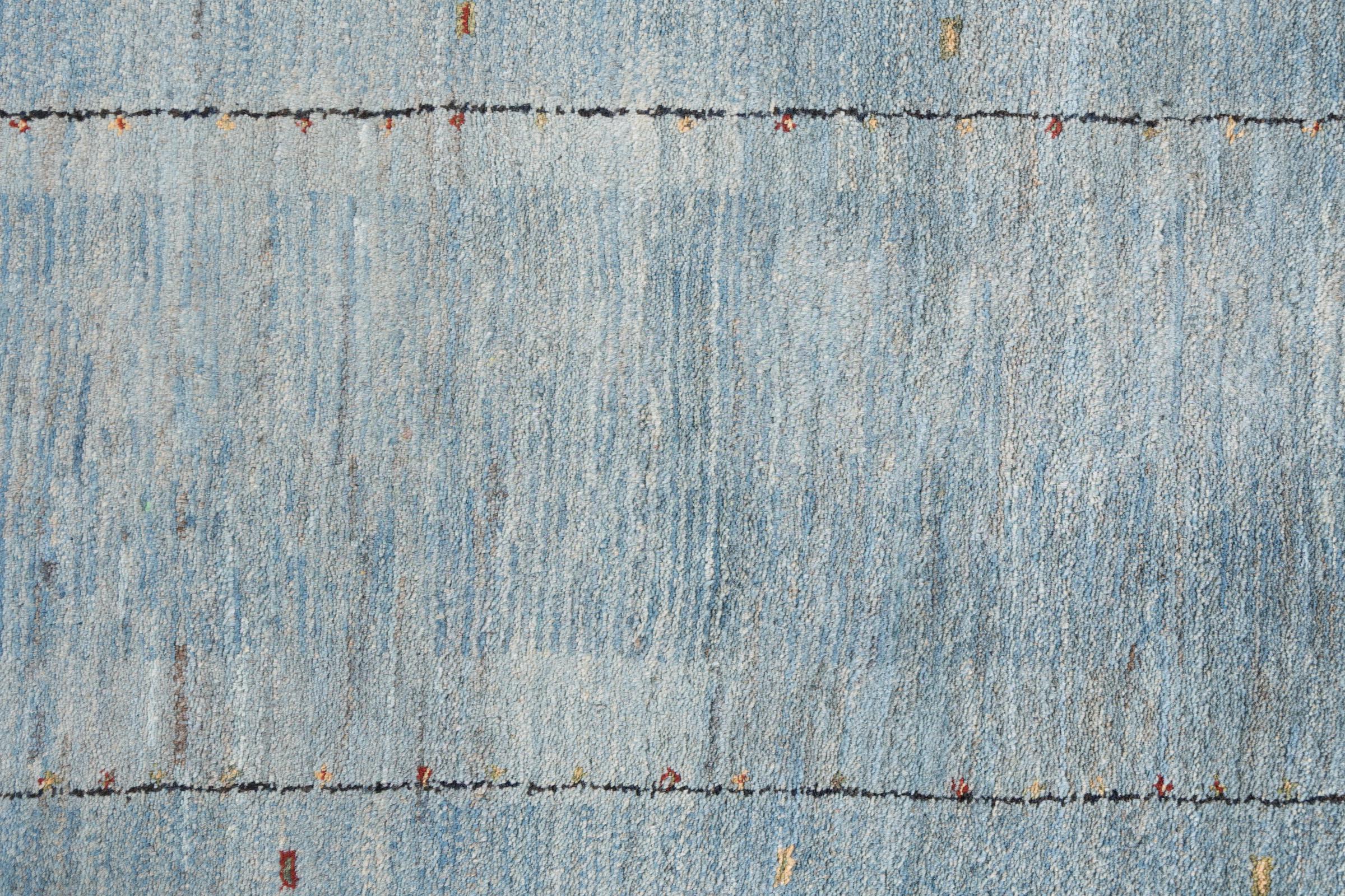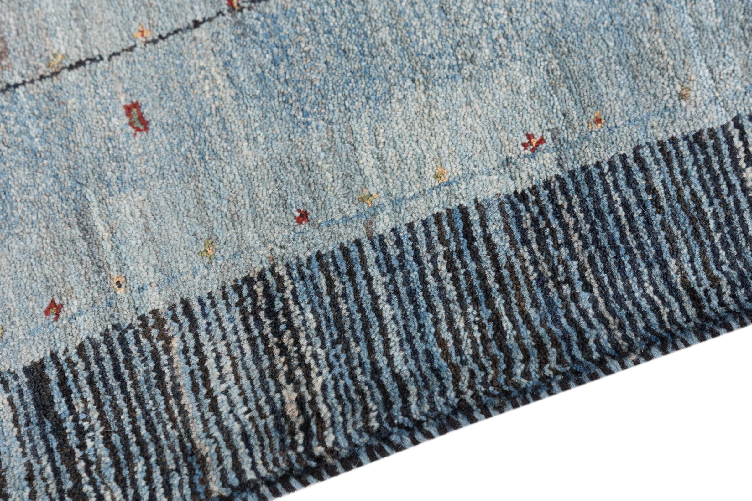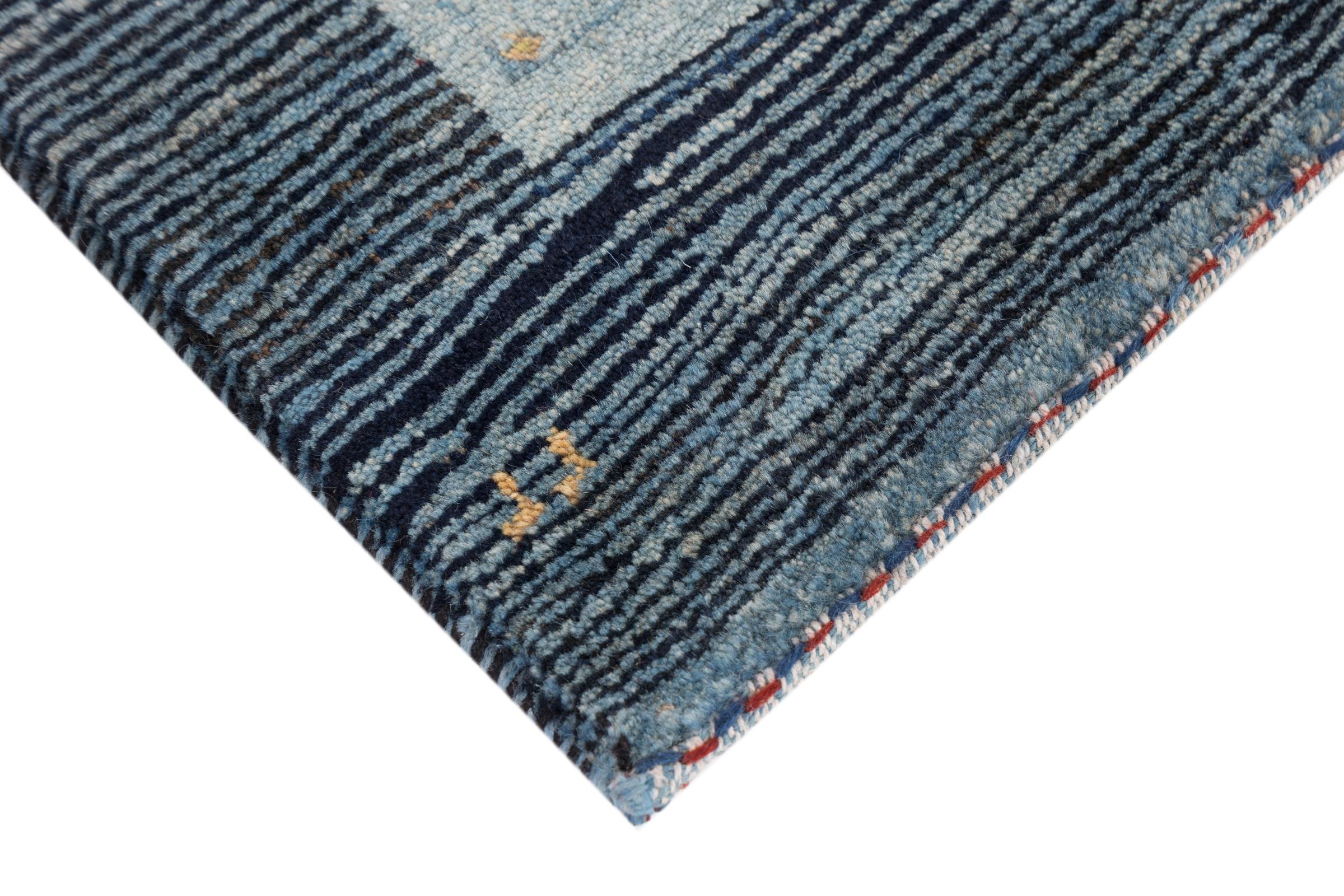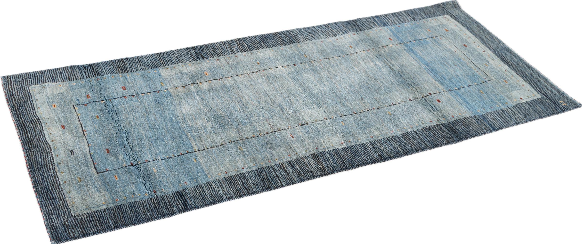This beautiful rug is a Persian Gabbeh, one of the highest quality Gabbeh rugs available. These rugs are hand-knotted by nomads or semi-nomads in Iran using traditional artisan techniques. The simple motifs and patterns are often inspired by the nomads' immediate surroundings, featuring elements like camels, trees, or bushes. Persian Gabbeh carpets are made from wool sourced from locally raised sheep herds, with the wool typically spun by hand. Thus each of these Oriental rugs thus embodies a unique character steeped in centuries-old culture.