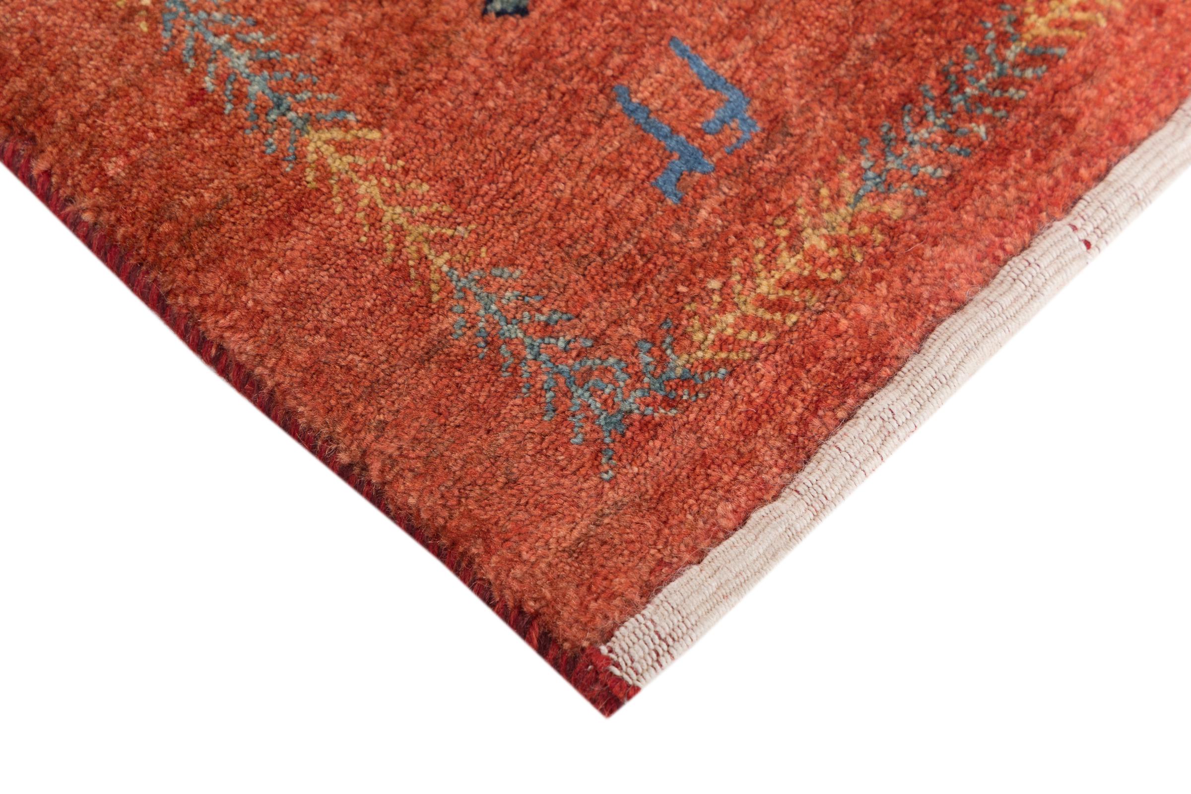 This beautiful rug is a Persian Gabbeh, one of the highest quality Gabbeh rugs available. These rugs are hand-knotted by nomads or semi-nomads in Iran using traditional artisan techniques. The simple motifs and patterns are often inspired by the nomads' immediate surroundings, featuring elements like camels, trees, or bushes. Persian Gabbeh carpets are made from wool sourced from locally raised sheep herds, with the wool typically spun by hand. Thus each of these Oriental rugs thus embodies a unique character steeped in centuries-old culture.
