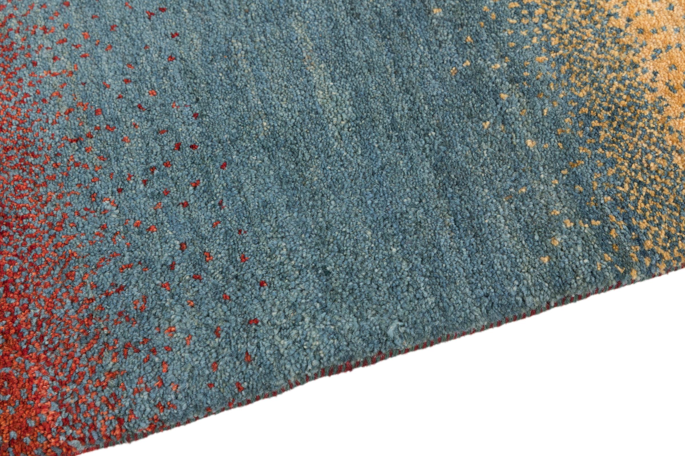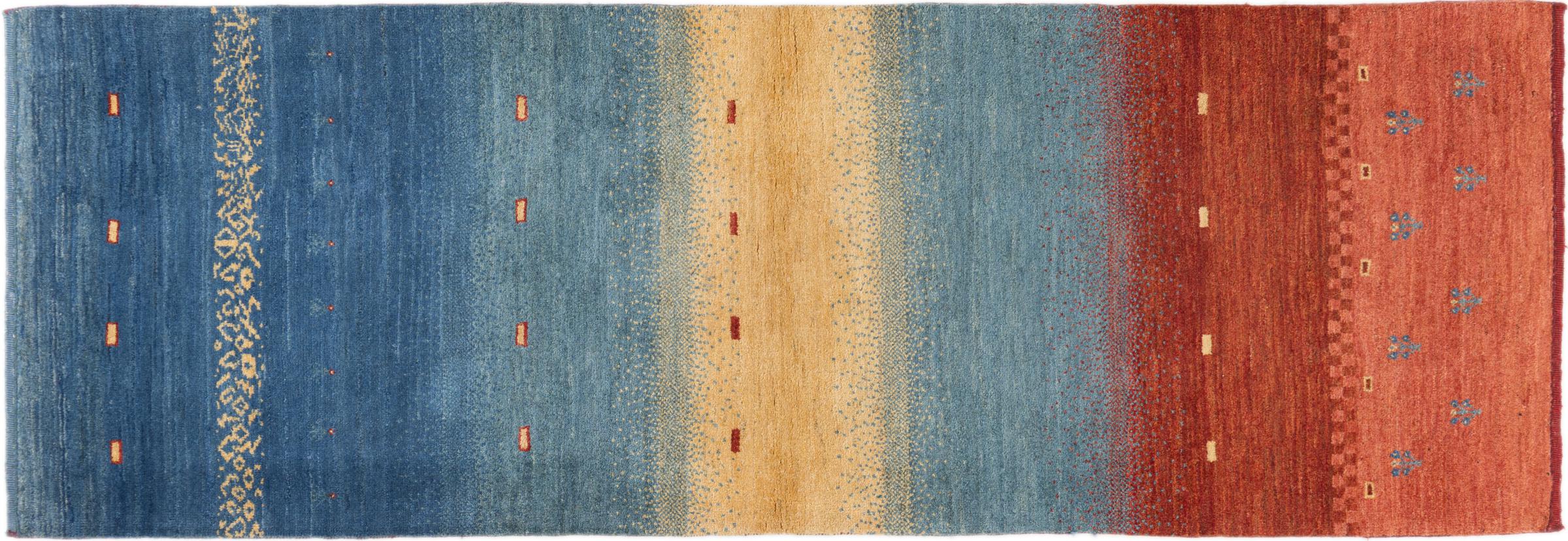This beautiful rug is a Persian Gabbeh, one of the highest quality Gabbeh rugs available. These rugs are hand-knotted by nomads or semi-nomads in Iran using traditional artisan techniques. The simple motifs and patterns are often inspired by the nomads' immediate surroundings, featuring elements like camels, trees, or bushes. Persian Gabbeh carpets are made from wool sourced from locally raised sheep herds, with the wool typically spun by hand. Thus each of these Oriental rugs thus embodies a unique character steeped in centuries-old culture.