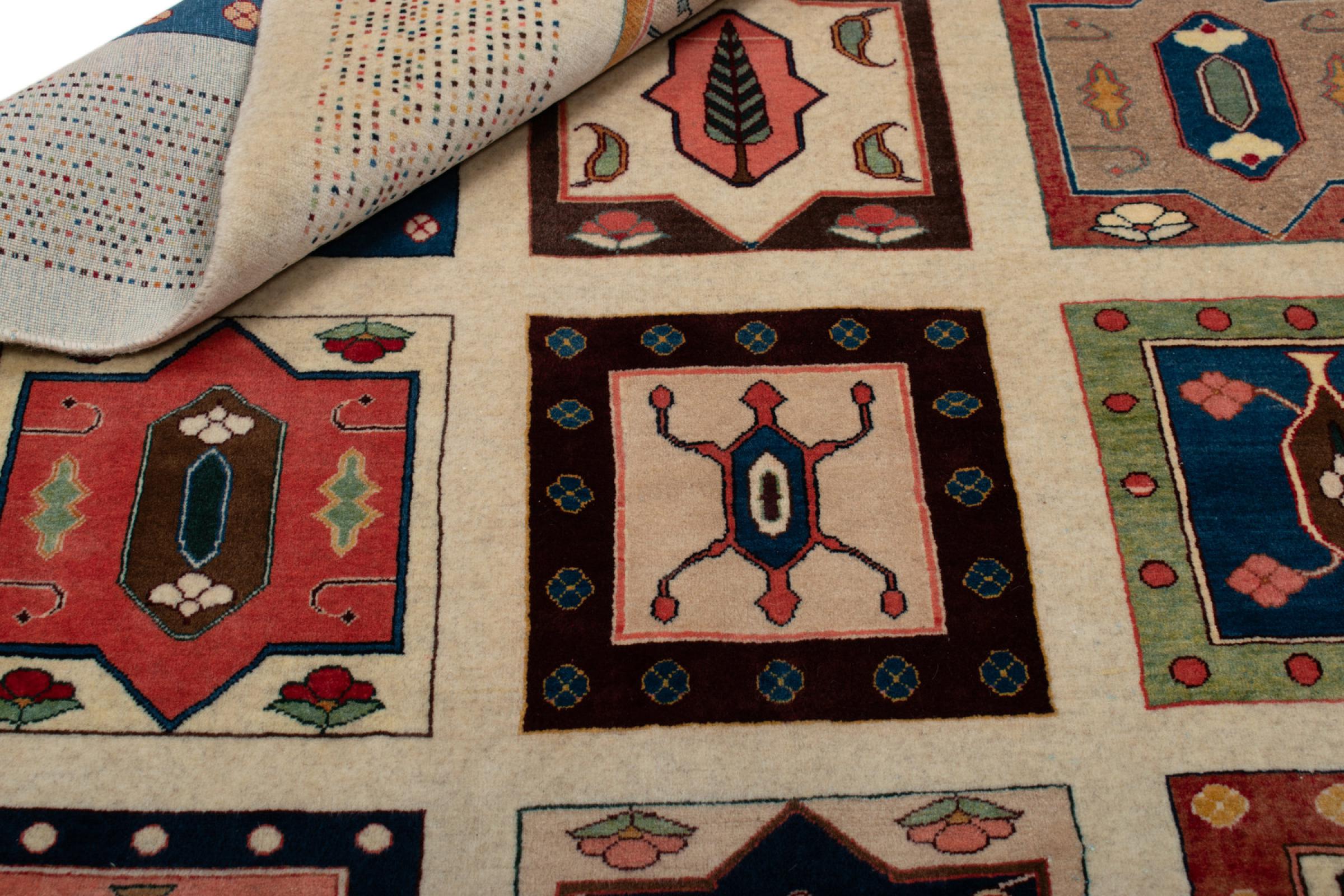 This beautiful rug is a Persian Gabbeh, one of the highest quality Gabbeh rugs available. These rugs are hand-knotted by nomads or semi-nomads in Iran using traditional artisan techniques. The simple motifs and patterns are often inspired by the nomads' immediate surroundings, featuring elements like camels, trees, or bushes. Persian Gabbeh carpets are made from wool sourced from locally raised sheep herds, with the wool typically spun by hand. Thus each of these Oriental rugs thus embodies a unique character steeped in centuries-old culture.