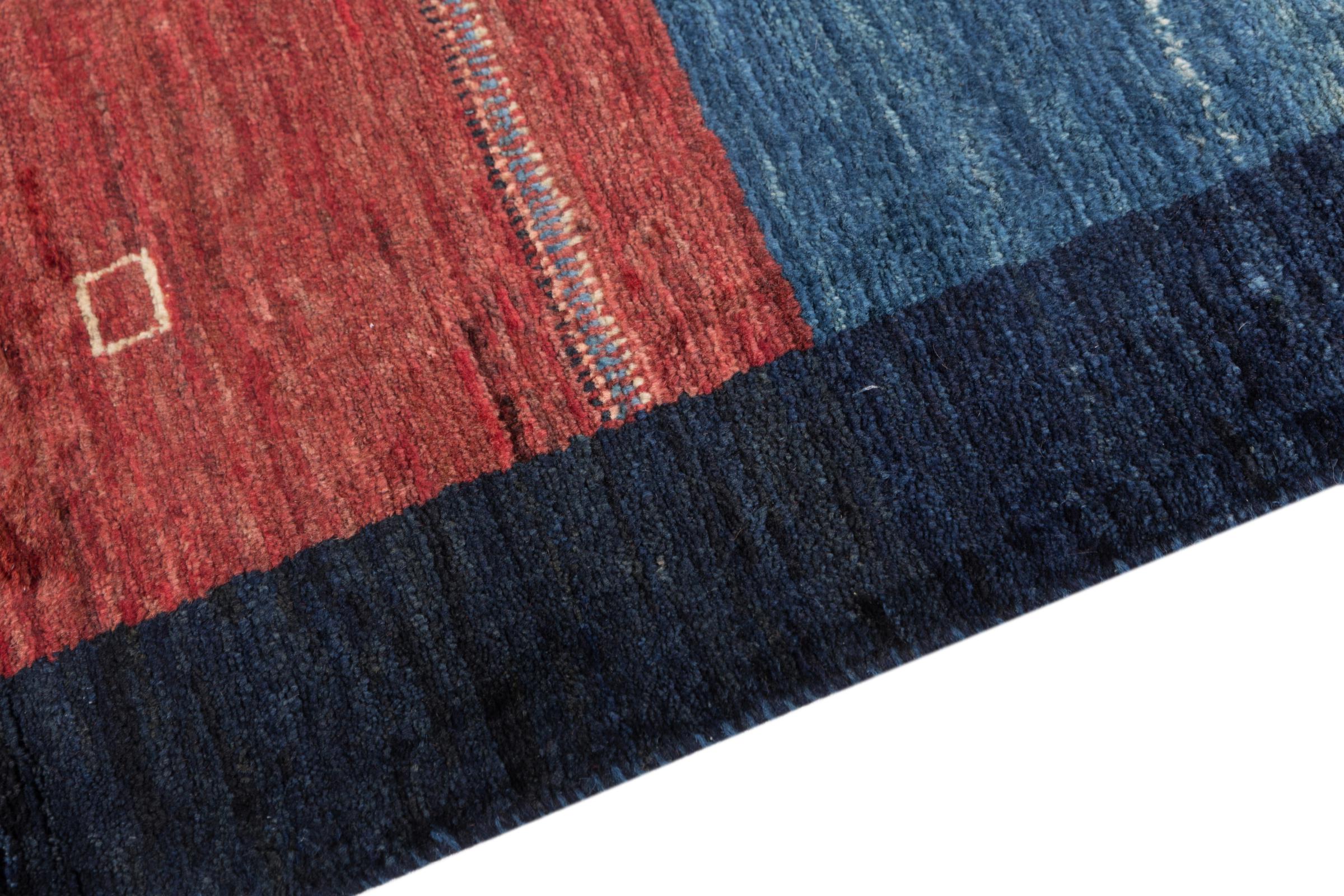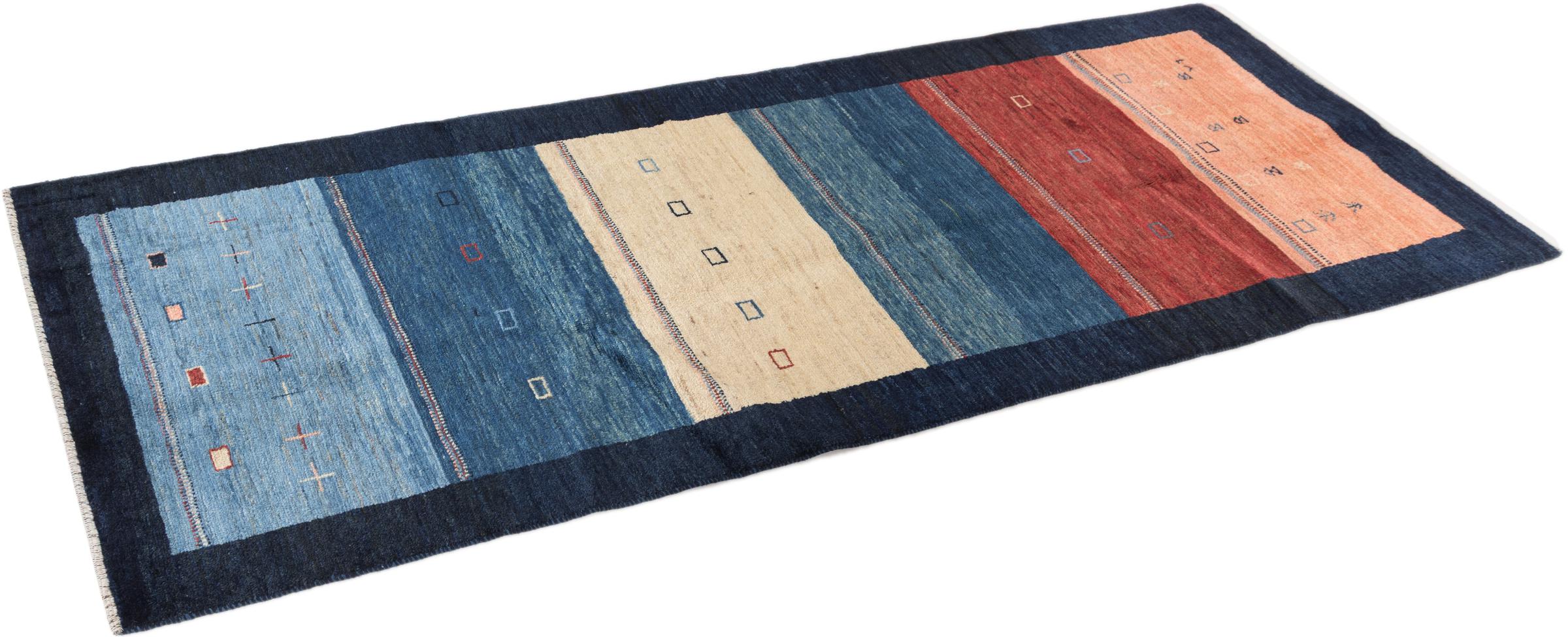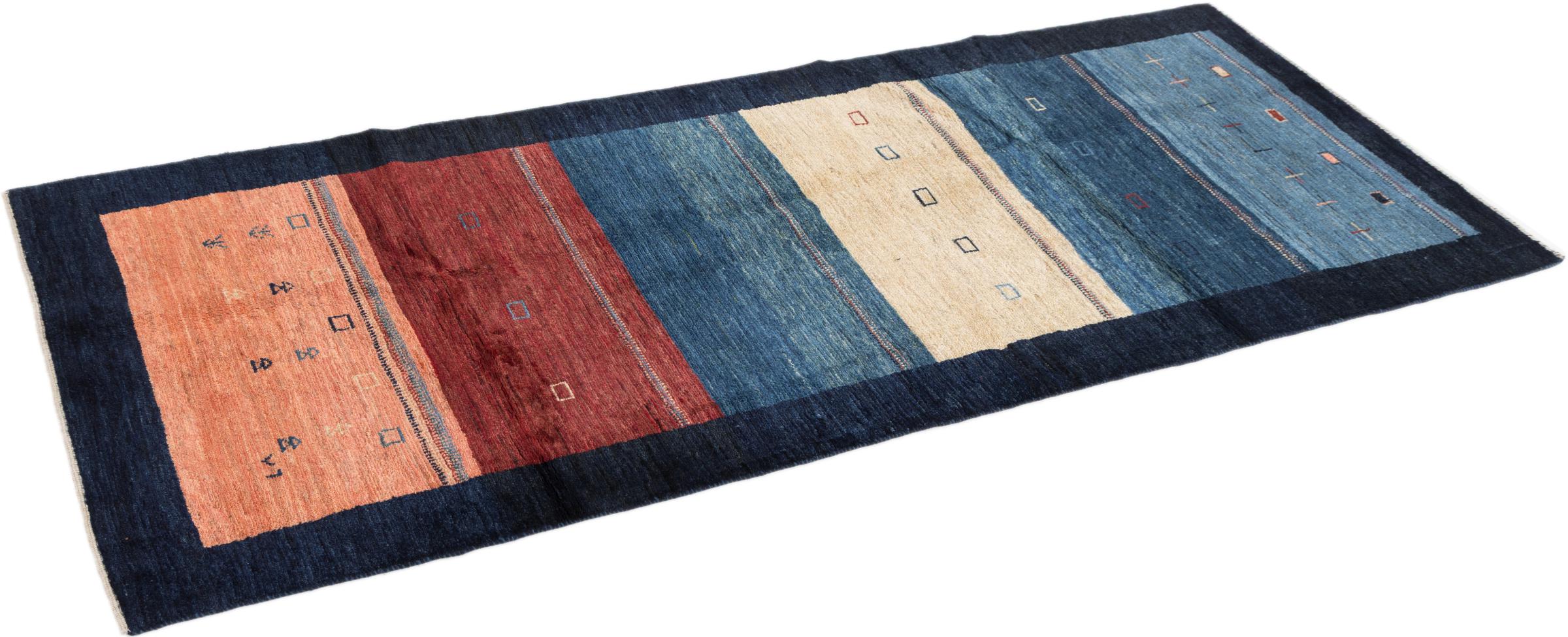 This beautiful rug is a Persian Gabbeh, one of the highest quality Gabbeh rugs available. These rugs are hand-knotted by nomads or semi-nomads in Iran using traditional artisan techniques. The simple motifs and patterns are often inspired by the nomads' immediate surroundings, featuring elements like camels, trees, or bushes. Persian Gabbeh carpets are made from wool sourced from locally raised sheep herds, with the wool typically spun by hand. Thus each of these Oriental rugs thus embodies a unique character steeped in centuries-old culture.