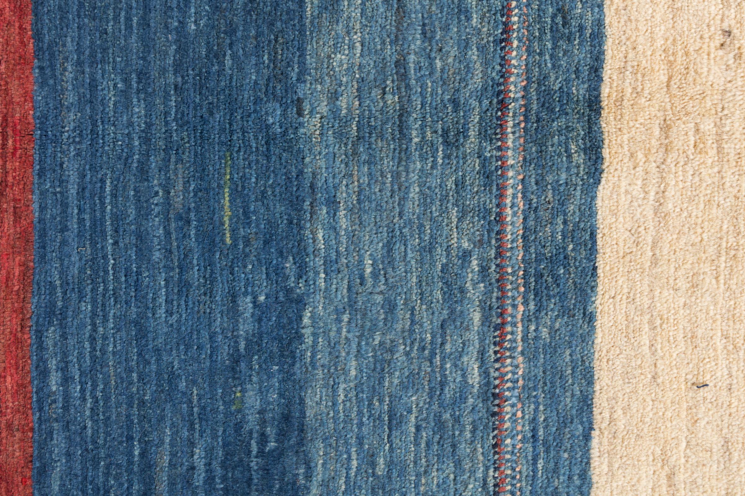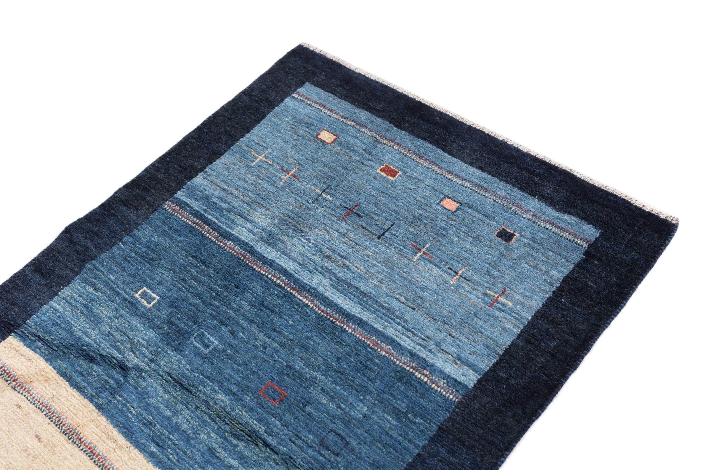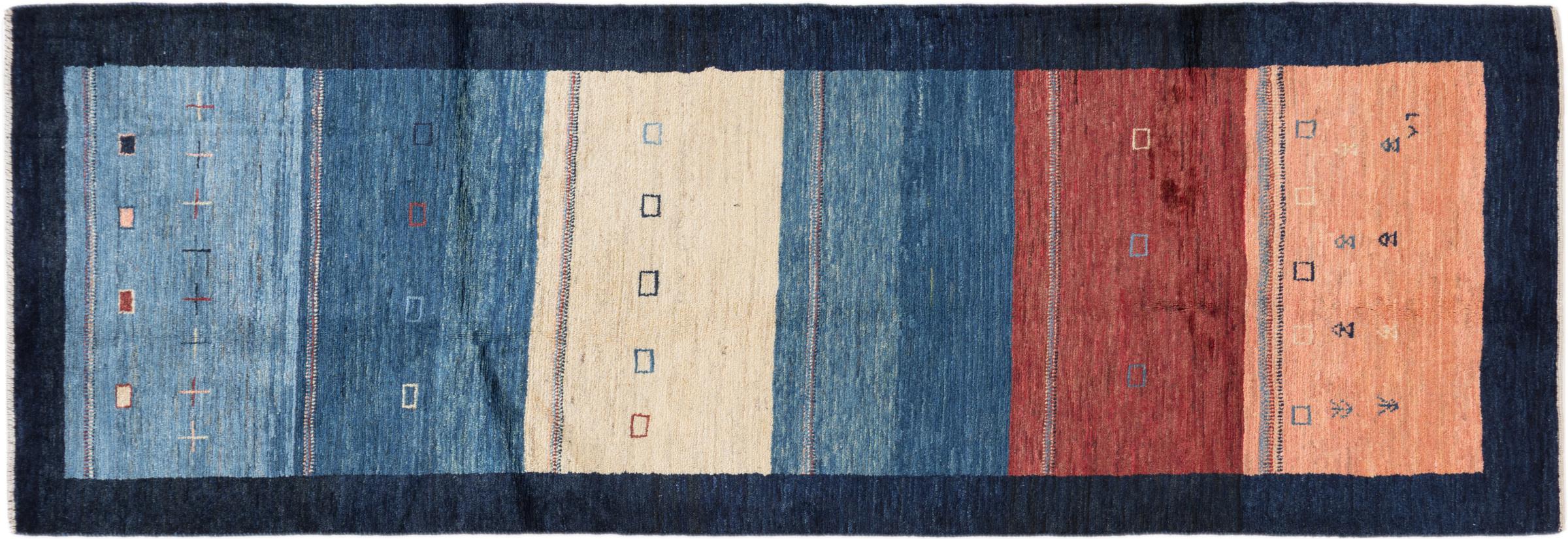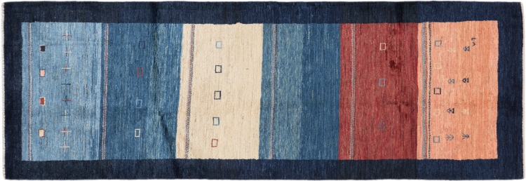 This beautiful rug is a Persian Gabbeh, one of the highest quality Gabbeh rugs available. These rugs are hand-knotted by nomads or semi-nomads in Iran using traditional artisan techniques. The simple motifs and patterns are often inspired by the nomads' immediate surroundings, featuring elements like camels, trees, or bushes. Persian Gabbeh carpets are made from wool sourced from locally raised sheep herds, with the wool typically spun by hand. Thus each of these Oriental rugs thus embodies a unique character steeped in centuries-old culture.