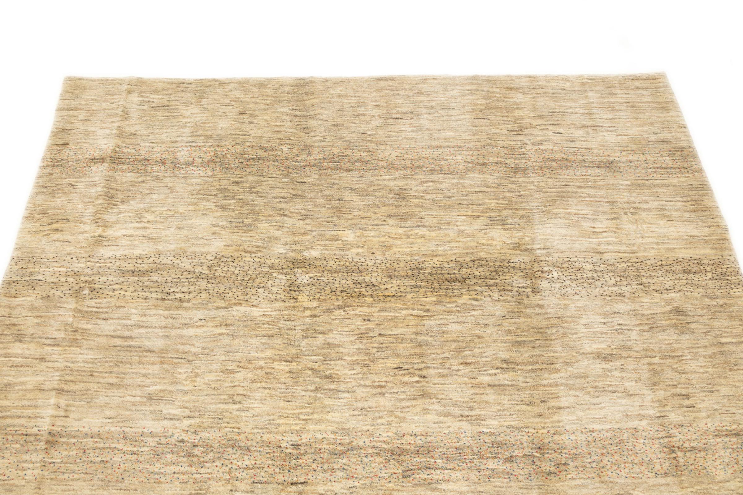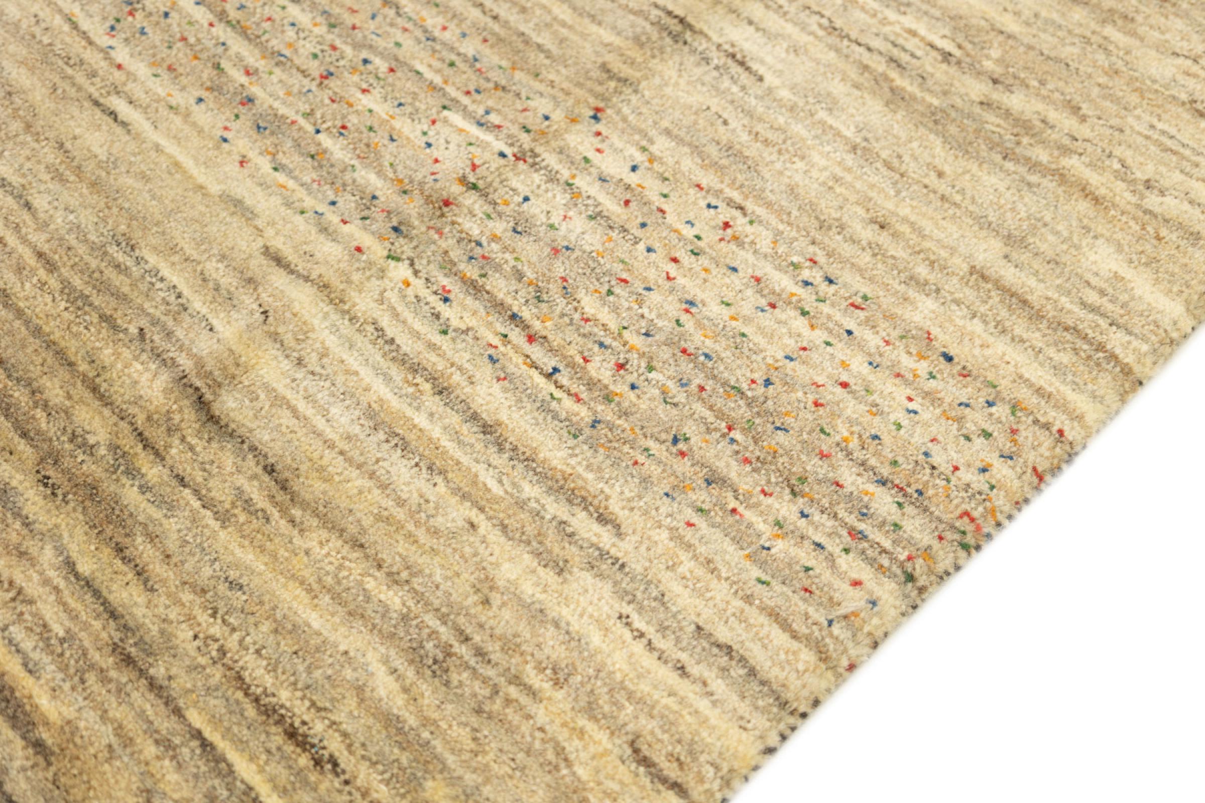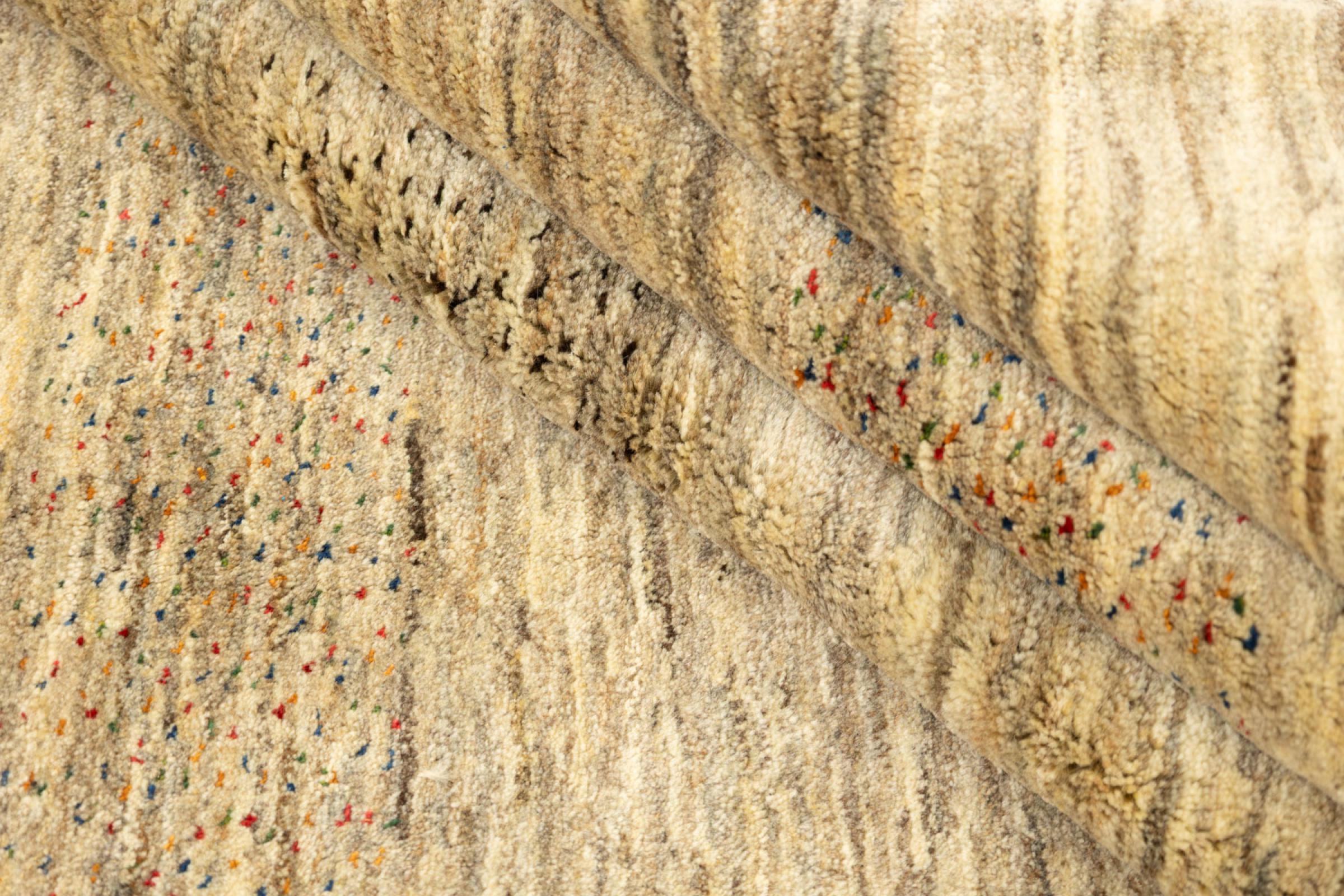 This beautiful rug is a Persian Gabbeh, one of the highest quality Gabbeh rugs available. These rugs are hand-knotted by nomads or semi-nomads in Iran using traditional artisan techniques. The simple motifs and patterns are often inspired by the nomads' immediate surroundings, featuring elements like camels, trees, or bushes. Persian Gabbeh carpets are made from wool sourced from locally raised sheep herds, with the wool typically spun by hand. Thus each of these Oriental rugs thus embodies a unique character steeped in centuries-old culture.