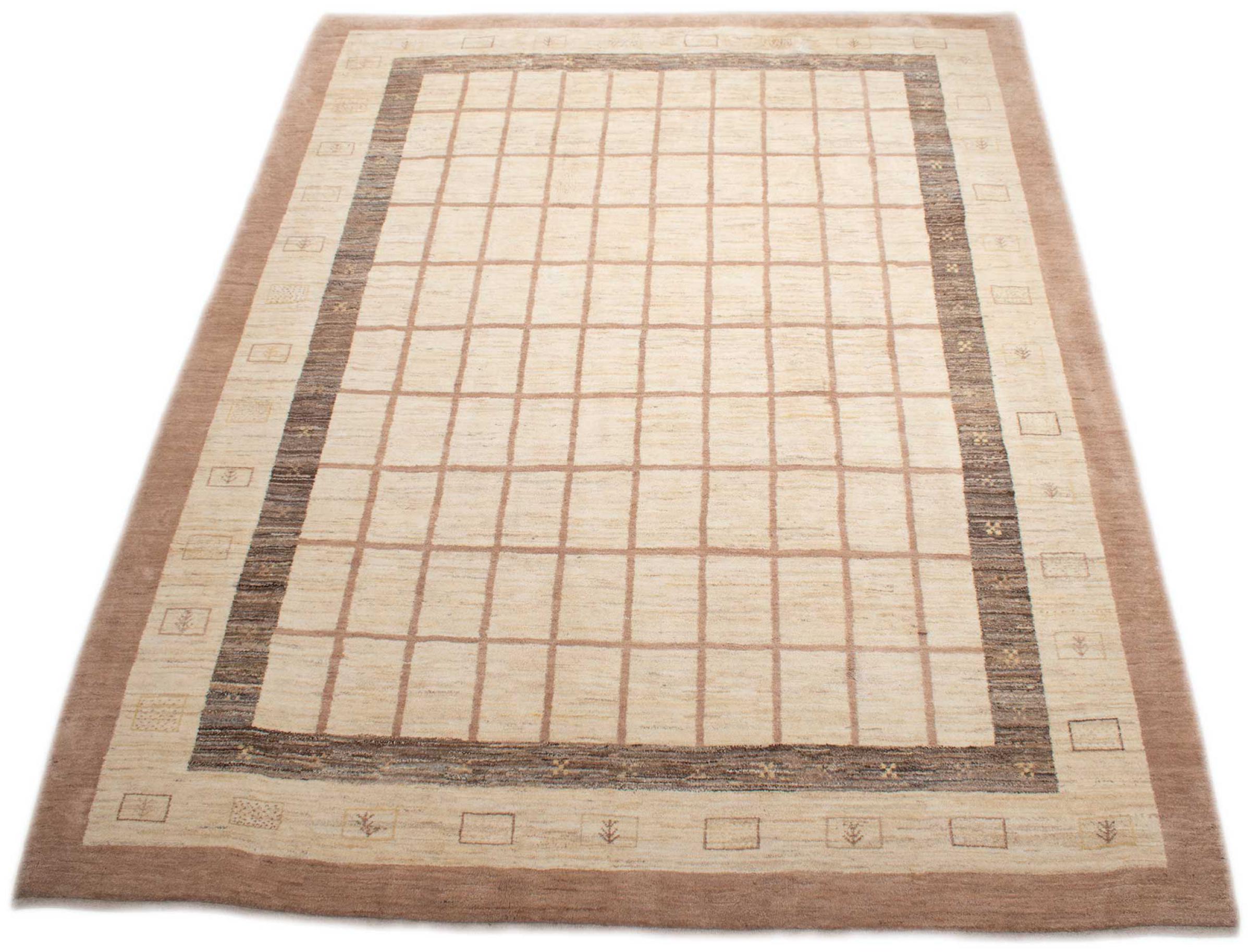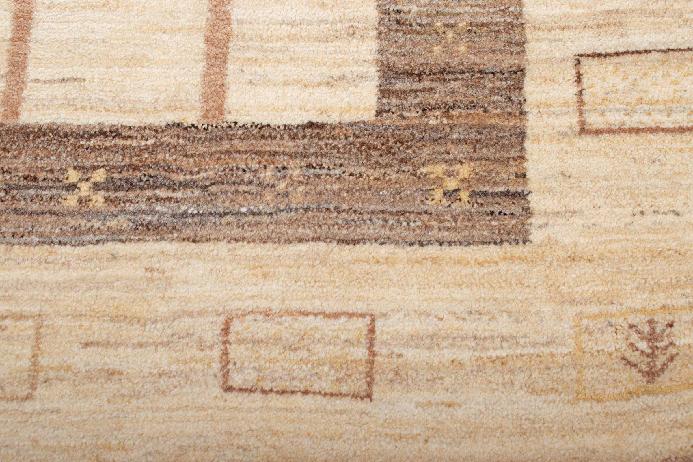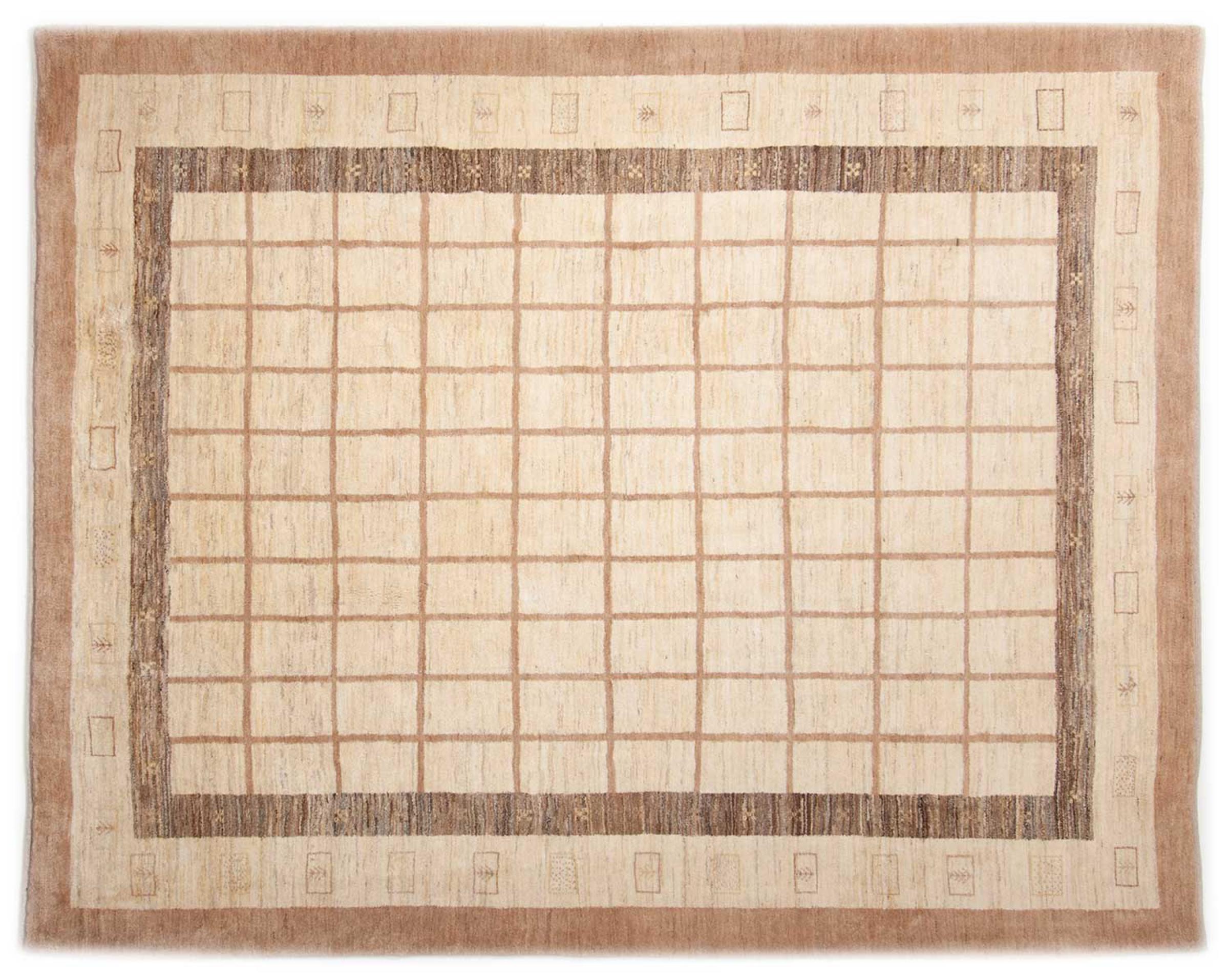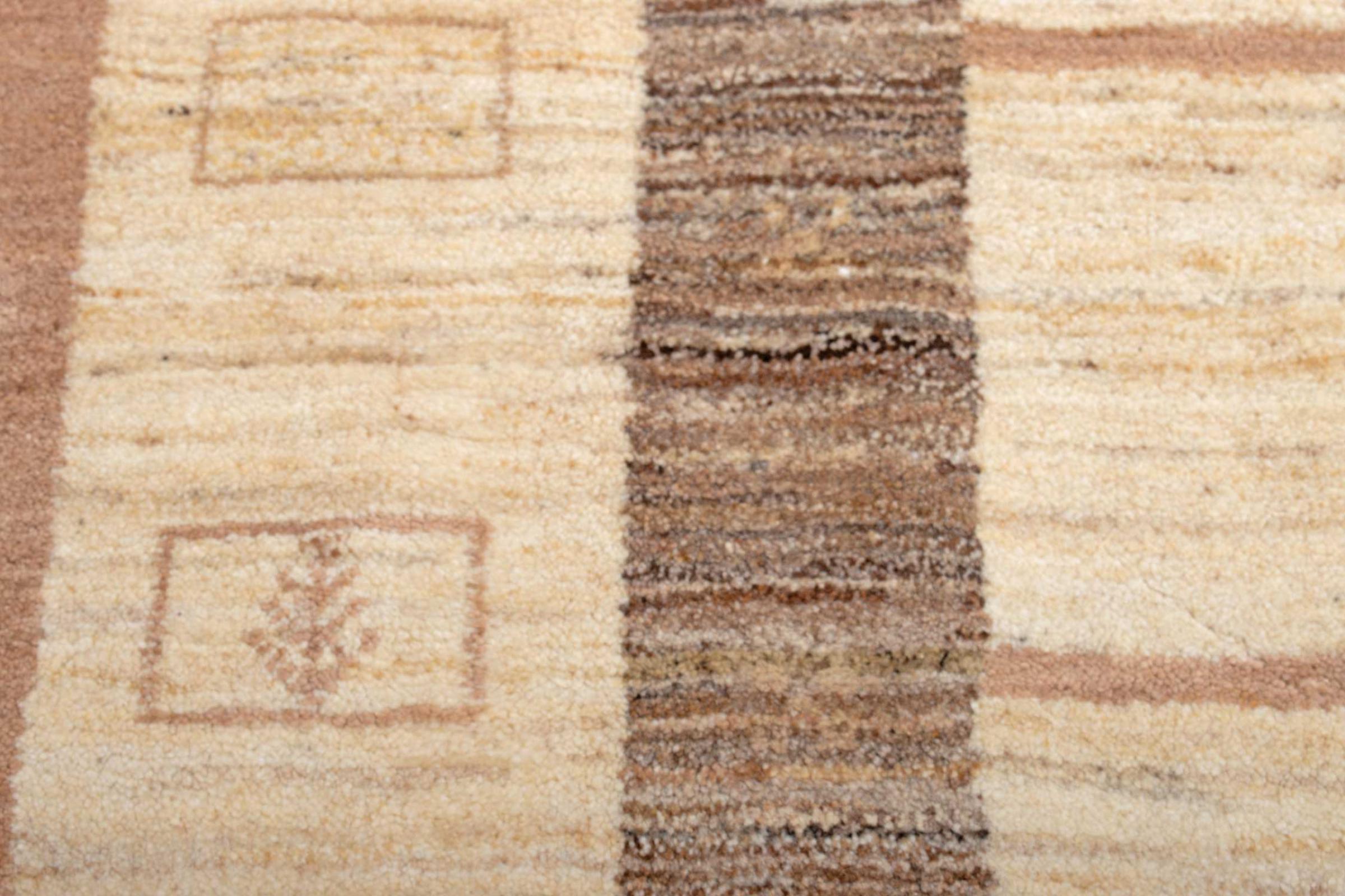 This beautiful rug is a Persian Gabbeh, one of the highest quality Gabbeh rugs available. These rugs are hand-knotted by nomads or semi-nomads in Iran using traditional artisan techniques. The simple motifs and patterns are often inspired by the nomads' immediate surroundings, featuring elements like camels, trees, or bushes. Persian Gabbeh carpets are made from wool sourced from locally raised sheep herds, with the wool typically spun by hand. Thus each of these Oriental rugs thus embodies a unique character steeped in centuries-old culture.