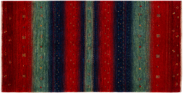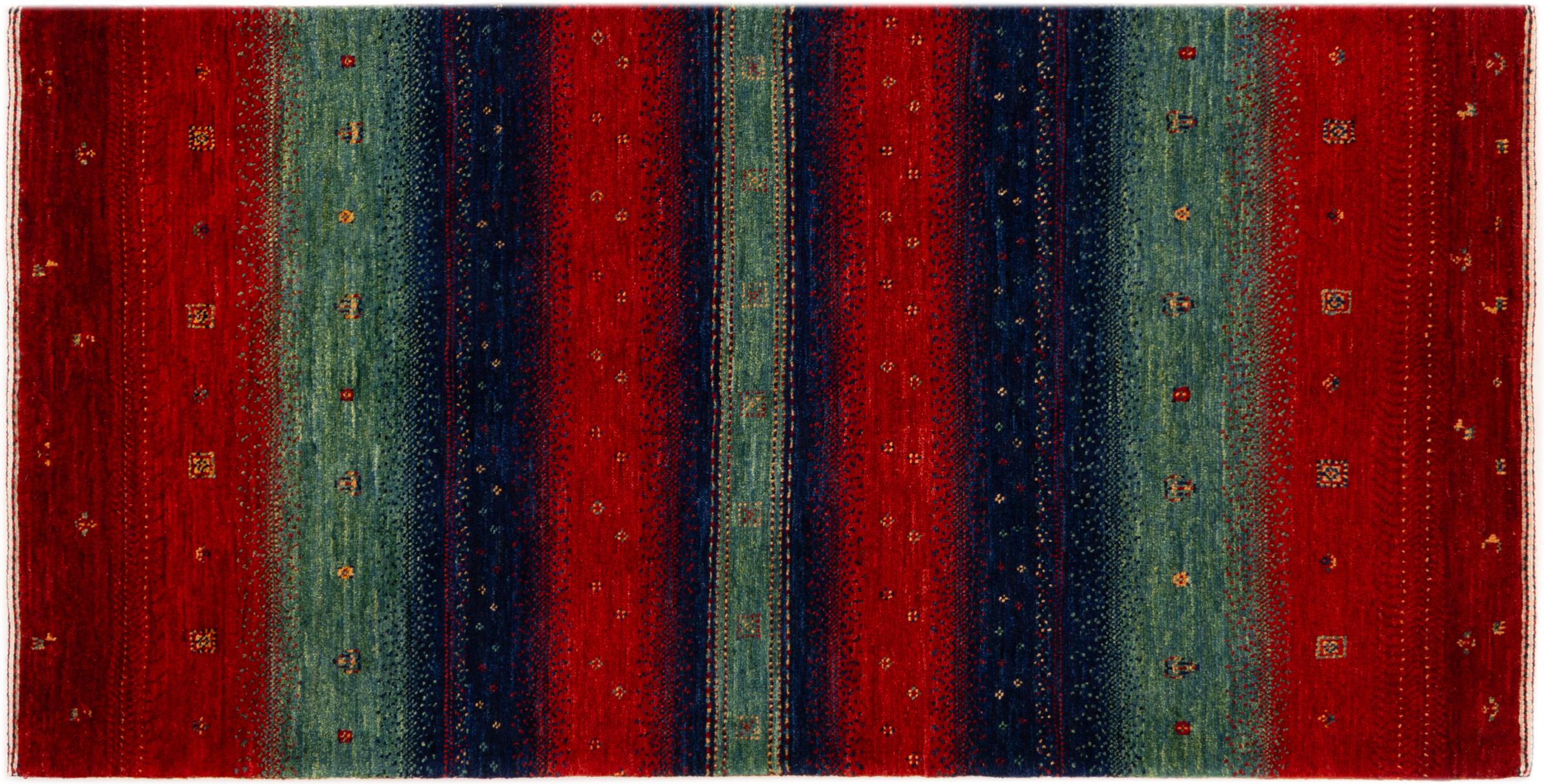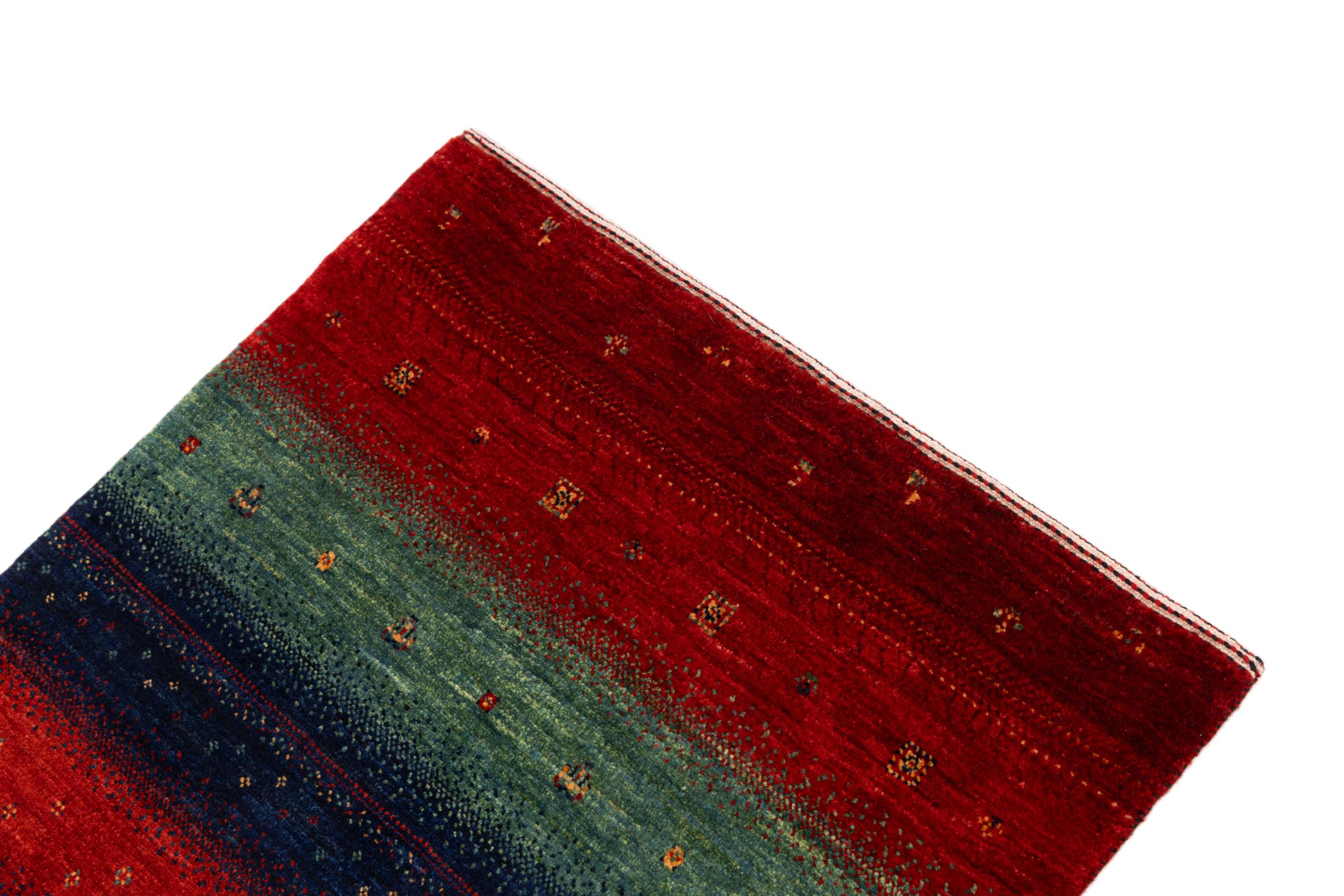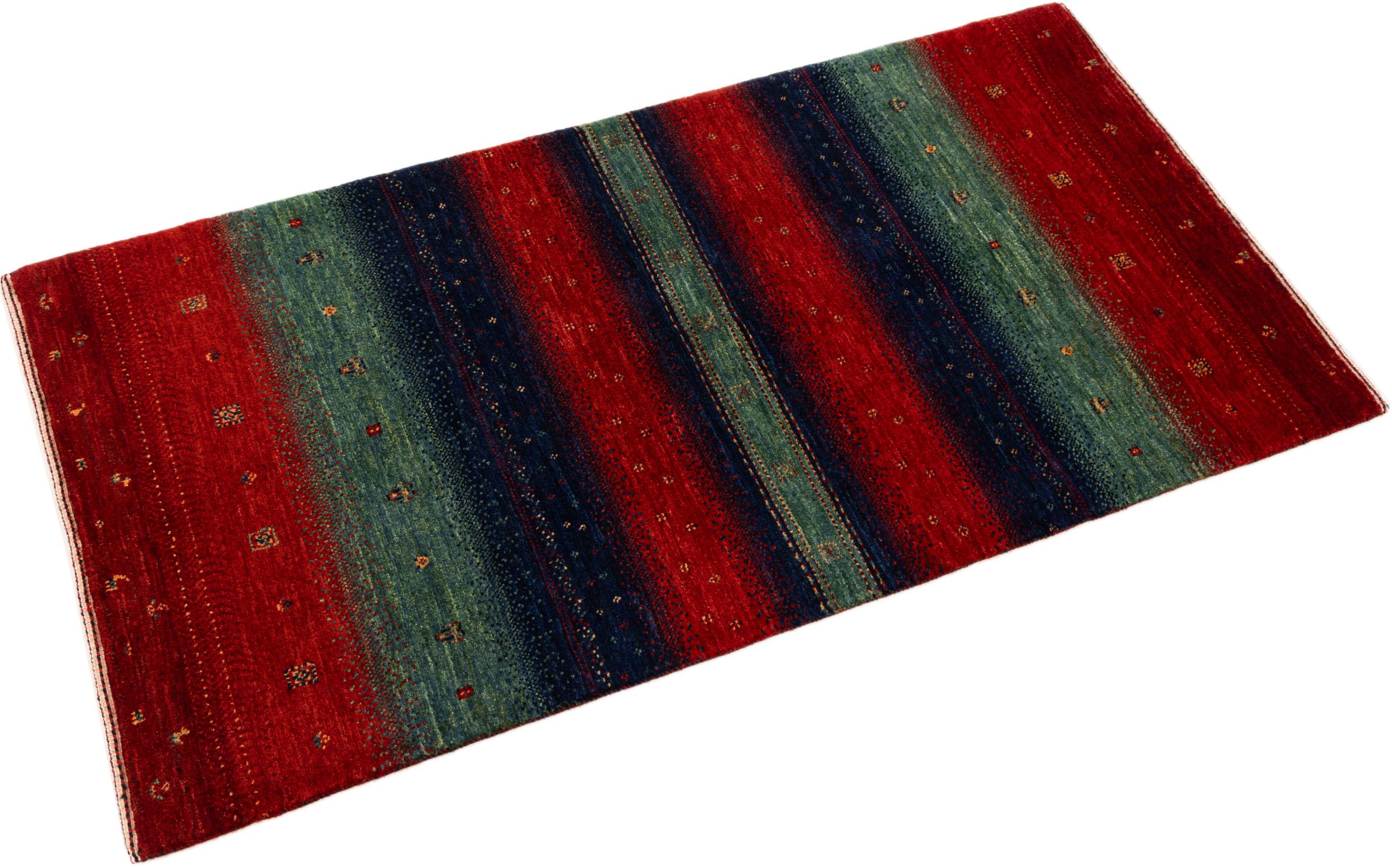 This beautiful rug is a Persian Gabbeh, one of the highest quality Gabbeh rugs available. These rugs are hand-knotted by nomads or semi-nomads in Iran using traditional artisan techniques. The simple motifs and patterns are often inspired by the nomads' immediate surroundings, featuring elements like camels, trees, or bushes. Persian Gabbeh carpets are made from wool sourced from locally raised sheep herds, with the wool typically spun by hand. Thus each of these Oriental rugs thus embodies a unique character steeped in centuries-old culture.