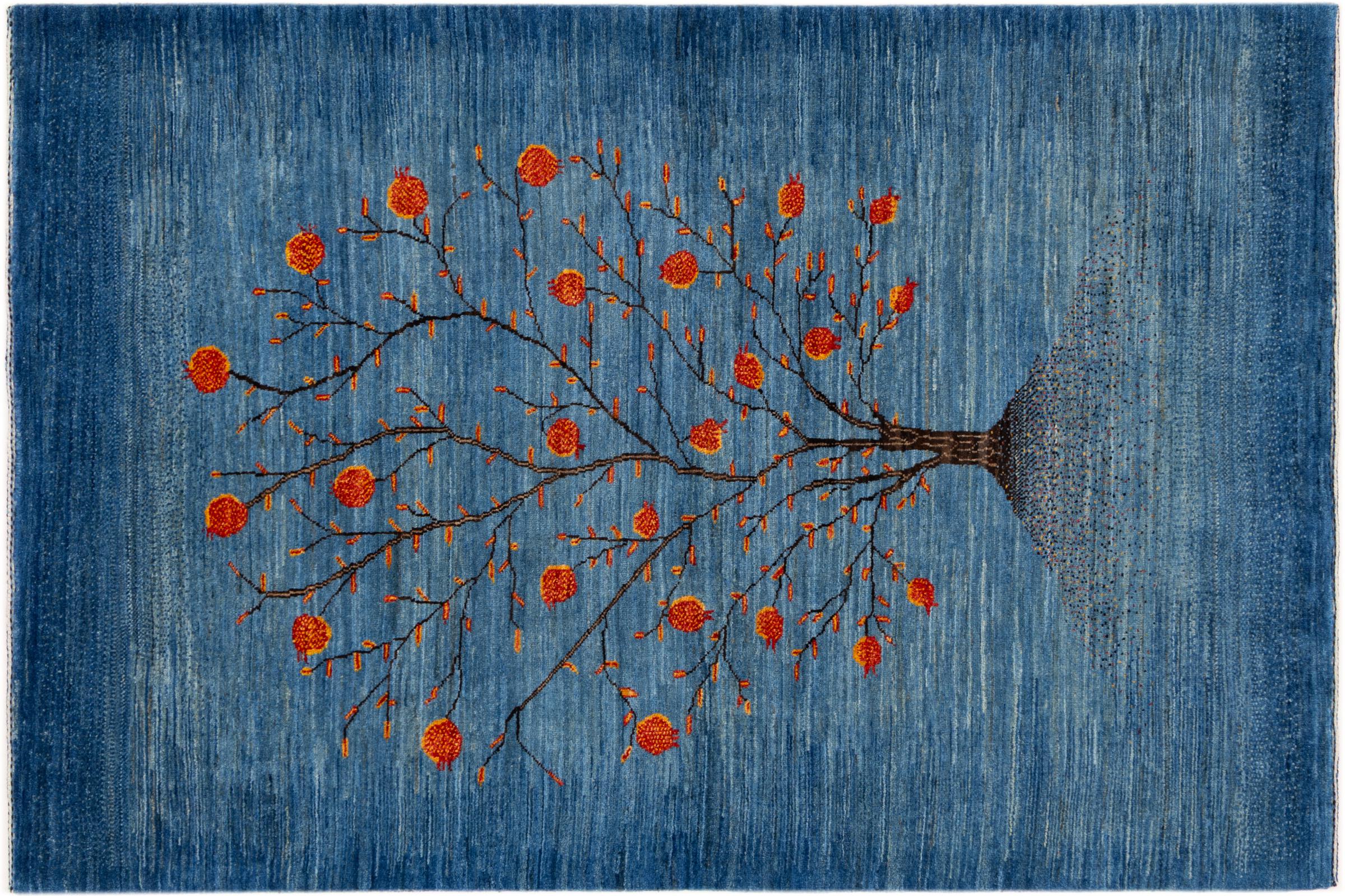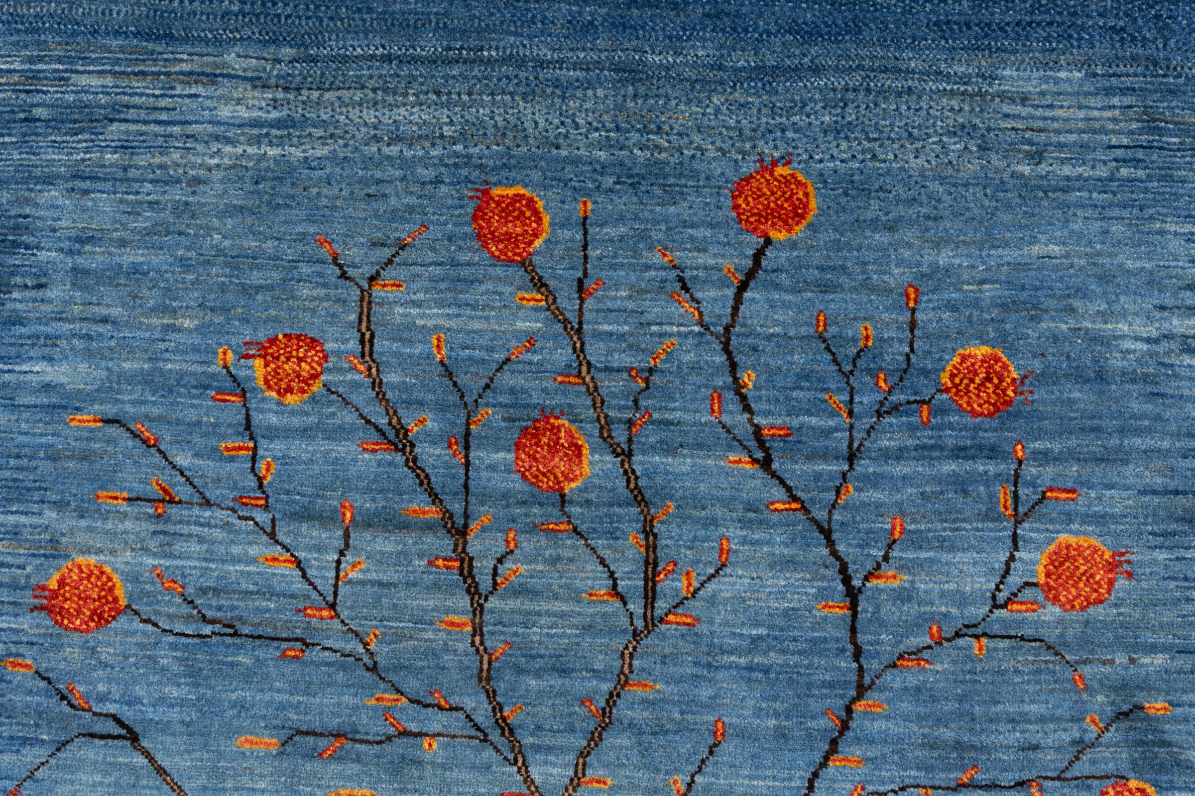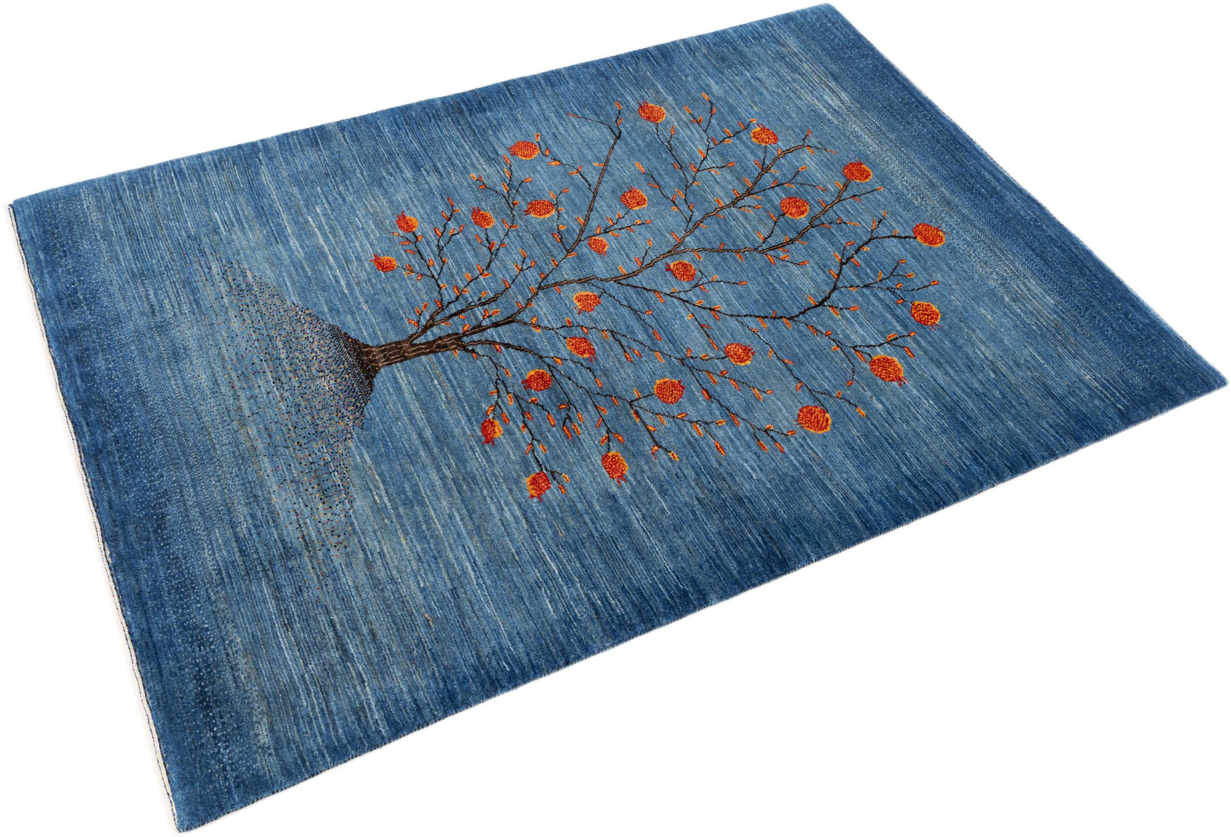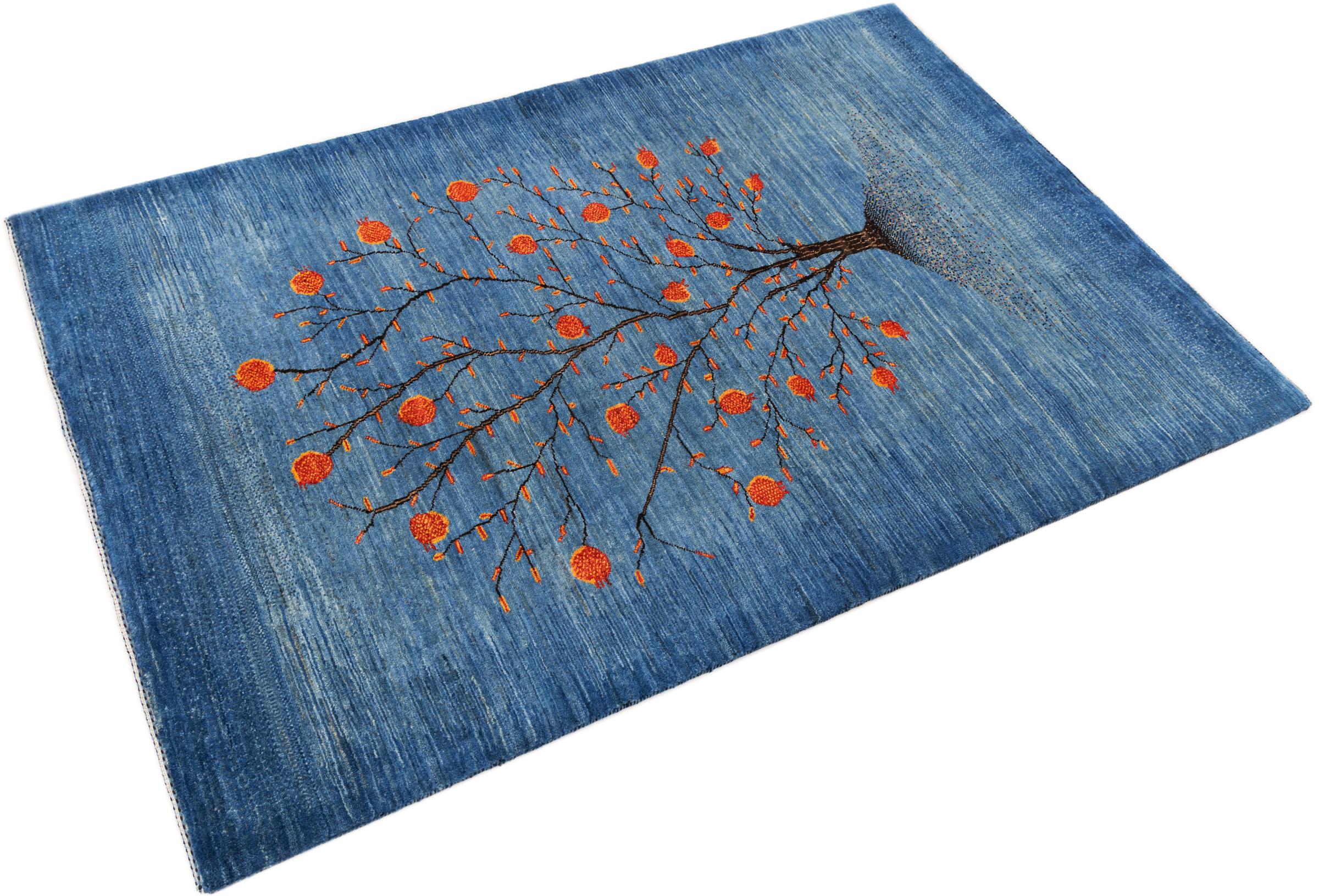 This beautiful rug is a Persian Gabbeh, one of the highest quality Gabbeh rugs available. These rugs are hand-knotted by nomads or semi-nomads in Iran using traditional artisan techniques. The simple motifs and patterns are often inspired by the nomads' immediate surroundings, featuring elements like camels, trees, or bushes. Persian Gabbeh carpets are made from wool sourced from locally raised sheep herds, with the wool typically spun by hand. Thus each of these Oriental rugs thus embodies a unique character steeped in centuries-old culture.