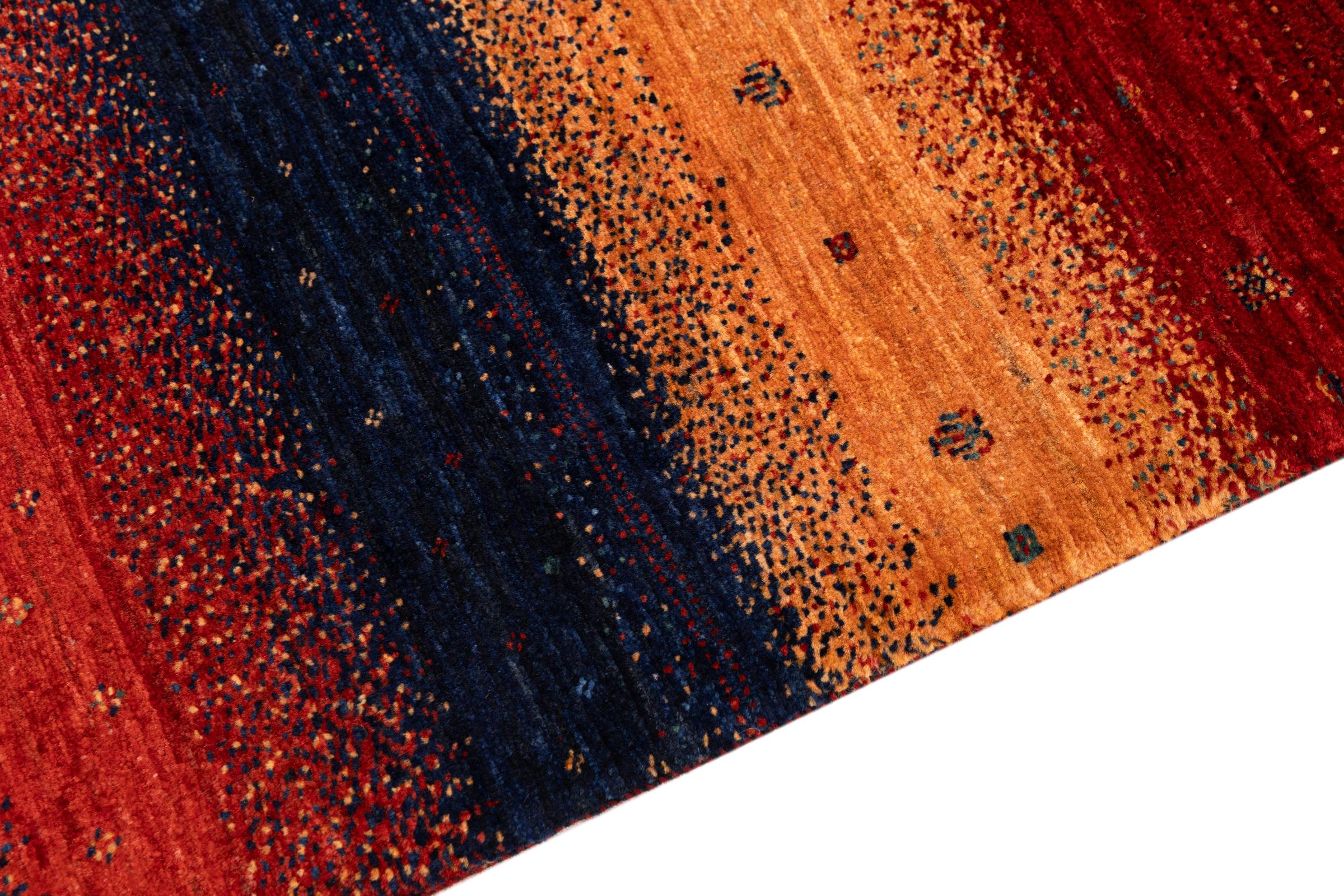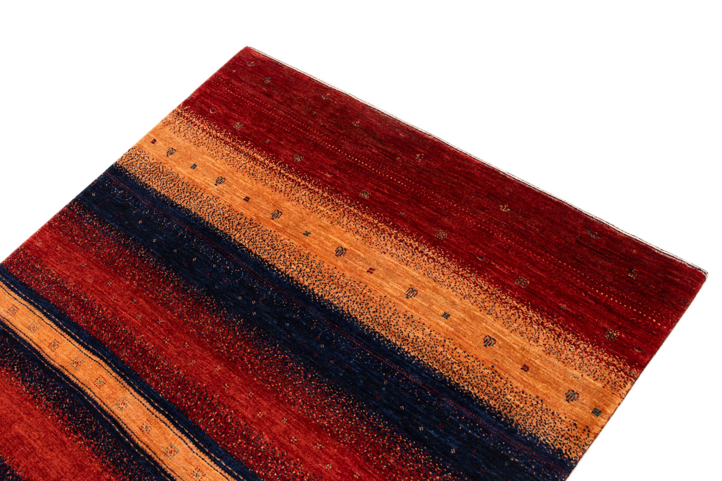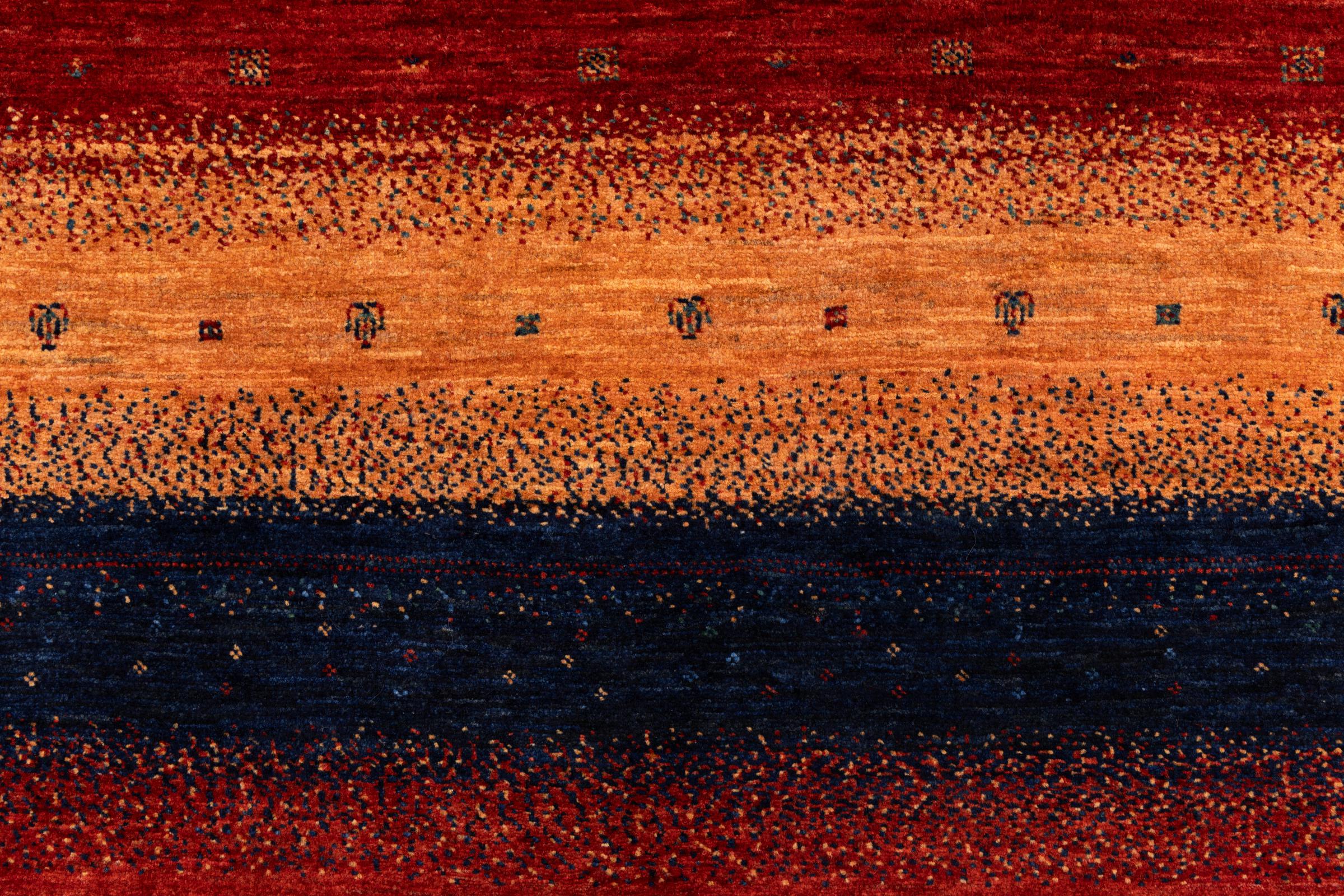 This beautiful rug is a Persian Gabbeh, one of the highest quality Gabbeh rugs available. These rugs are hand-knotted by nomads or semi-nomads in Iran using traditional artisan techniques. The simple motifs and patterns are often inspired by the nomads' immediate surroundings, featuring elements like camels, trees, or bushes. Persian Gabbeh carpets are made from wool sourced from locally raised sheep herds, with the wool typically spun by hand. Thus each of these Oriental rugs thus embodies a unique character steeped in centuries-old culture.
