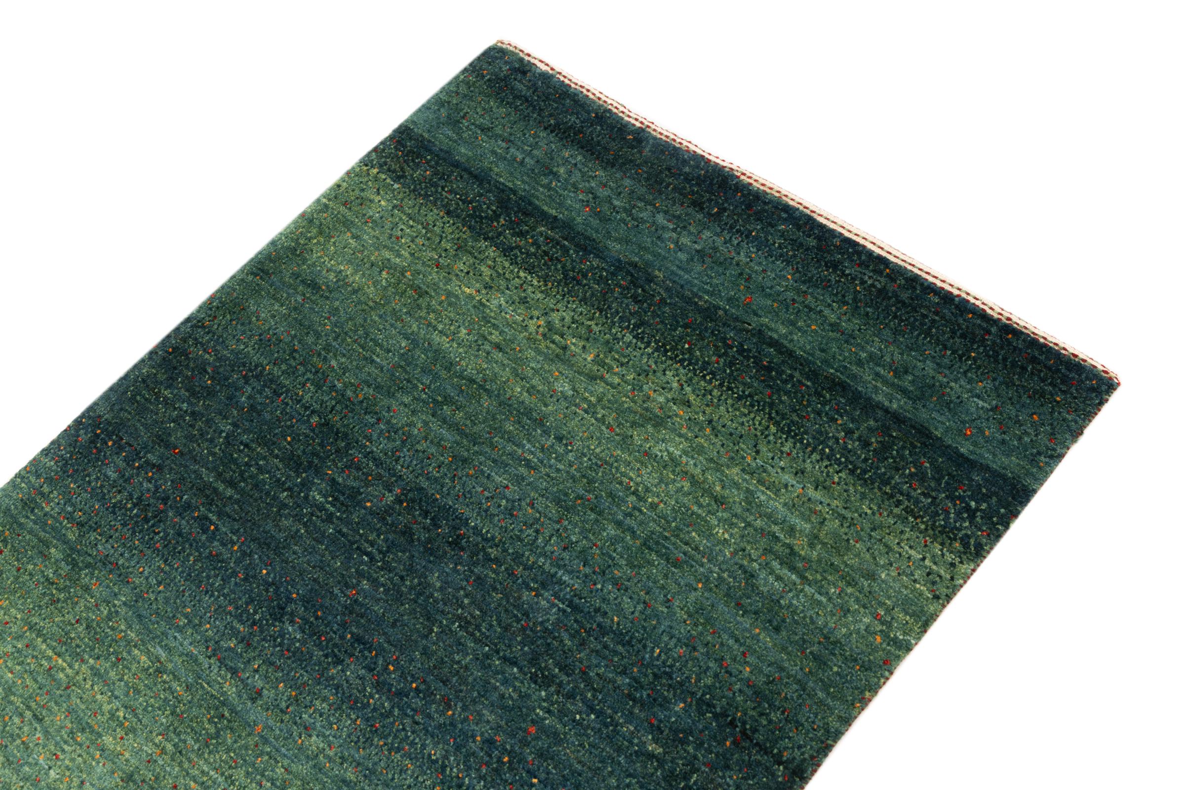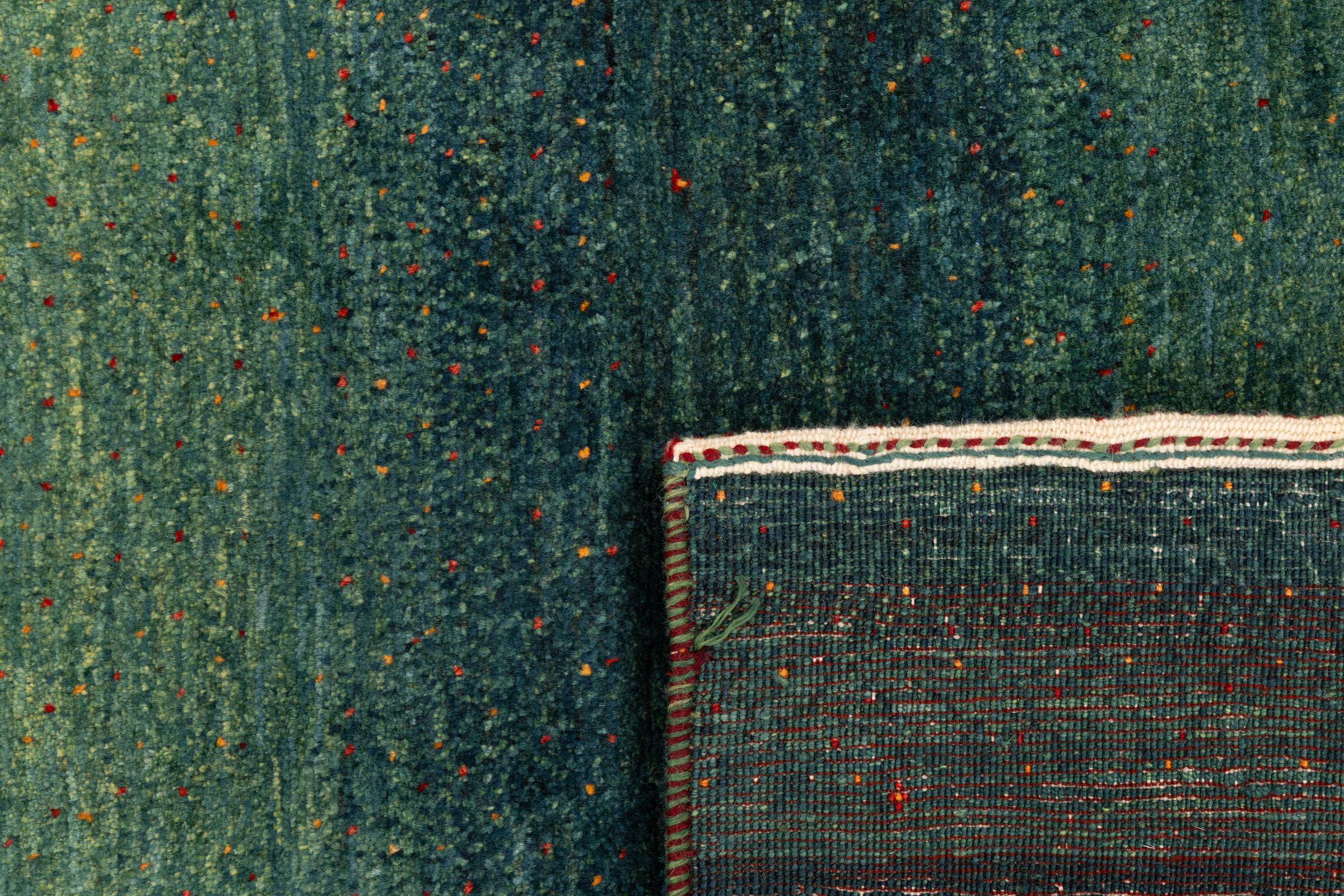 This beautiful rug is a Persian Gabbeh, one of the highest quality Gabbeh rugs available. These rugs are hand-knotted by nomads or semi-nomads in Iran using traditional artisan techniques. The simple motifs and patterns are often inspired by the nomads' immediate surroundings, featuring elements like camels, trees, or bushes. Persian Gabbeh carpets are made from wool sourced from locally raised sheep herds, with the wool typically spun by hand. Thus each of these Oriental rugs thus embodies a unique character steeped in centuries-old culture.