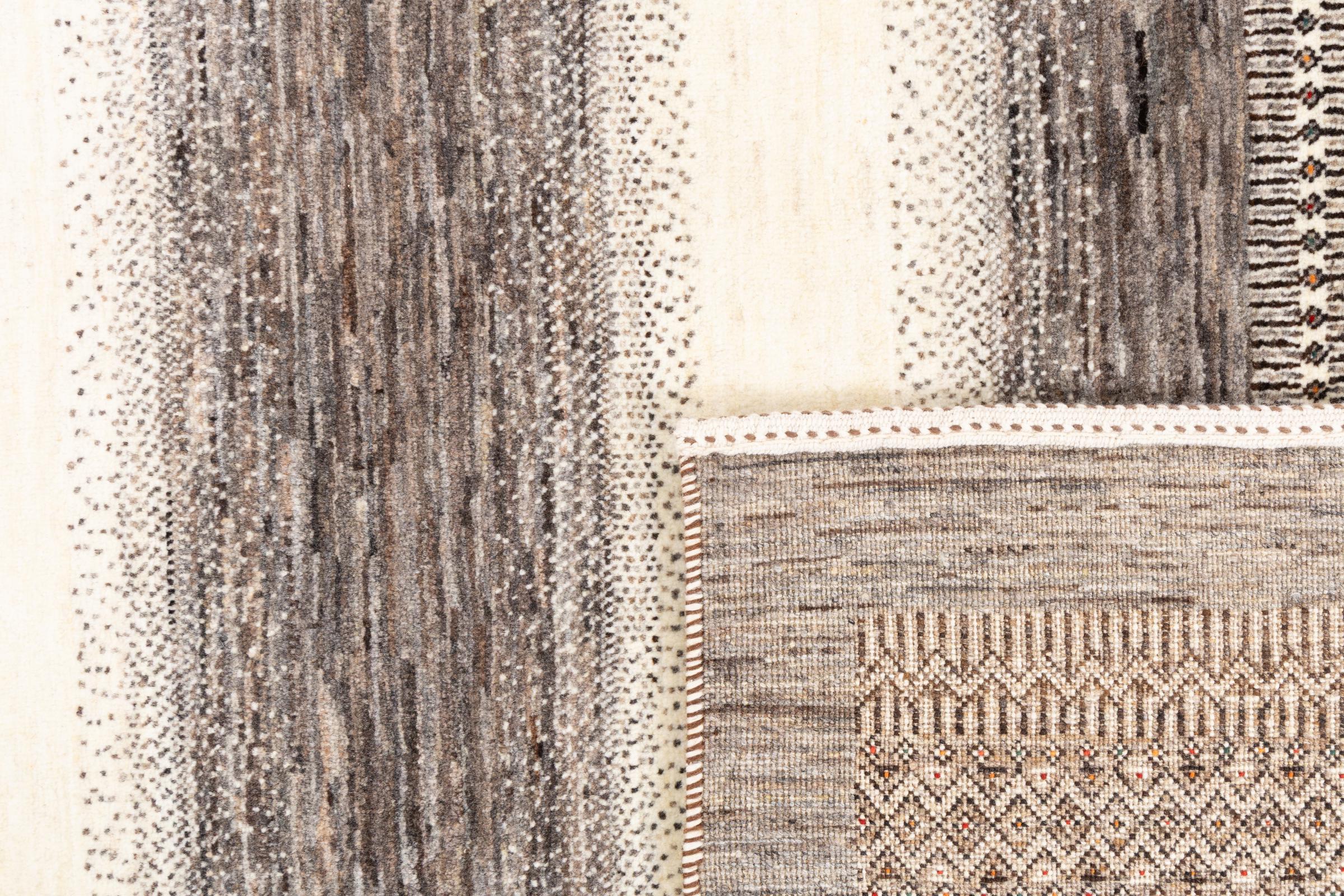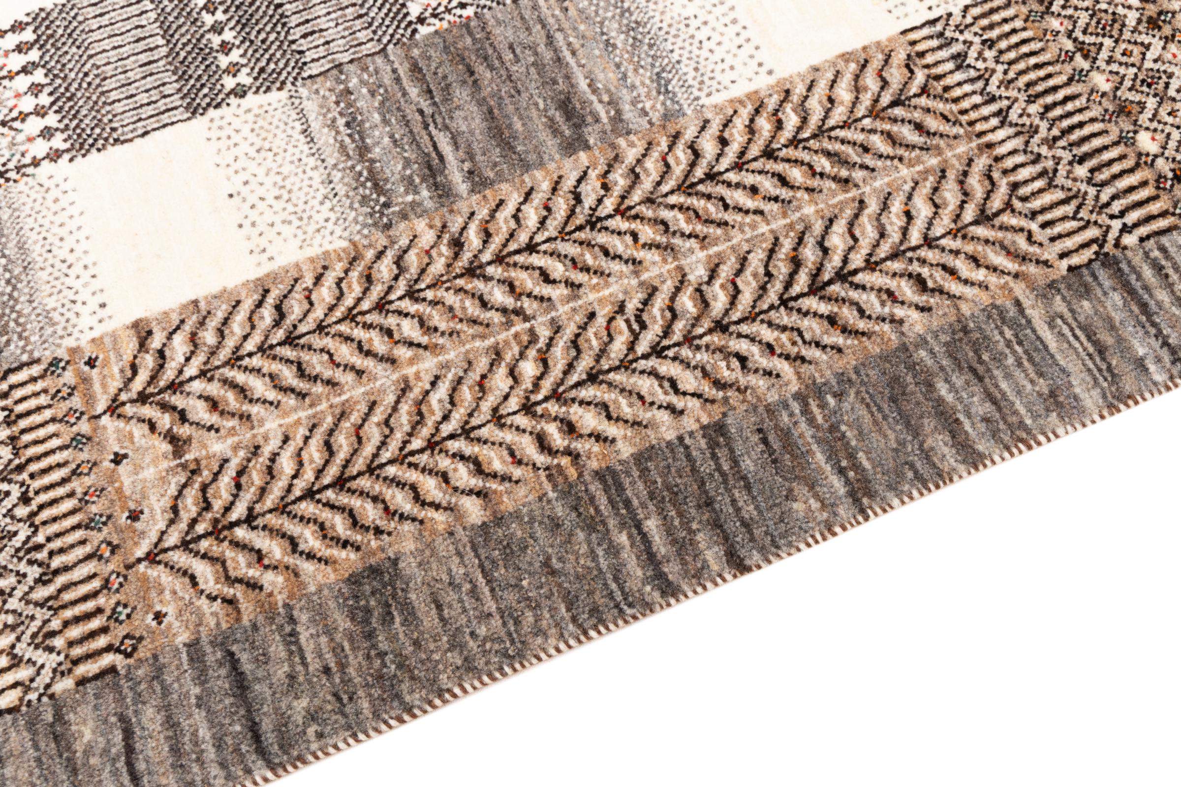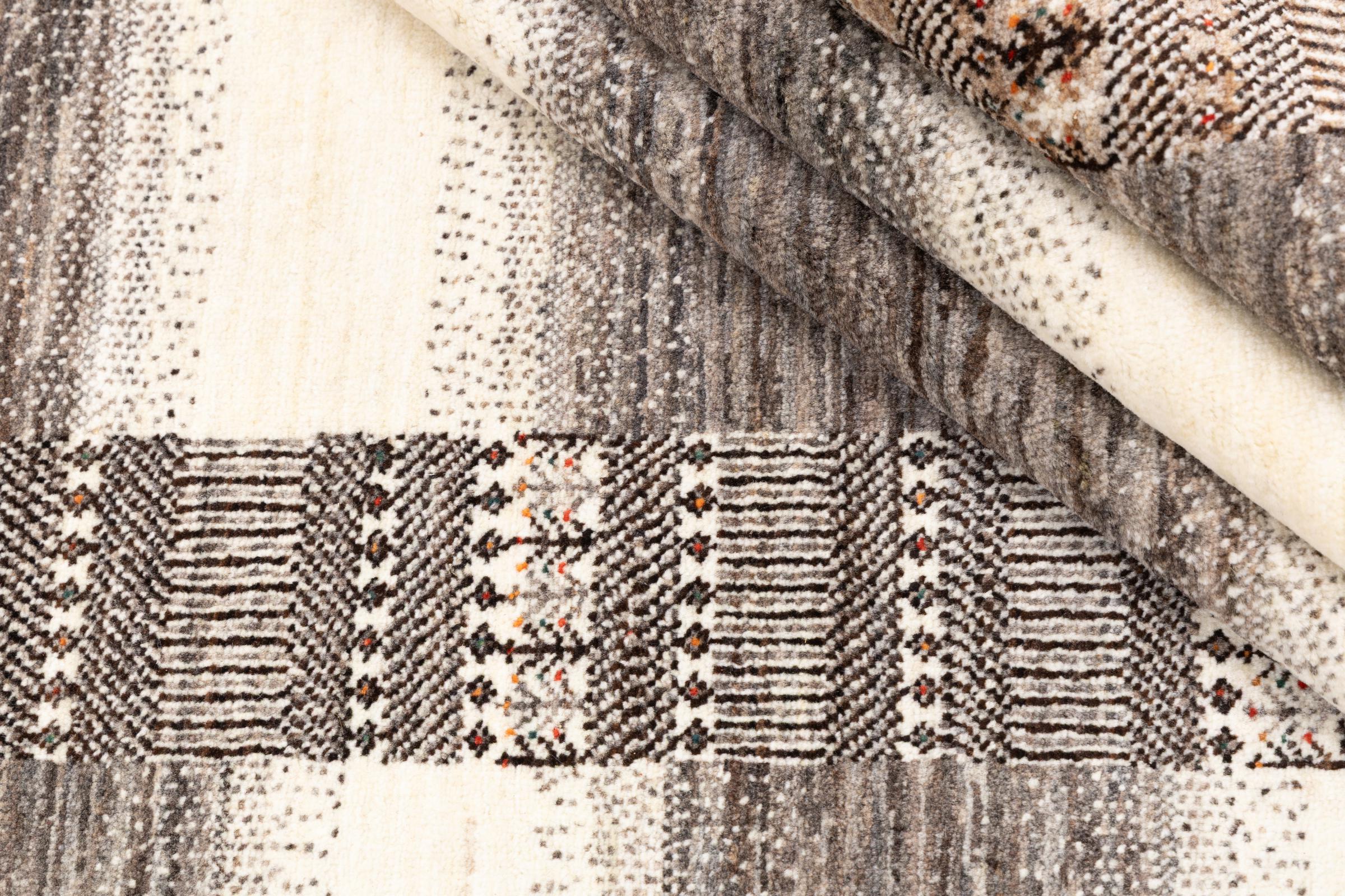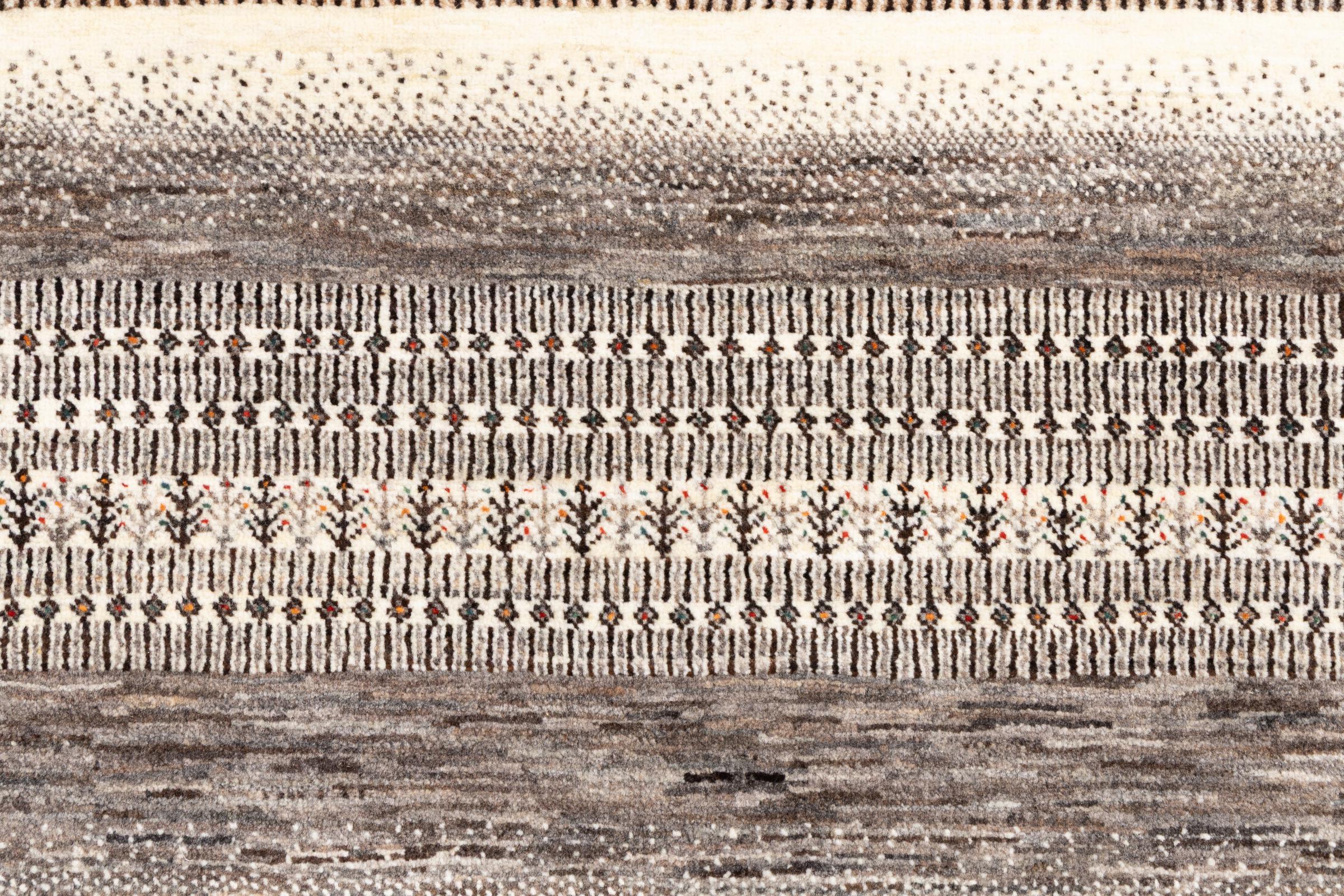 This beautiful rug is a Persian Gabbeh, one of the highest quality Gabbeh rugs available. These rugs are hand-knotted by nomads or semi-nomads in Iran using traditional artisan techniques. The simple motifs and patterns are often inspired by the nomads' immediate surroundings, featuring elements like camels, trees, or bushes. Persian Gabbeh carpets are made from wool sourced from locally raised sheep herds, with the wool typically spun by hand. Thus each of these Oriental rugs thus embodies a unique character steeped in centuries-old culture.