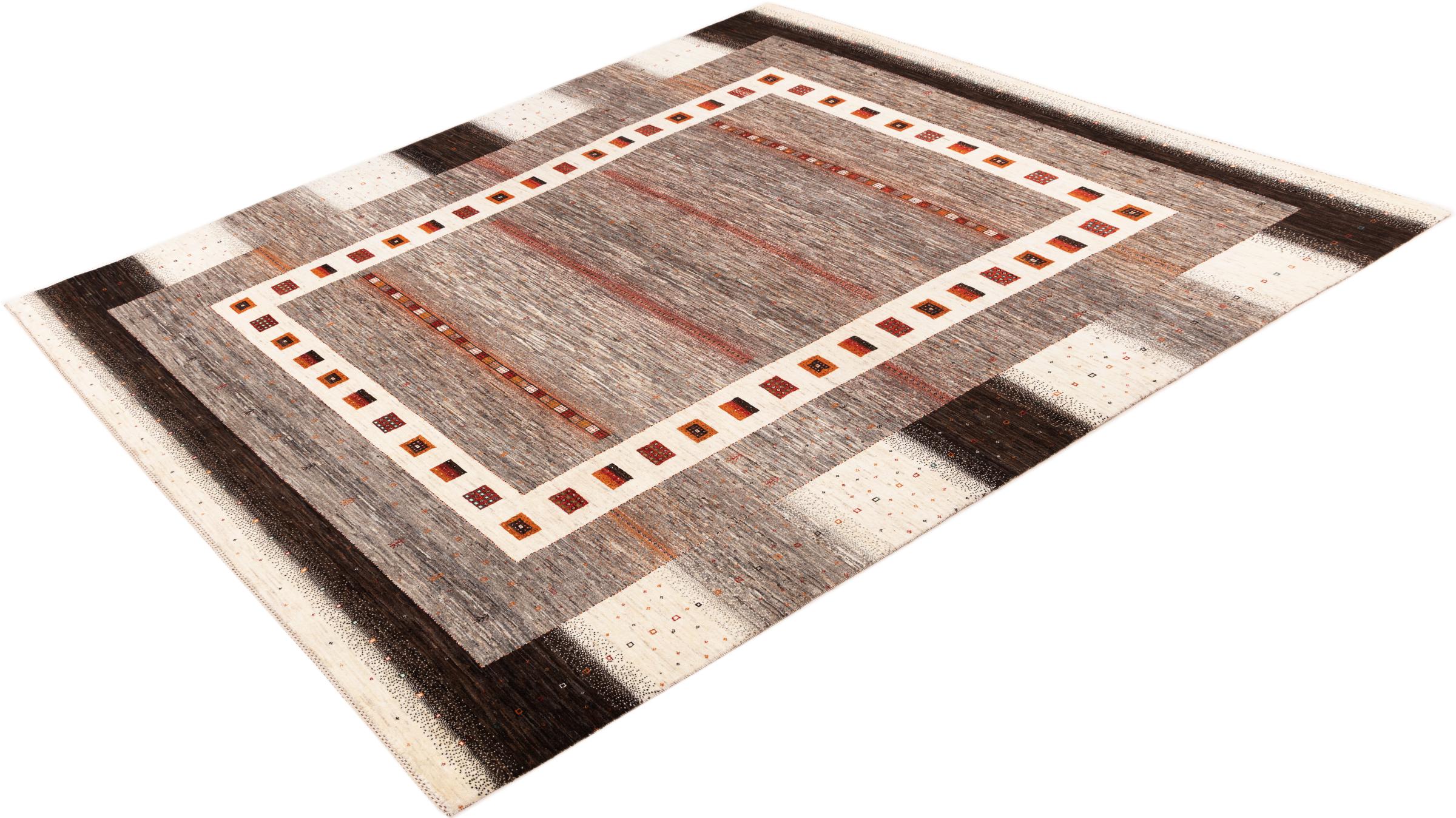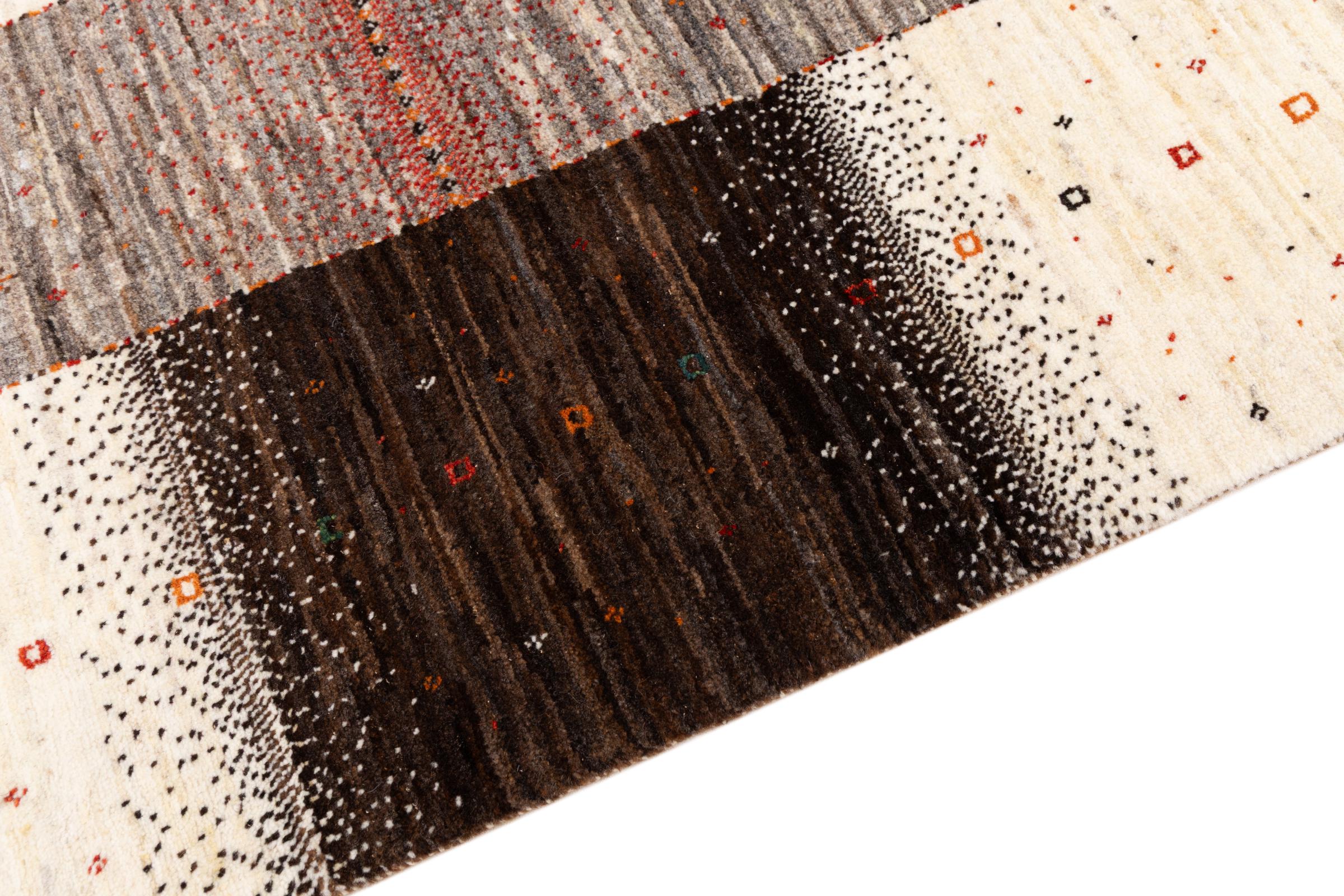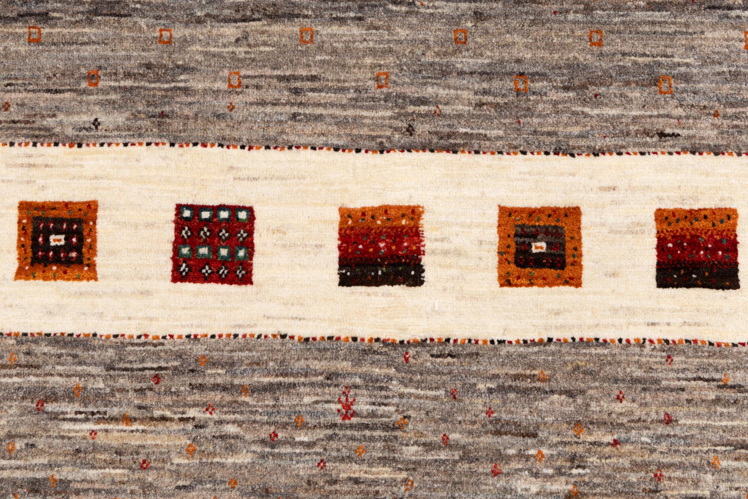 This beautiful rug is a Persian Gabbeh, one of the highest quality Gabbeh rugs available. These rugs are hand-knotted by nomads or semi-nomads in Iran using traditional artisan techniques. The simple motifs and patterns are often inspired by the nomads' immediate surroundings, featuring elements like camels, trees, or bushes. Persian Gabbeh carpets are made from wool sourced from locally raised sheep herds, with the wool typically spun by hand. Thus each of these Oriental rugs thus embodies a unique character steeped in centuries-old culture.