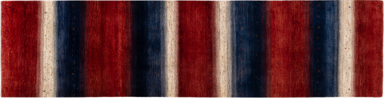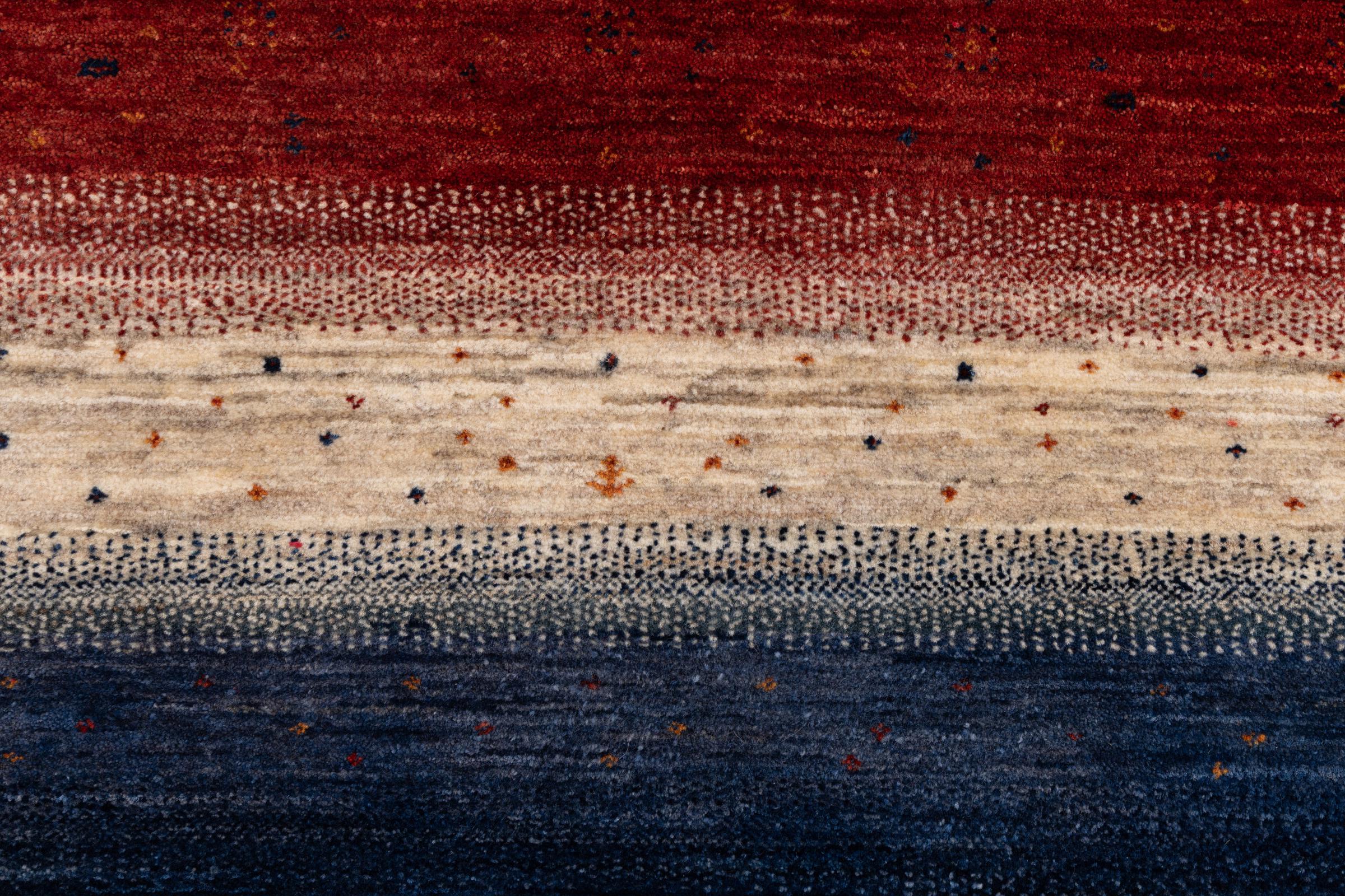 This beautiful rug is a Persian Gabbeh, one of the highest quality Gabbeh rugs available. These rugs are hand-knotted by nomads or semi-nomads in Iran using traditional artisan techniques. The simple motifs and patterns are often inspired by the nomads' immediate surroundings, featuring elements like camels, trees, or bushes. Persian Gabbeh carpets are made from wool sourced from locally raised sheep herds, with the wool typically spun by hand. Thus each of these Oriental rugs thus embodies a unique character steeped in centuries-old culture.