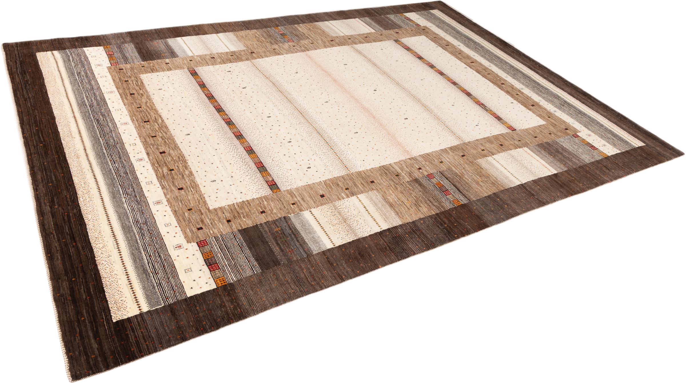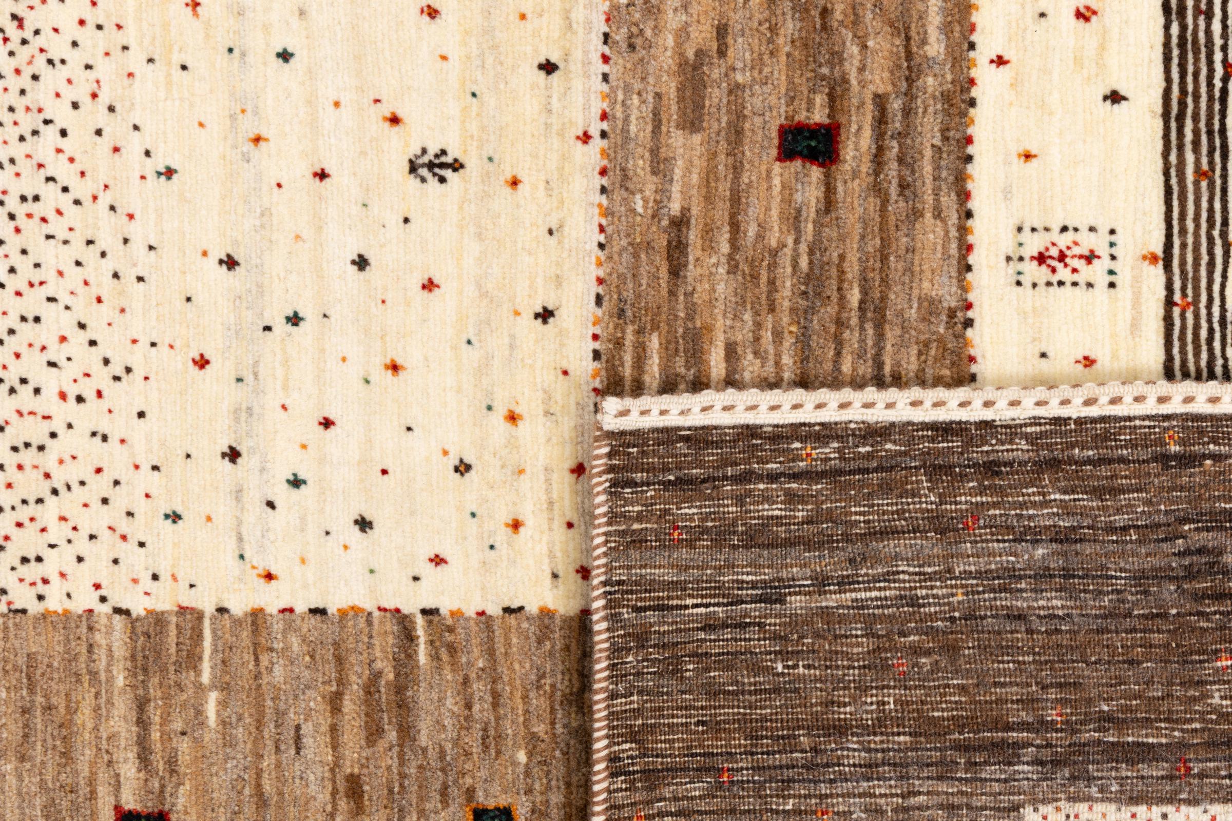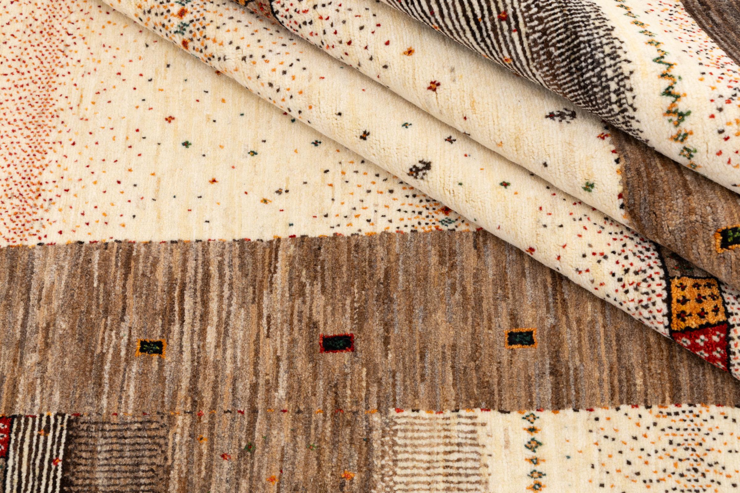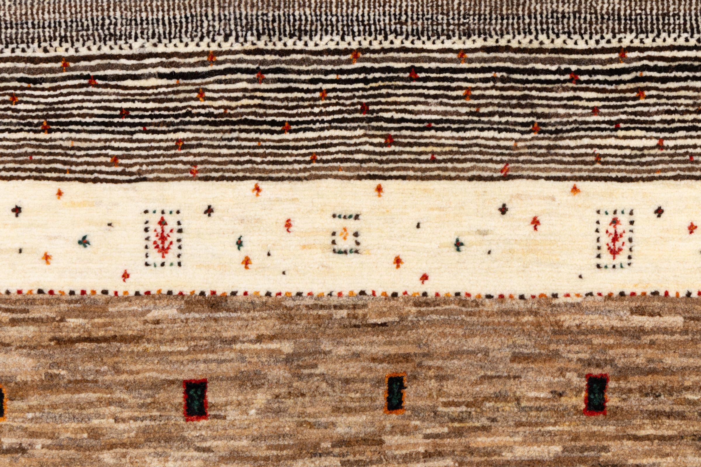This beautiful rug is a Persian Gabbeh, one of the highest quality Gabbeh rugs available. These rugs are hand-knotted by nomads or semi-nomads in Iran using traditional artisan techniques. The simple motifs and patterns are often inspired by the nomads' immediate surroundings, featuring elements like camels, trees, or bushes. Persian Gabbeh carpets are made from wool sourced from locally raised sheep herds, with the wool typically spun by hand. Thus each of these Oriental rugs thus embodies a unique character steeped in centuries-old culture.