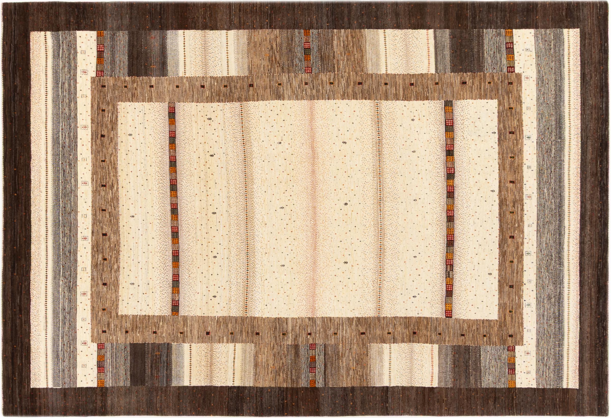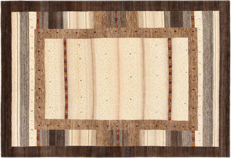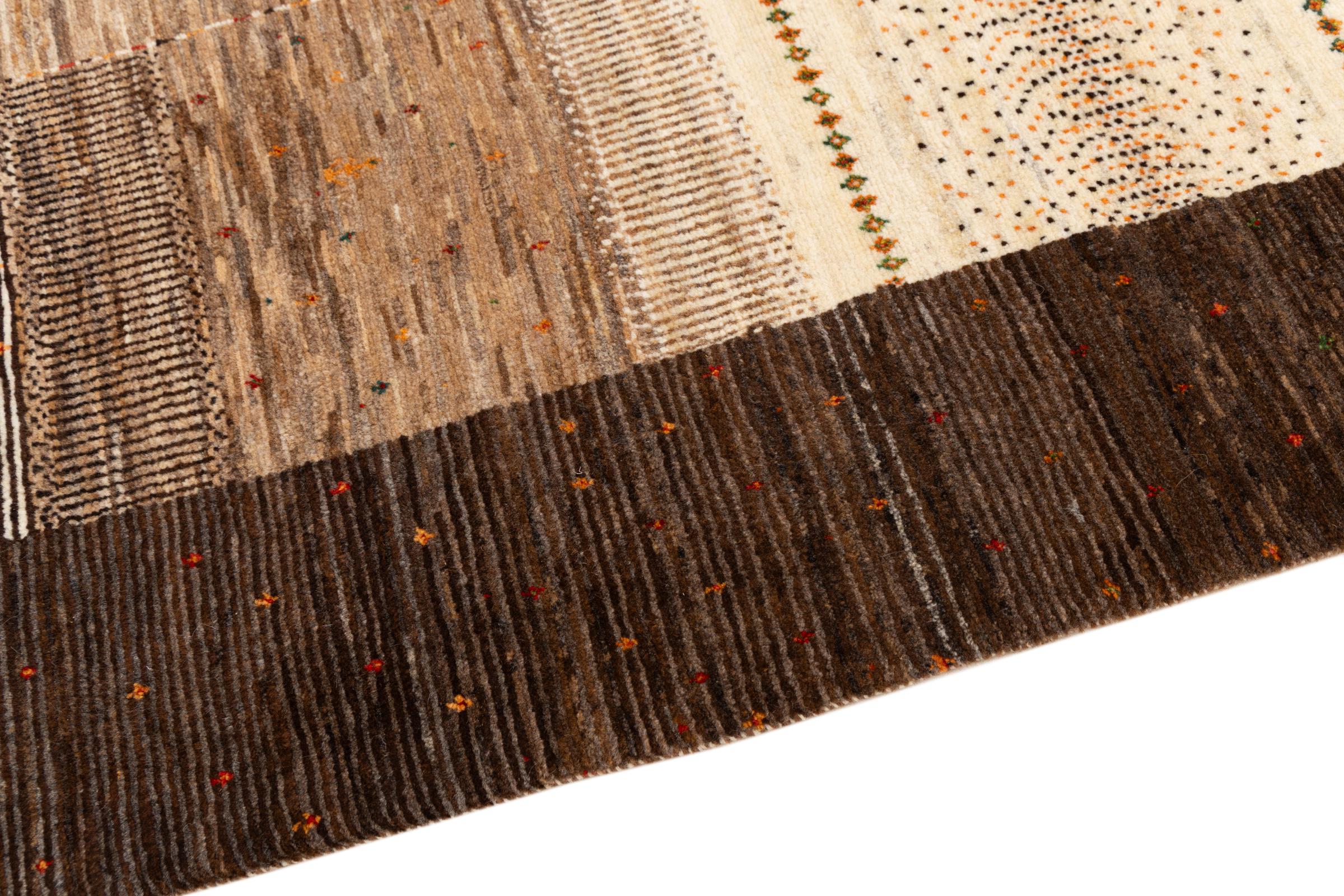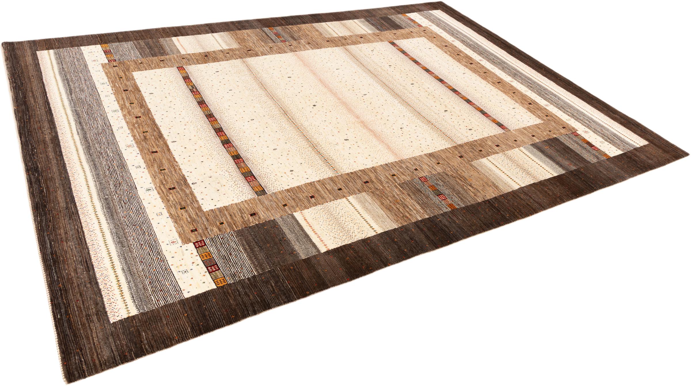 This beautiful rug is a Persian Gabbeh, one of the highest quality Gabbeh rugs available. These rugs are hand-knotted by nomads or semi-nomads in Iran using traditional artisan techniques. The simple motifs and patterns are often inspired by the nomads' immediate surroundings, featuring elements like camels, trees, or bushes. Persian Gabbeh carpets are made from wool sourced from locally raised sheep herds, with the wool typically spun by hand. Thus each of these Oriental rugs thus embodies a unique character steeped in centuries-old culture.