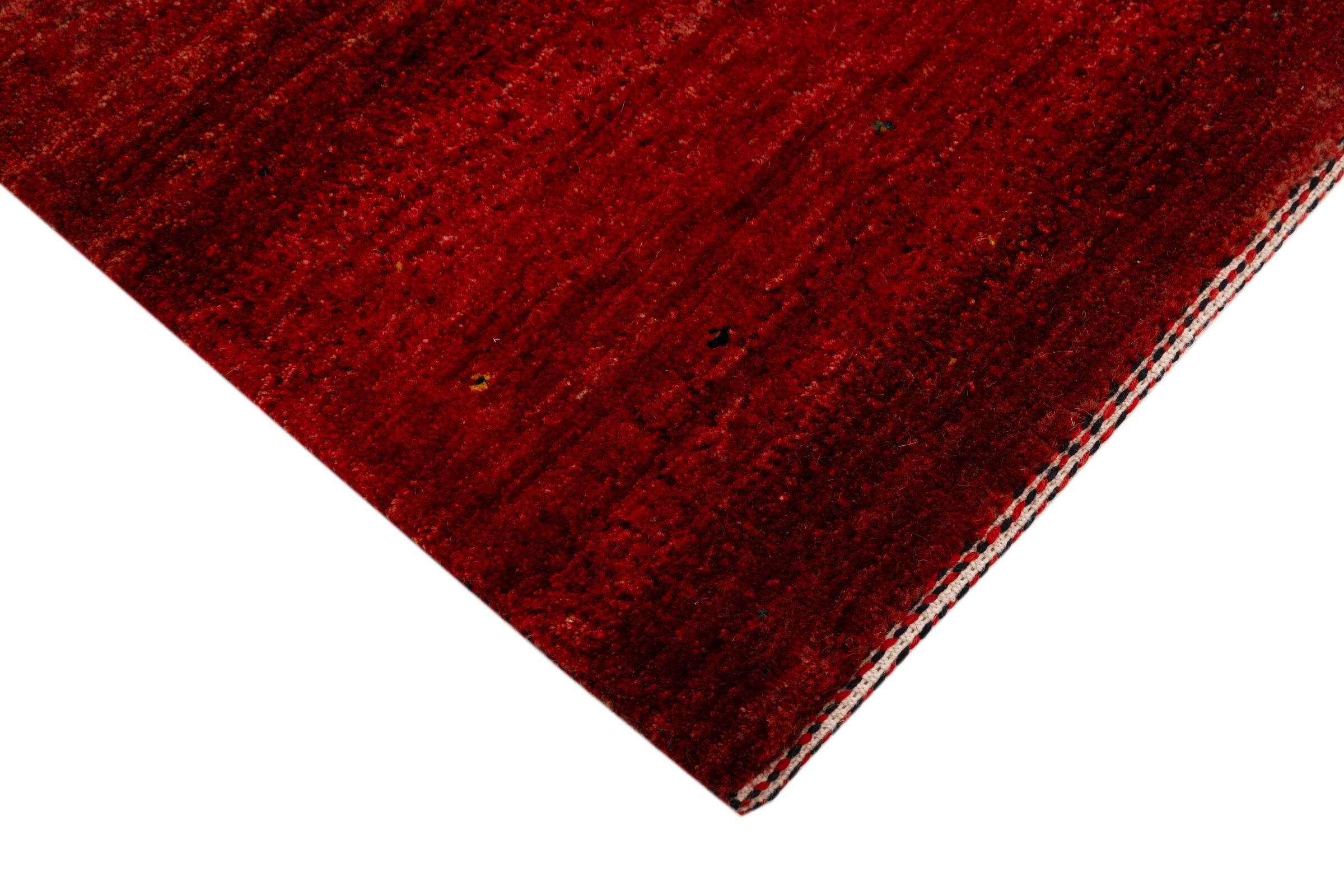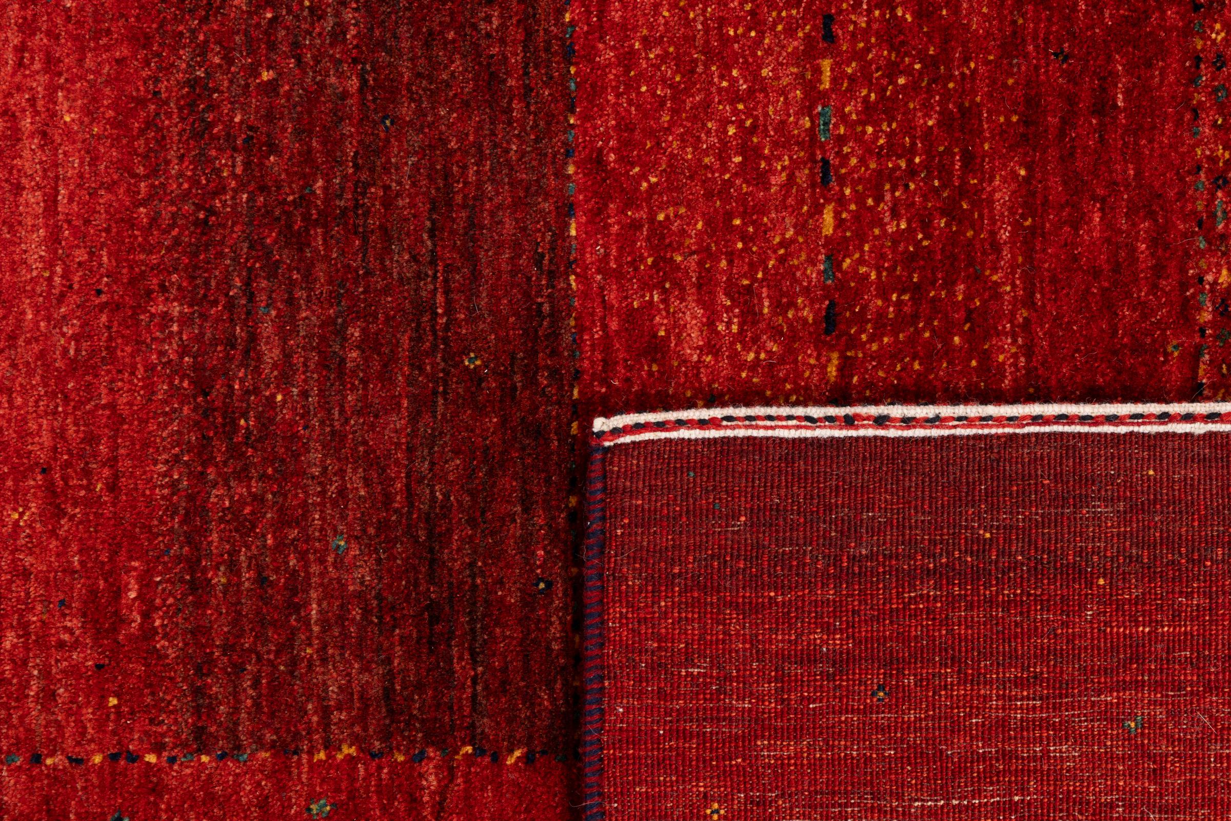 This beautiful rug is a Persian Gabbeh, one of the highest quality Gabbeh rugs available. These rugs are hand-knotted by nomads or semi-nomads in Iran using traditional artisan techniques. The simple motifs and patterns are often inspired by the nomads' immediate surroundings, featuring elements like camels, trees, or bushes. Persian Gabbeh carpets are made from wool sourced from locally raised sheep herds, with the wool typically spun by hand. Thus each of these Oriental rugs thus embodies a unique character steeped in centuries-old culture.