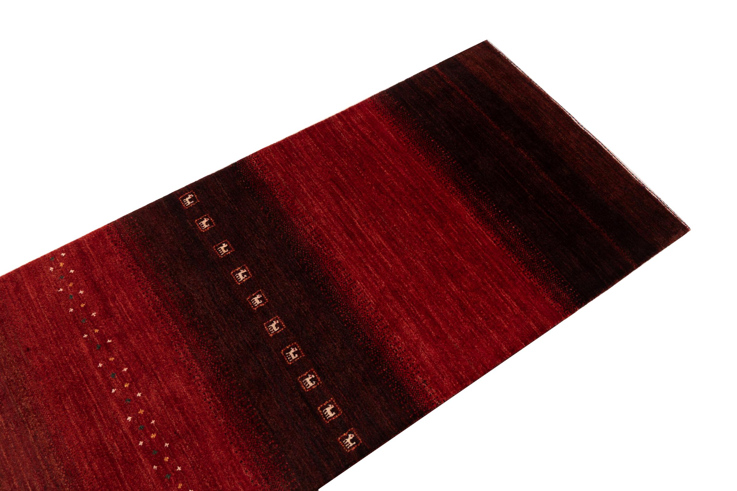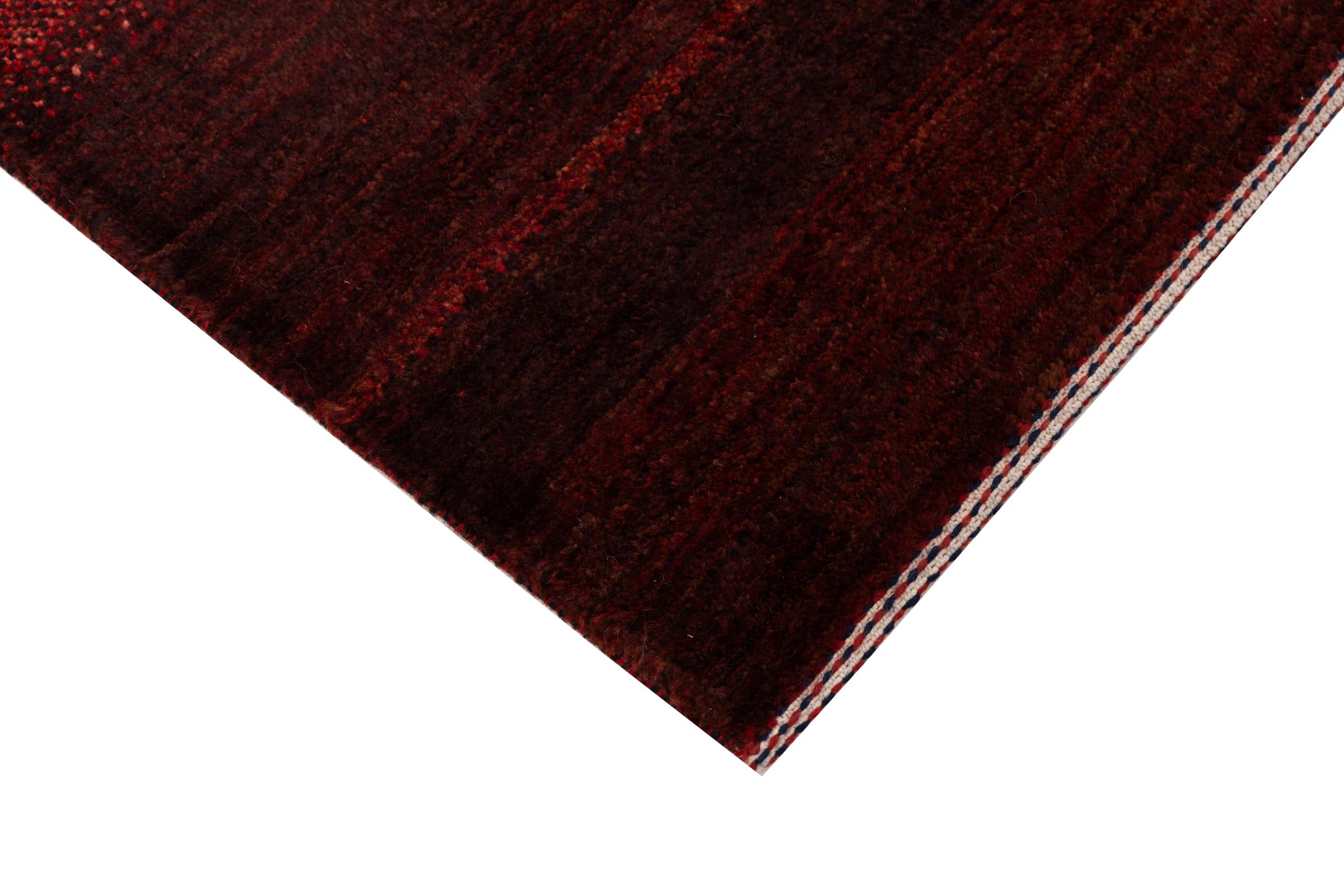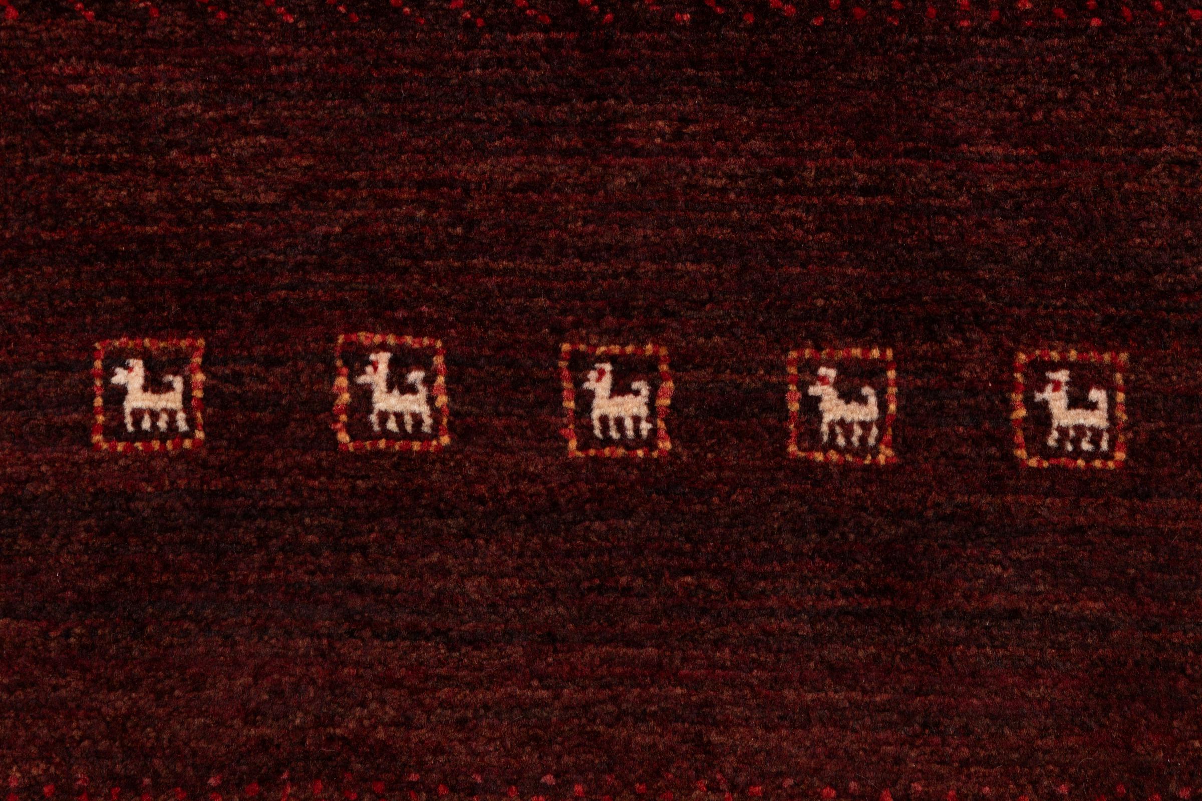 This beautiful rug is a Persian Gabbeh, one of the highest quality Gabbeh rugs available. These rugs are hand-knotted by nomads or semi-nomads in Iran using traditional artisan techniques. The simple motifs and patterns are often inspired by the nomads' immediate surroundings, featuring elements like camels, trees, or bushes. Persian Gabbeh carpets are made from wool sourced from locally raised sheep herds, with the wool typically spun by hand. Thus each of these Oriental rugs thus embodies a unique character steeped in centuries-old culture.