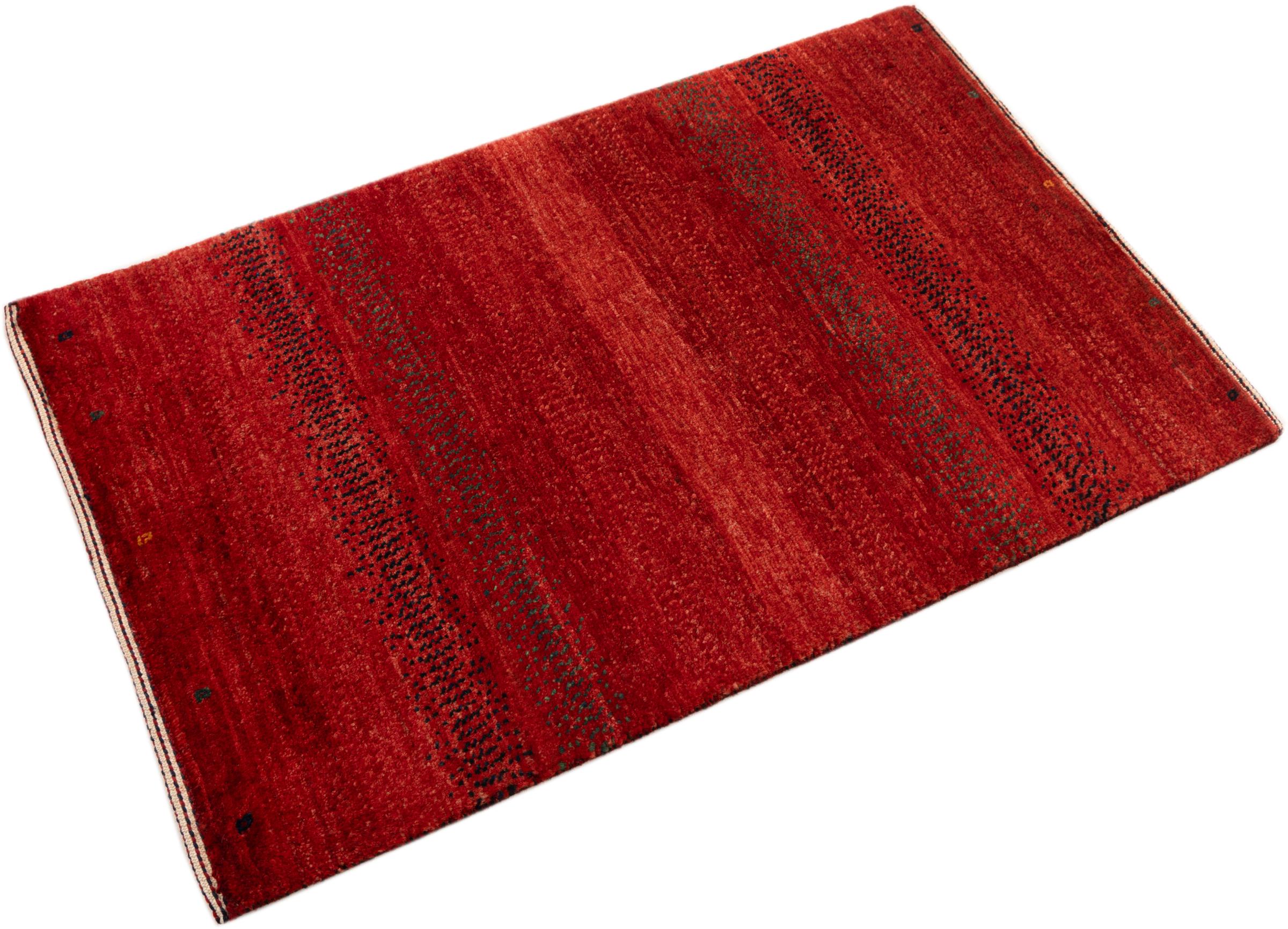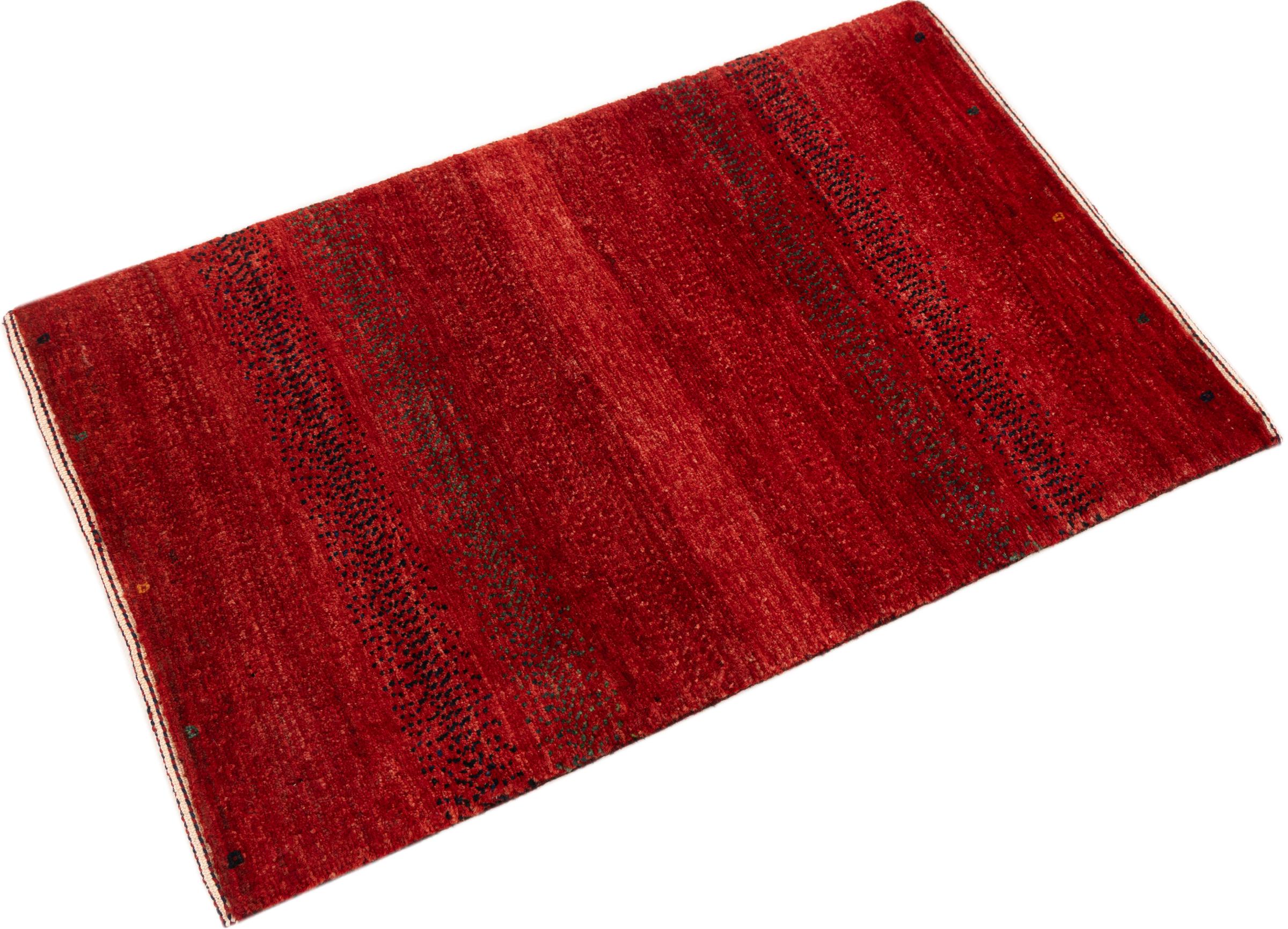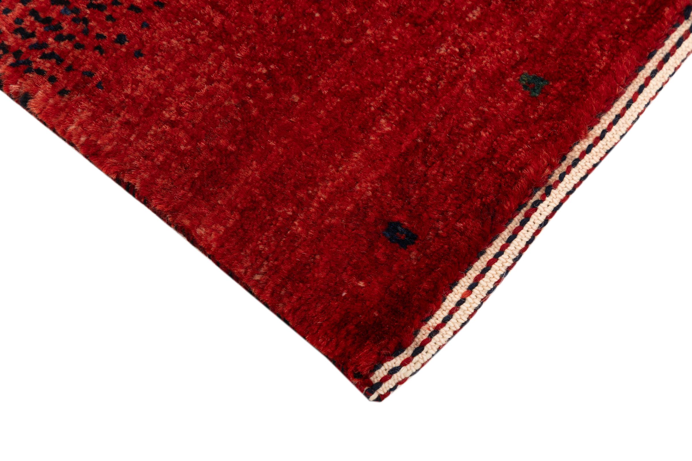 This beautiful rug is a Persian Gabbeh, one of the highest quality Gabbeh rugs available. These rugs are hand-knotted by nomads or semi-nomads in Iran using traditional artisan techniques. The simple motifs and patterns are often inspired by the nomads' immediate surroundings, featuring elements like camels, trees, or bushes. Persian Gabbeh carpets are made from wool sourced from locally raised sheep herds, with the wool typically spun by hand. Thus each of these Oriental rugs thus embodies a unique character steeped in centuries-old culture.