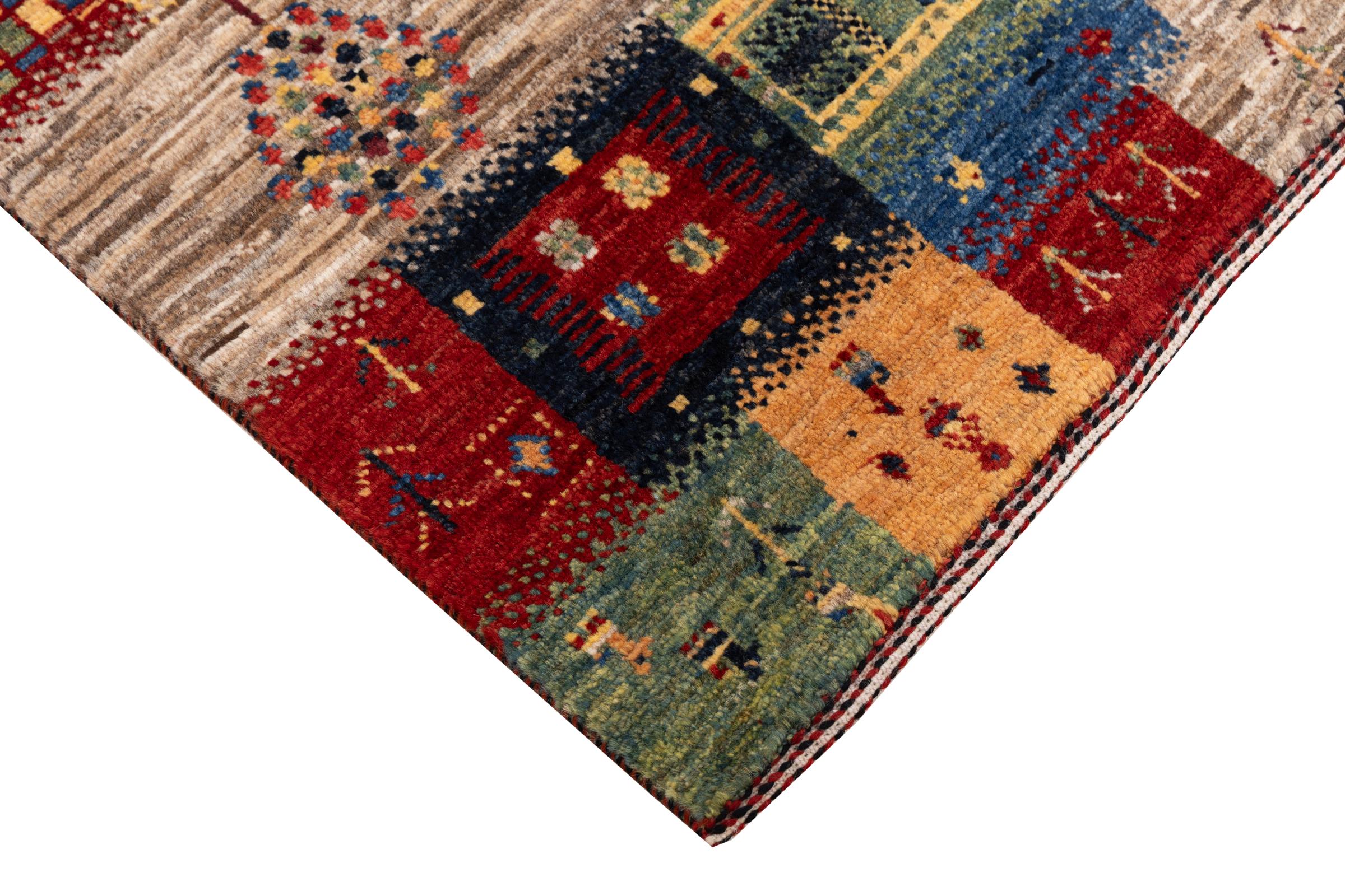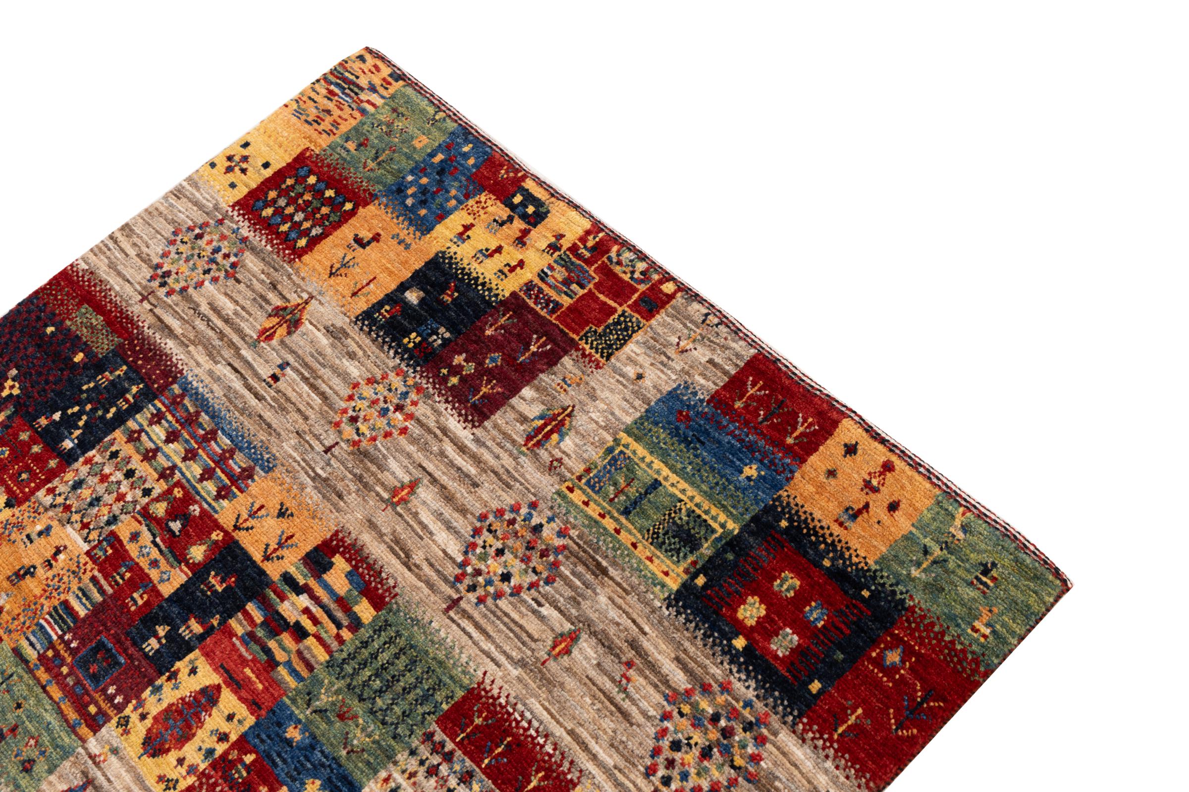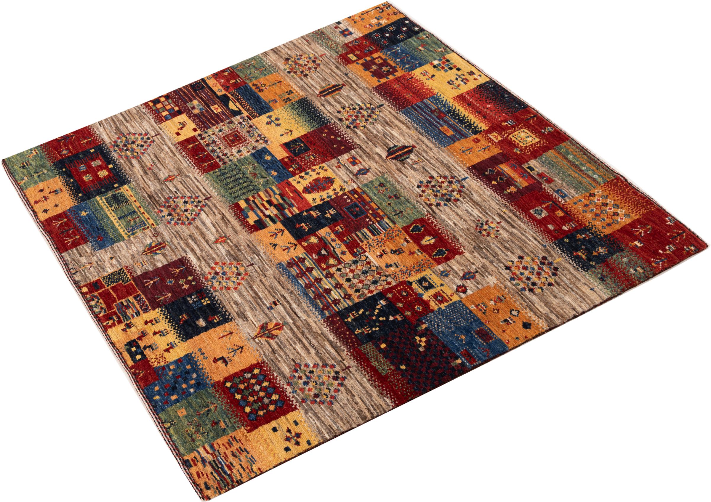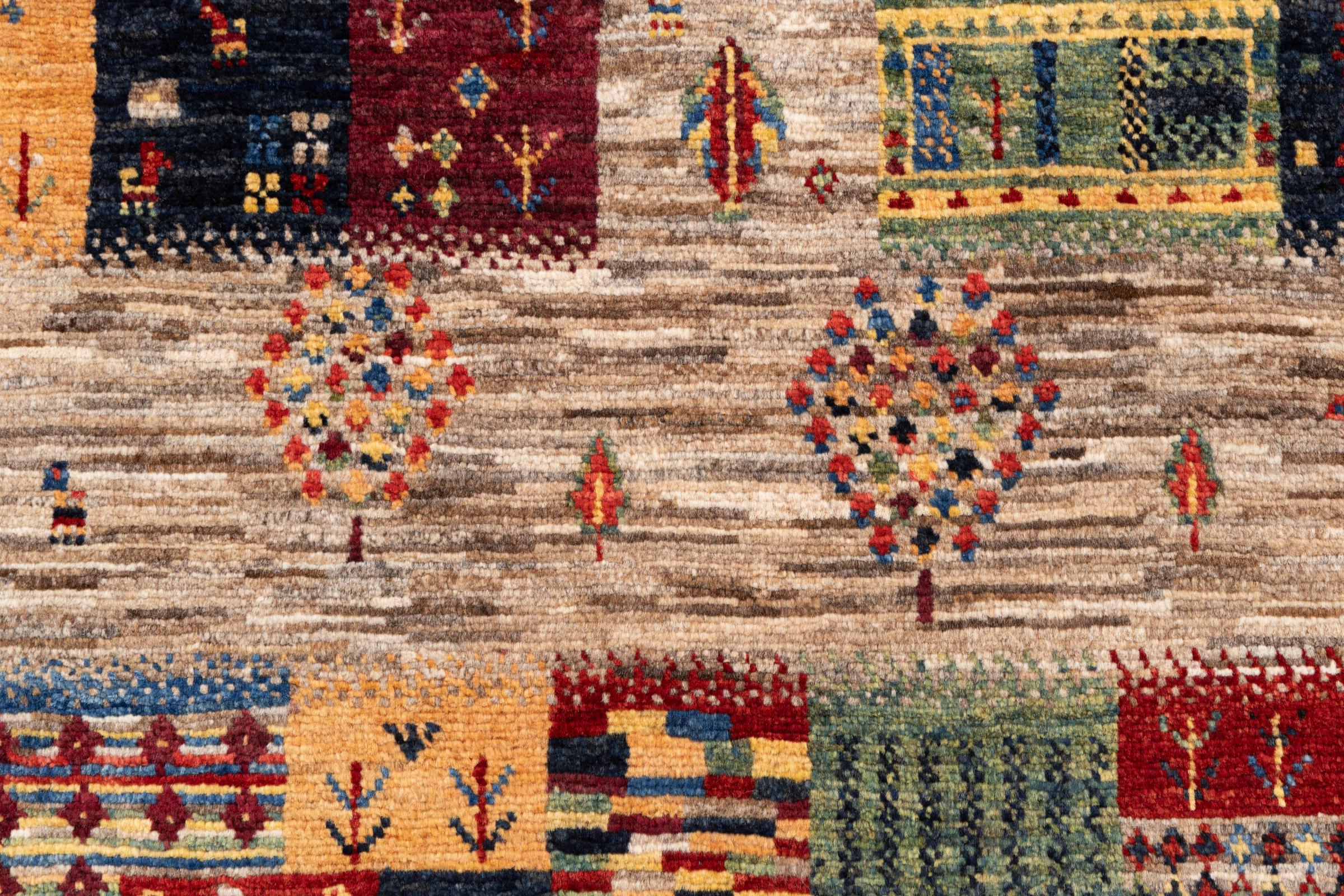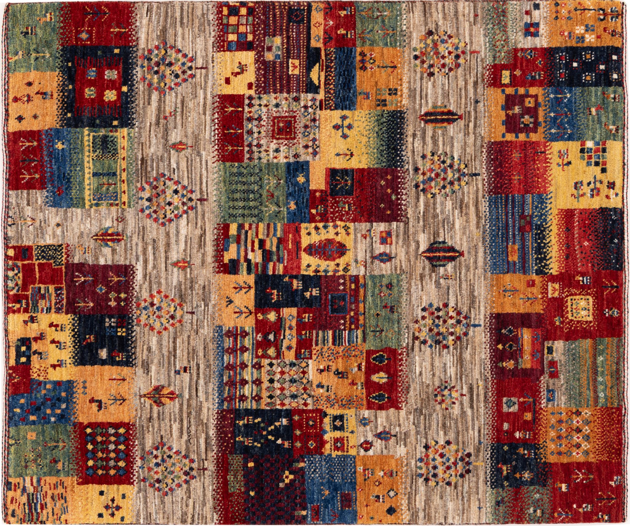 This beautiful rug is a Persian Gabbeh, one of the highest quality Gabbeh rugs available. These rugs are hand-knotted by nomads or semi-nomads in Iran using traditional artisan techniques. The simple motifs and patterns are often inspired by the nomads' immediate surroundings, featuring elements like camels, trees, or bushes. Persian Gabbeh carpets are made from wool sourced from locally raised sheep herds, with the wool typically spun by hand. Thus each of these Oriental rugs thus embodies a unique character steeped in centuries-old culture.