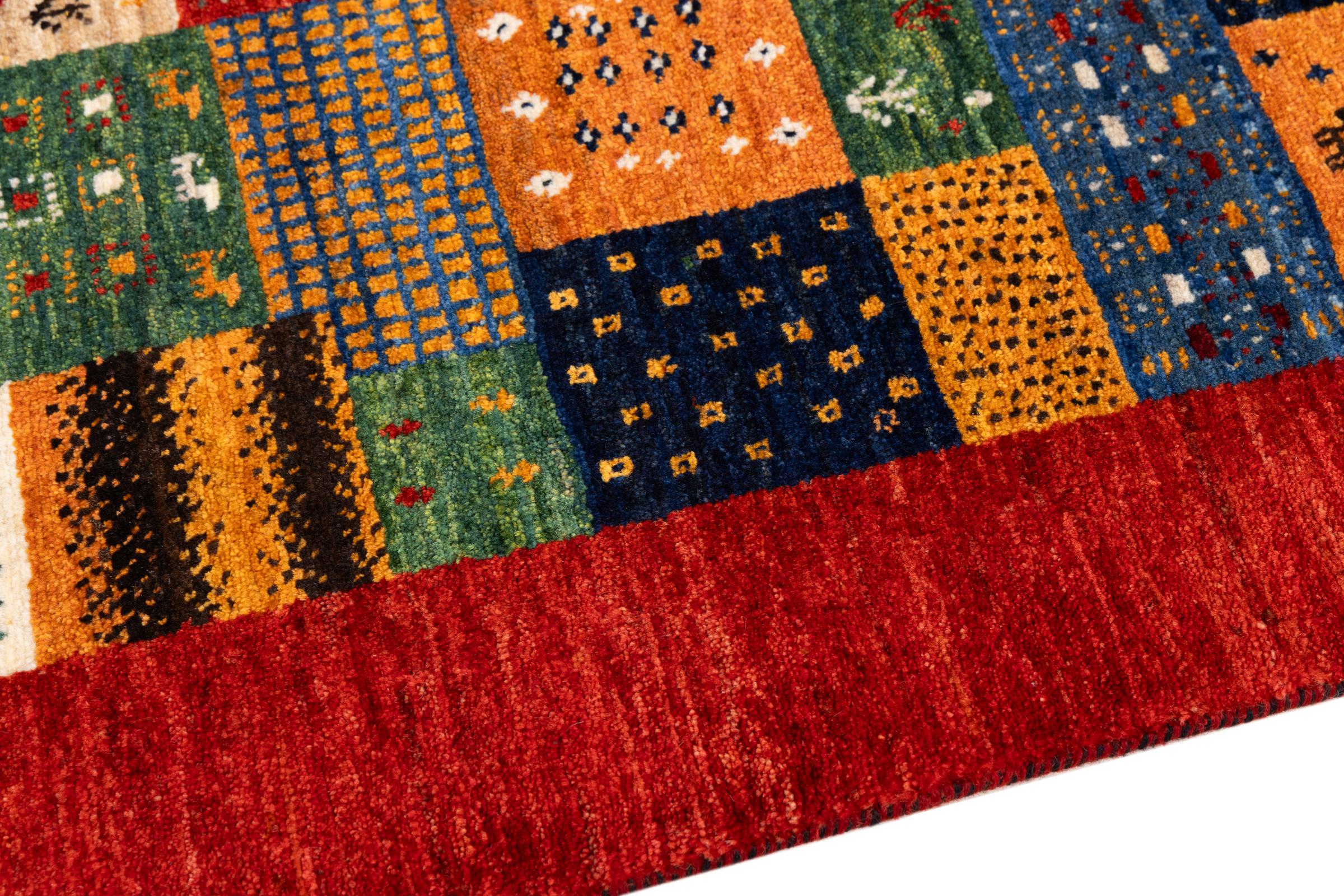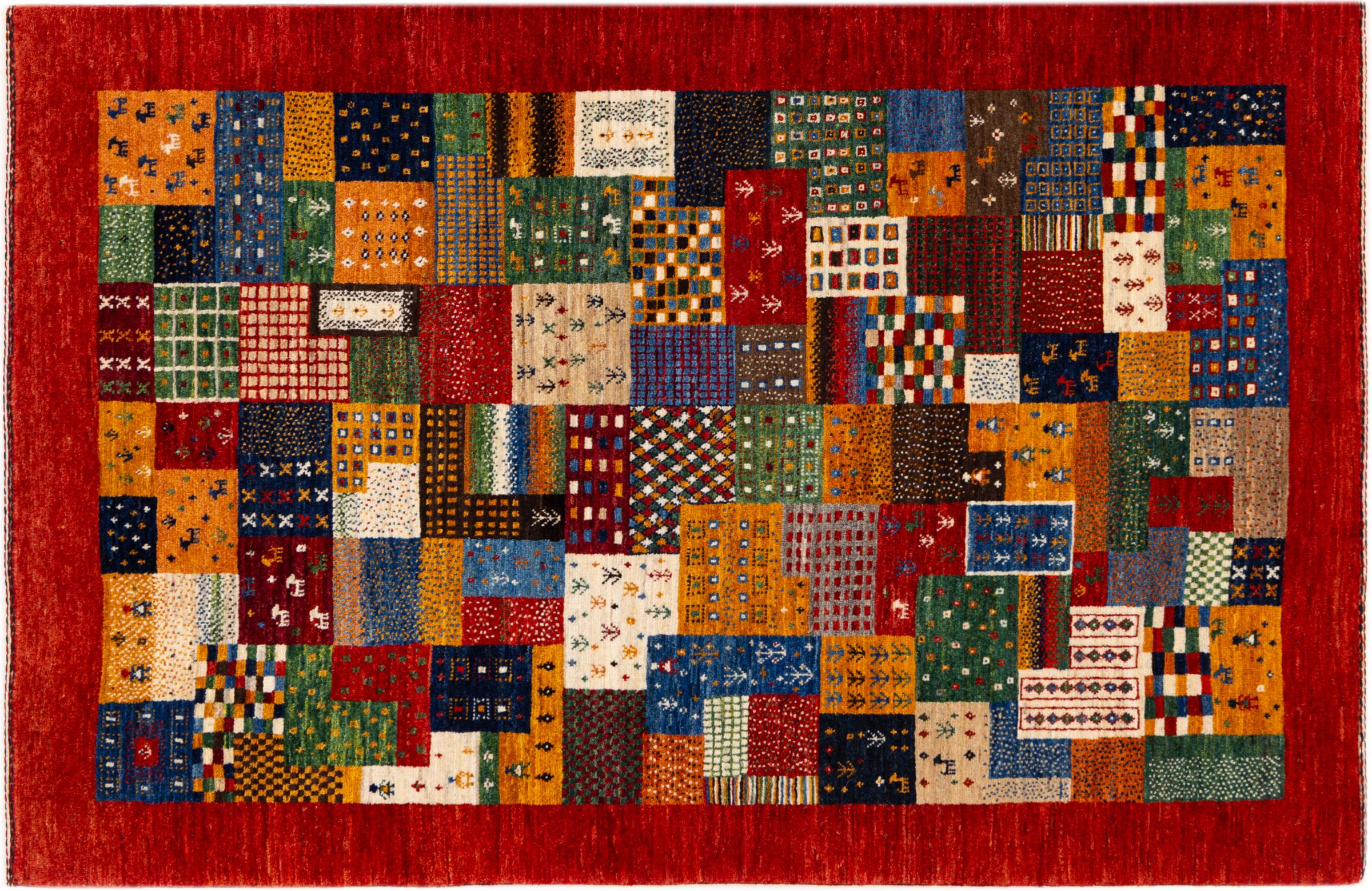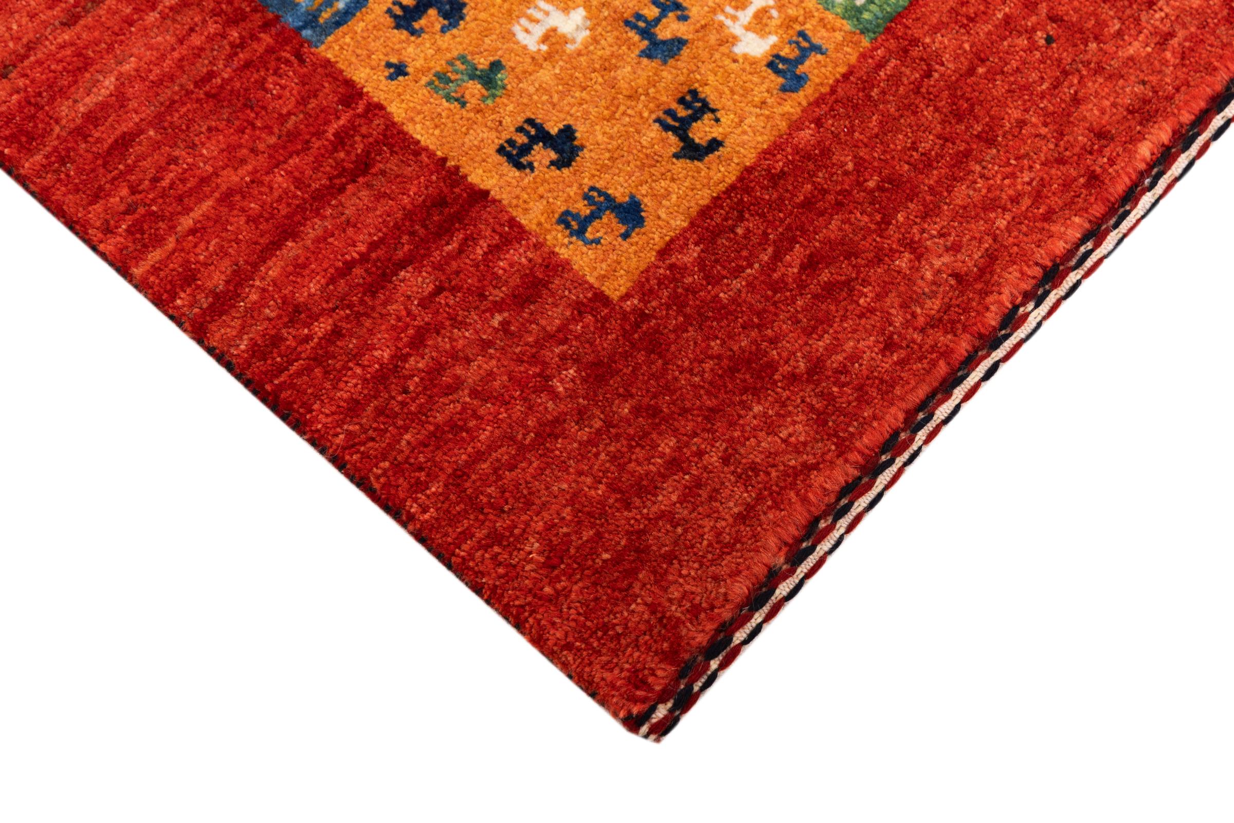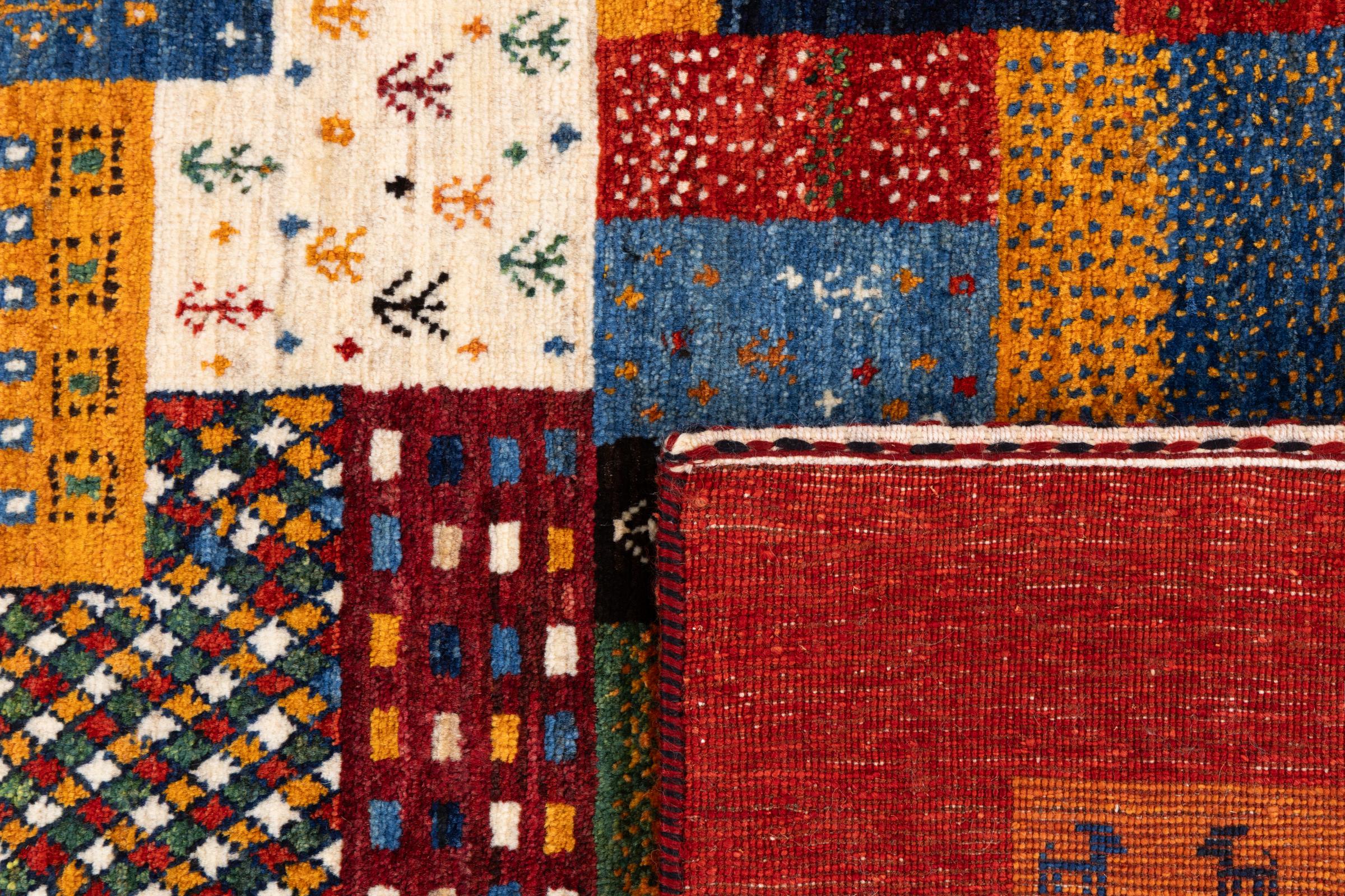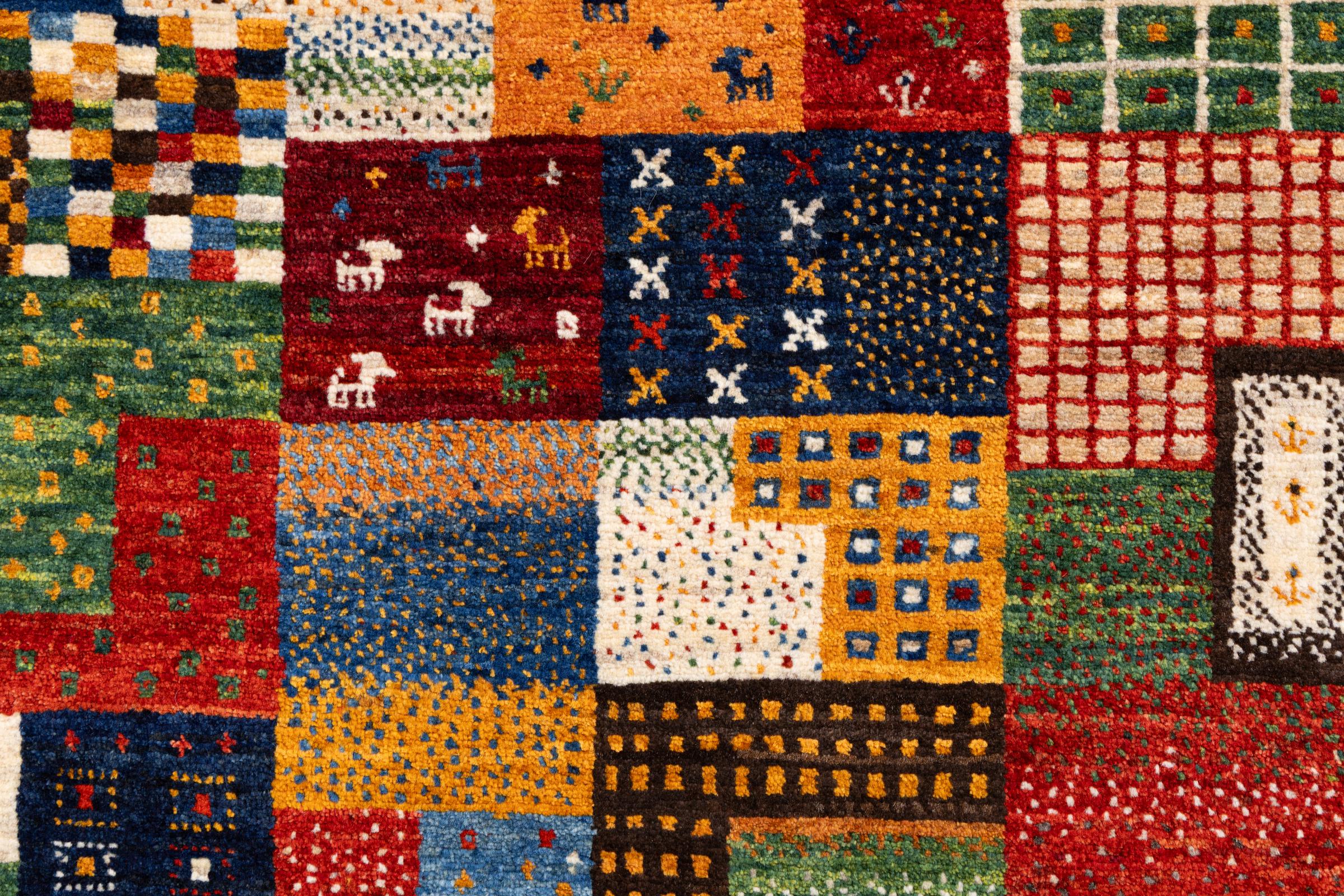 This beautiful rug is a Persian Gabbeh, one of the highest quality Gabbeh rugs available. These rugs are hand-knotted by nomads or semi-nomads in Iran using traditional artisan techniques. The simple motifs and patterns are often inspired by the nomads' immediate surroundings, featuring elements like camels, trees, or bushes. Persian Gabbeh carpets are made from wool sourced from locally raised sheep herds, with the wool typically spun by hand. Thus each of these Oriental rugs thus embodies a unique character steeped in centuries-old culture.