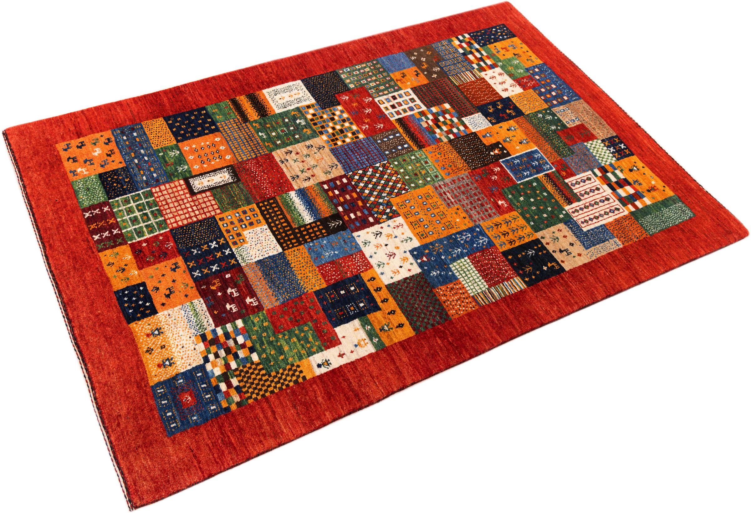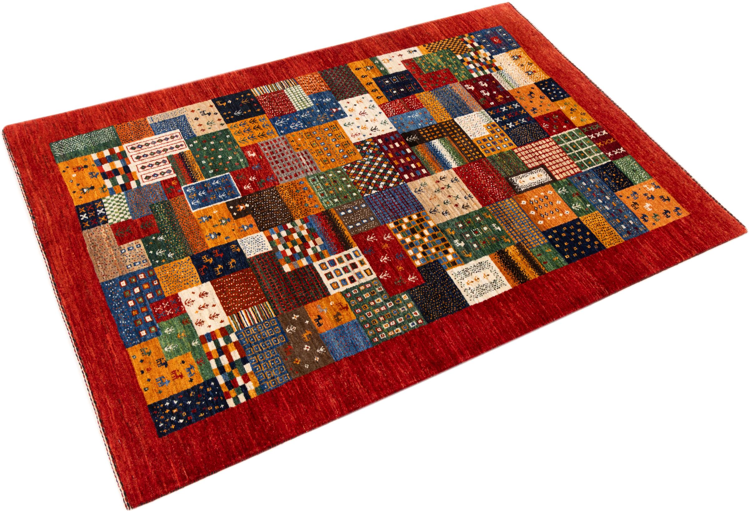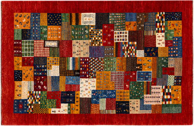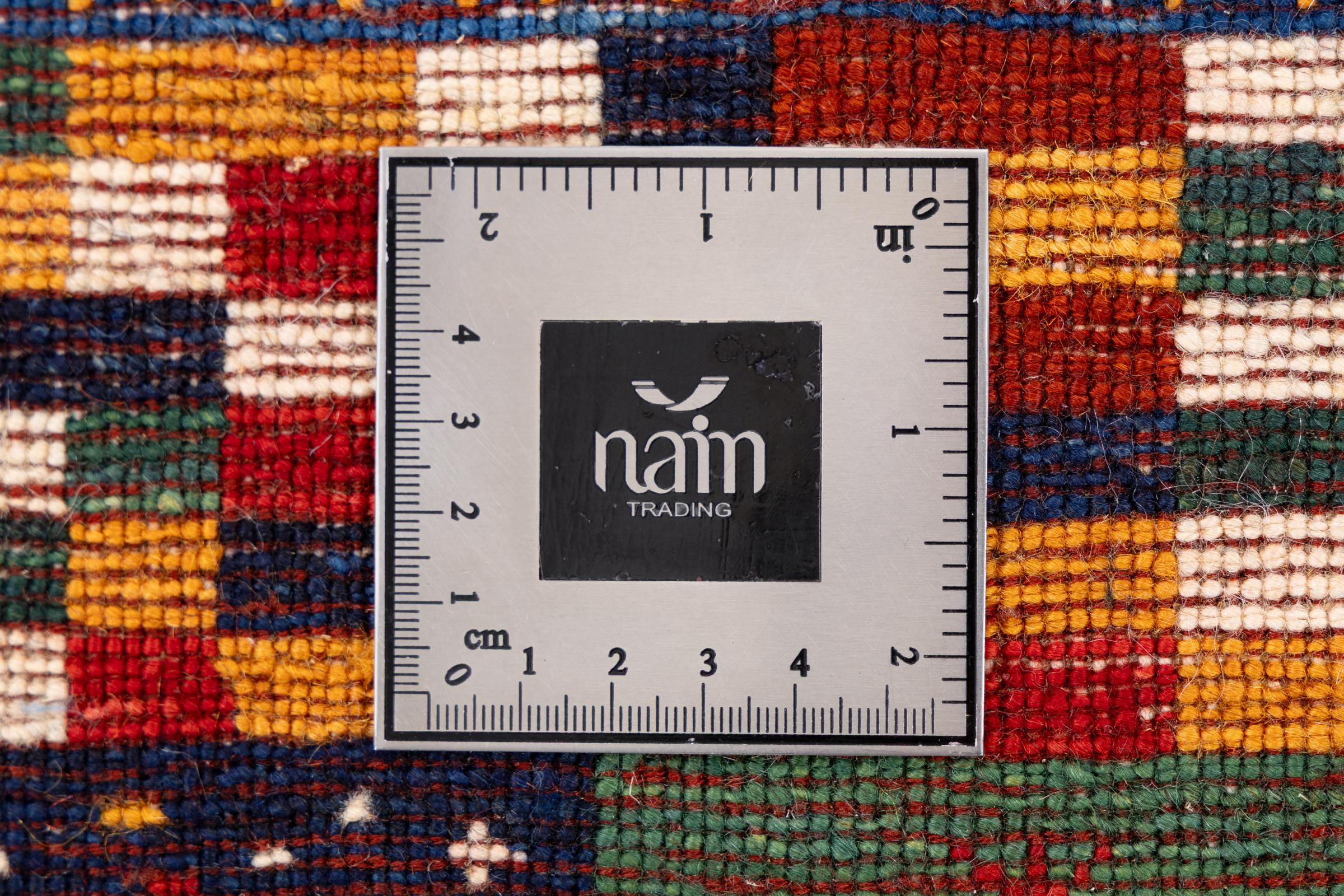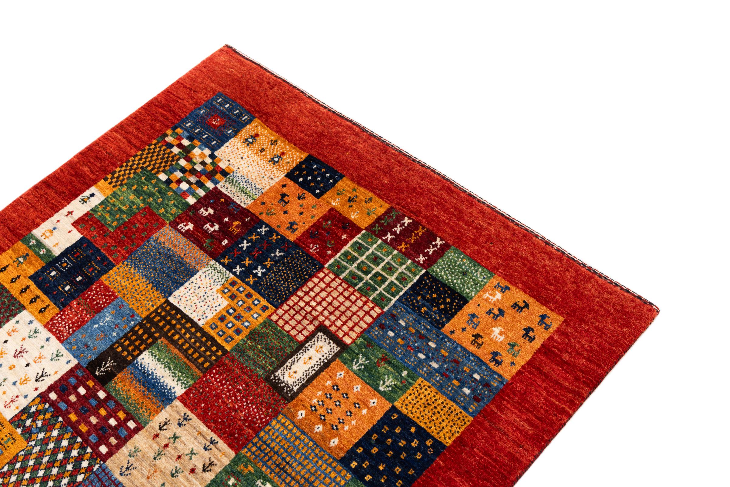 This beautiful rug is a Persian Gabbeh, one of the highest quality Gabbeh rugs available. These rugs are hand-knotted by nomads or semi-nomads in Iran using traditional artisan techniques. The simple motifs and patterns are often inspired by the nomads' immediate surroundings, featuring elements like camels, trees, or bushes. Persian Gabbeh carpets are made from wool sourced from locally raised sheep herds, with the wool typically spun by hand. Thus each of these Oriental rugs thus embodies a unique character steeped in centuries-old culture.