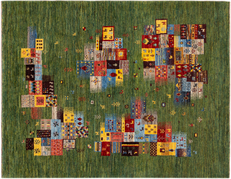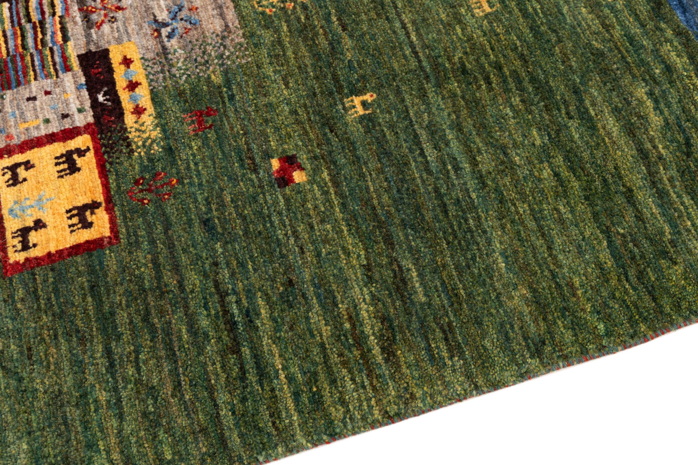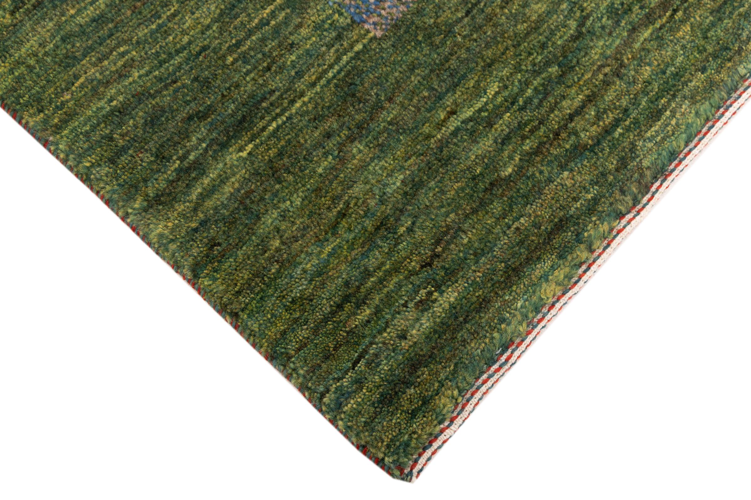 This beautiful rug is a Persian Gabbeh, one of the highest quality Gabbeh rugs available. These rugs are hand-knotted by nomads or semi-nomads in Iran using traditional artisan techniques. The simple motifs and patterns are often inspired by the nomads' immediate surroundings, featuring elements like camels, trees, or bushes. Persian Gabbeh carpets are made from wool sourced from locally raised sheep herds, with the wool typically spun by hand. Thus each of these Oriental rugs thus embodies a unique character steeped in centuries-old culture.