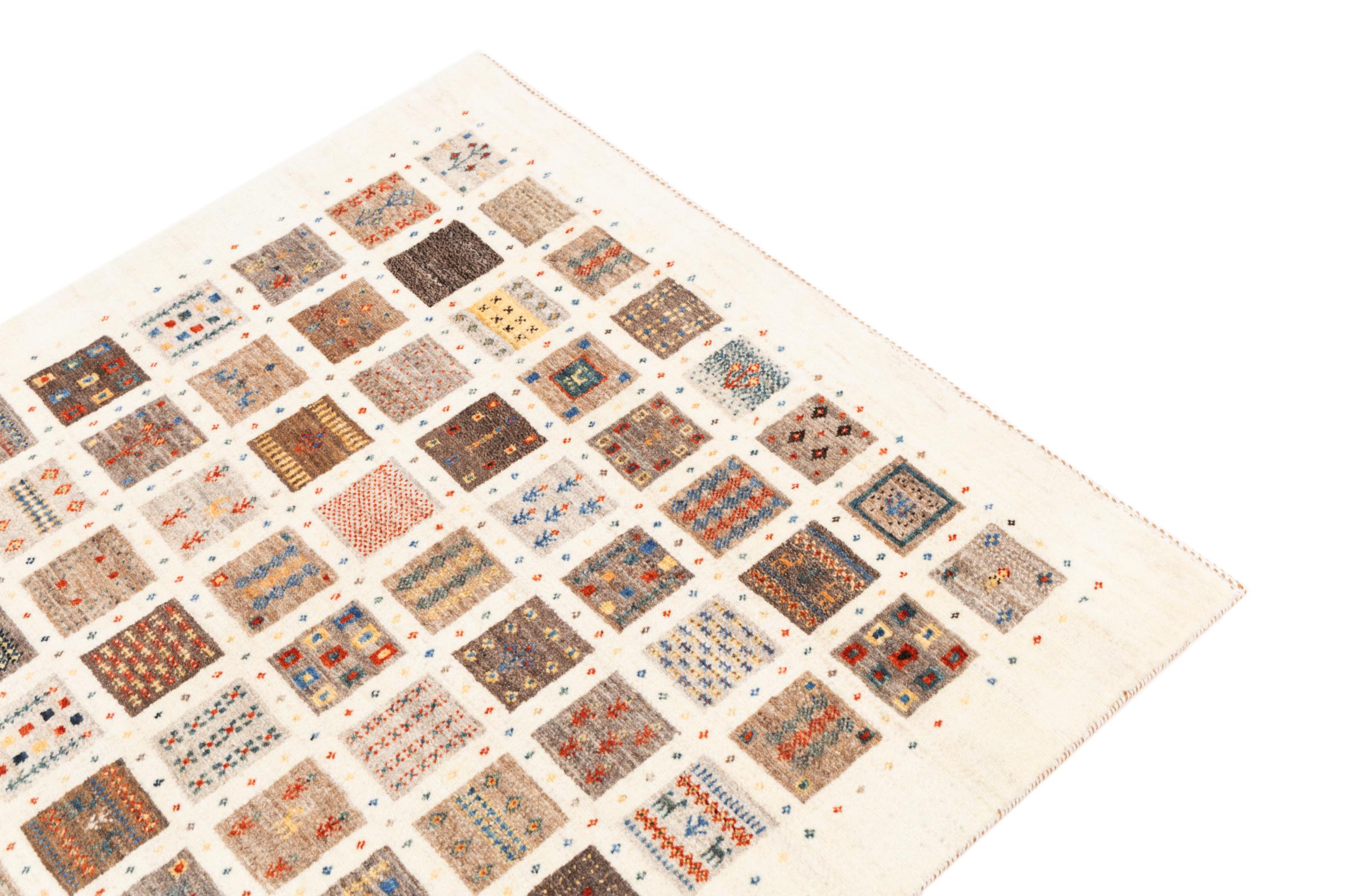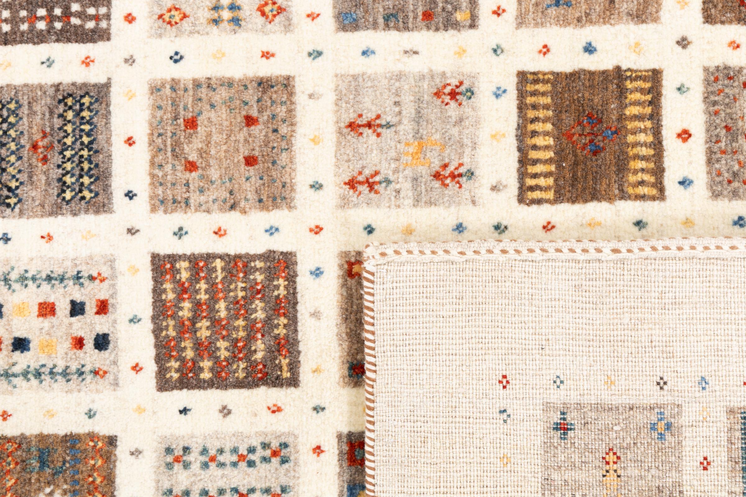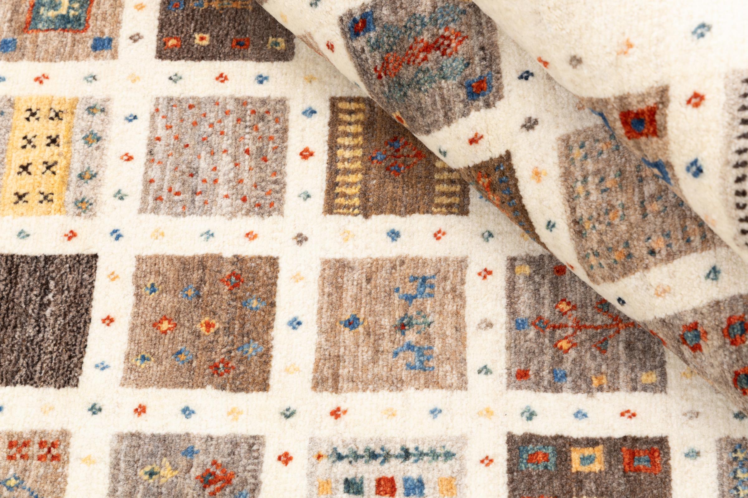 This beautiful rug is a Persian Gabbeh, one of the highest quality Gabbeh rugs available. These rugs are hand-knotted by nomads or semi-nomads in Iran using traditional artisan techniques. The simple motifs and patterns are often inspired by the nomads' immediate surroundings, featuring elements like camels, trees, or bushes. Persian Gabbeh carpets are made from wool sourced from locally raised sheep herds, with the wool typically spun by hand. Thus each of these Oriental rugs thus embodies a unique character steeped in centuries-old culture.