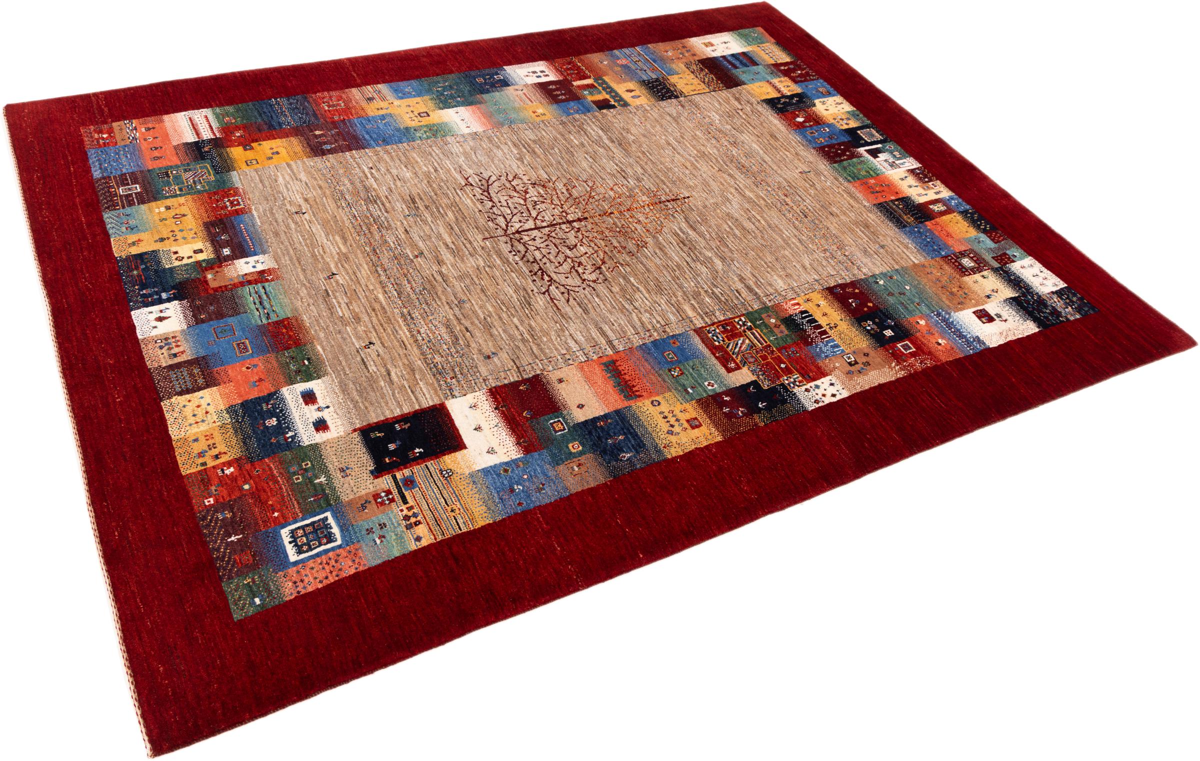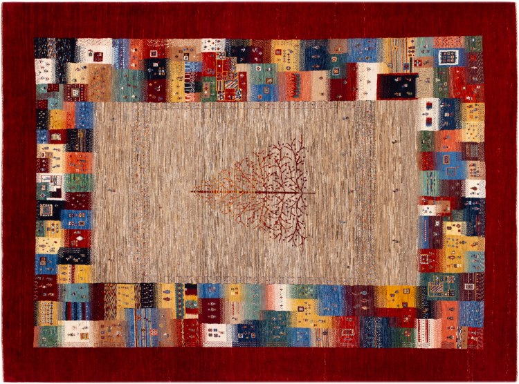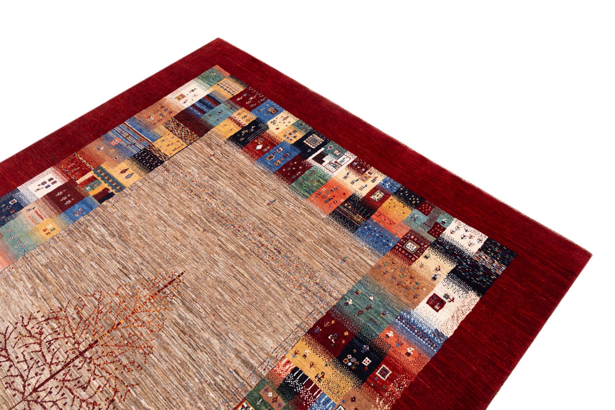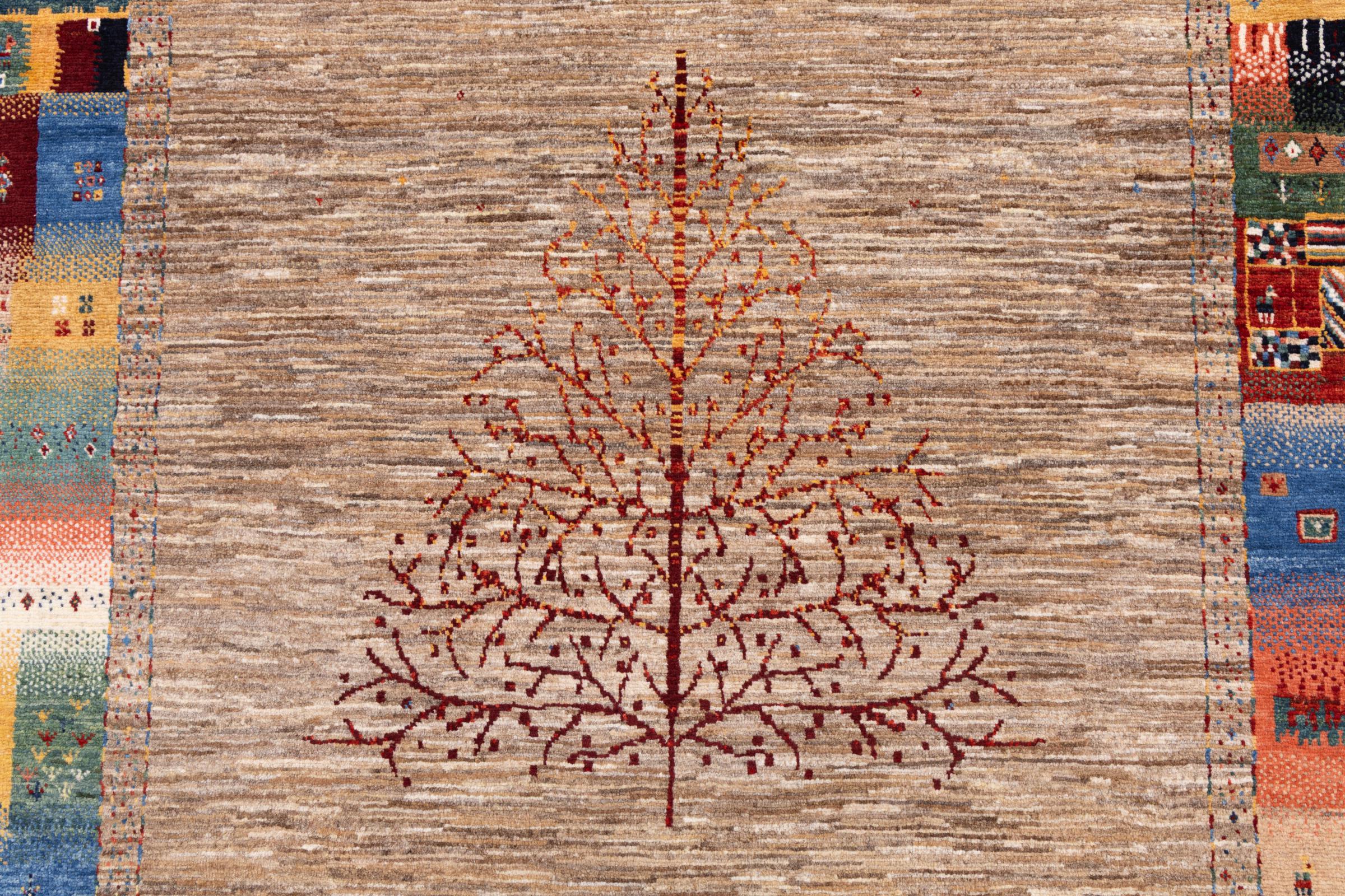 This beautiful rug is a Persian Gabbeh, one of the highest quality Gabbeh rugs available. These rugs are hand-knotted by nomads or semi-nomads in Iran using traditional artisan techniques. The simple motifs and patterns are often inspired by the nomads' immediate surroundings, featuring elements like camels, trees, or bushes. Persian Gabbeh carpets are made from wool sourced from locally raised sheep herds, with the wool typically spun by hand. Thus each of these Oriental rugs thus embodies a unique character steeped in centuries-old culture.