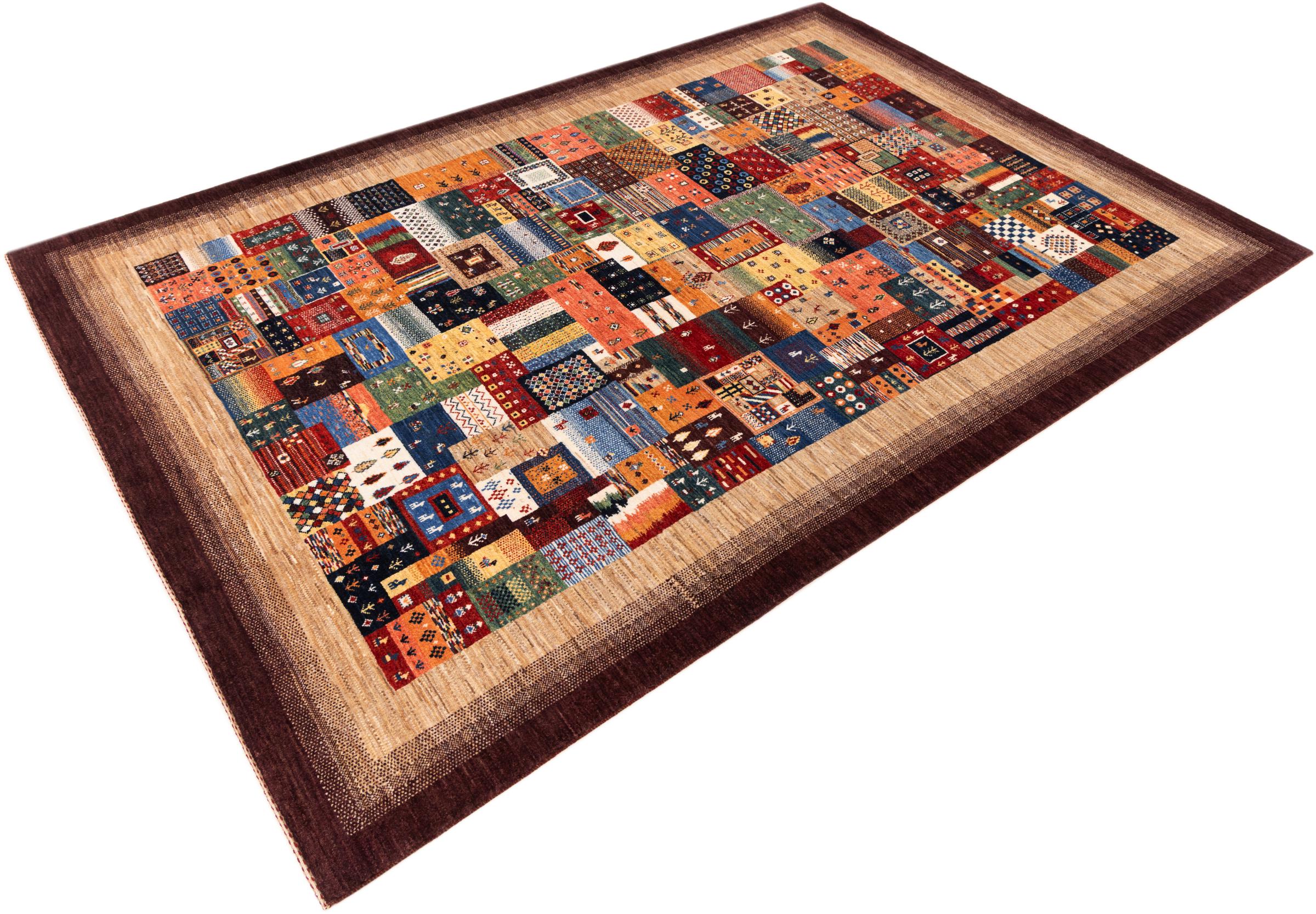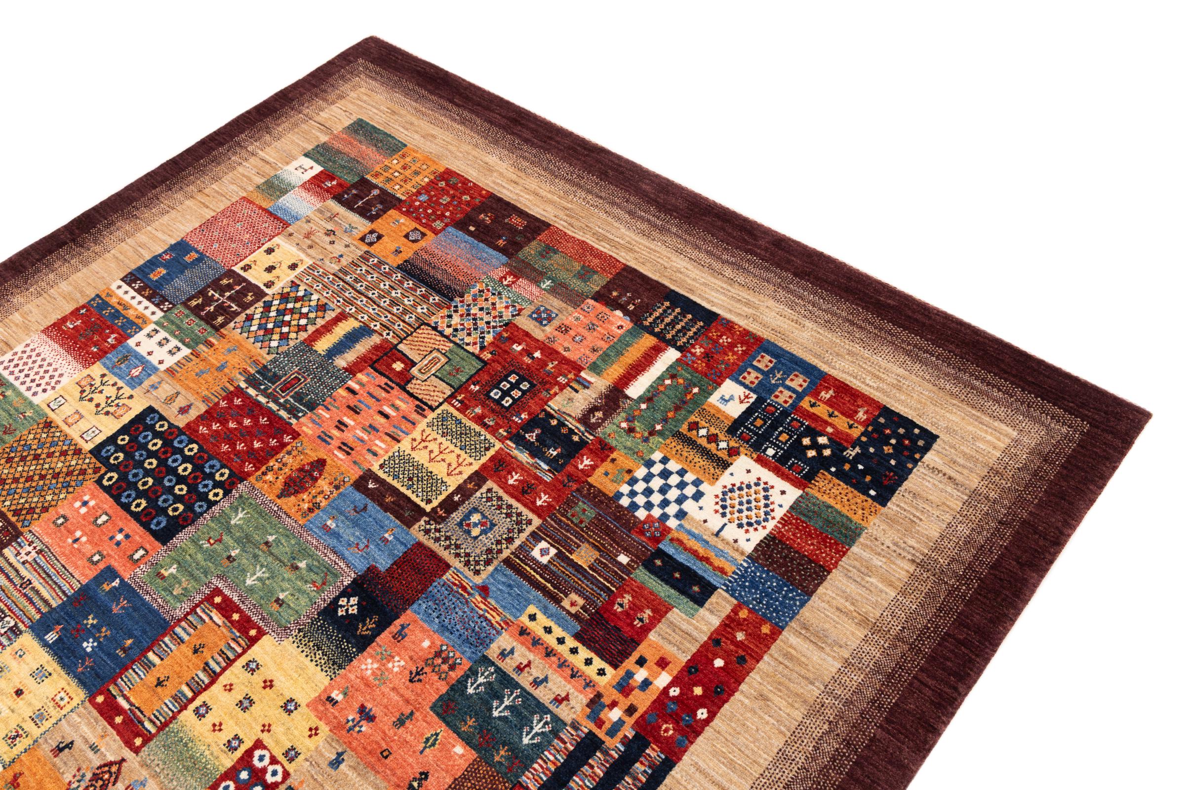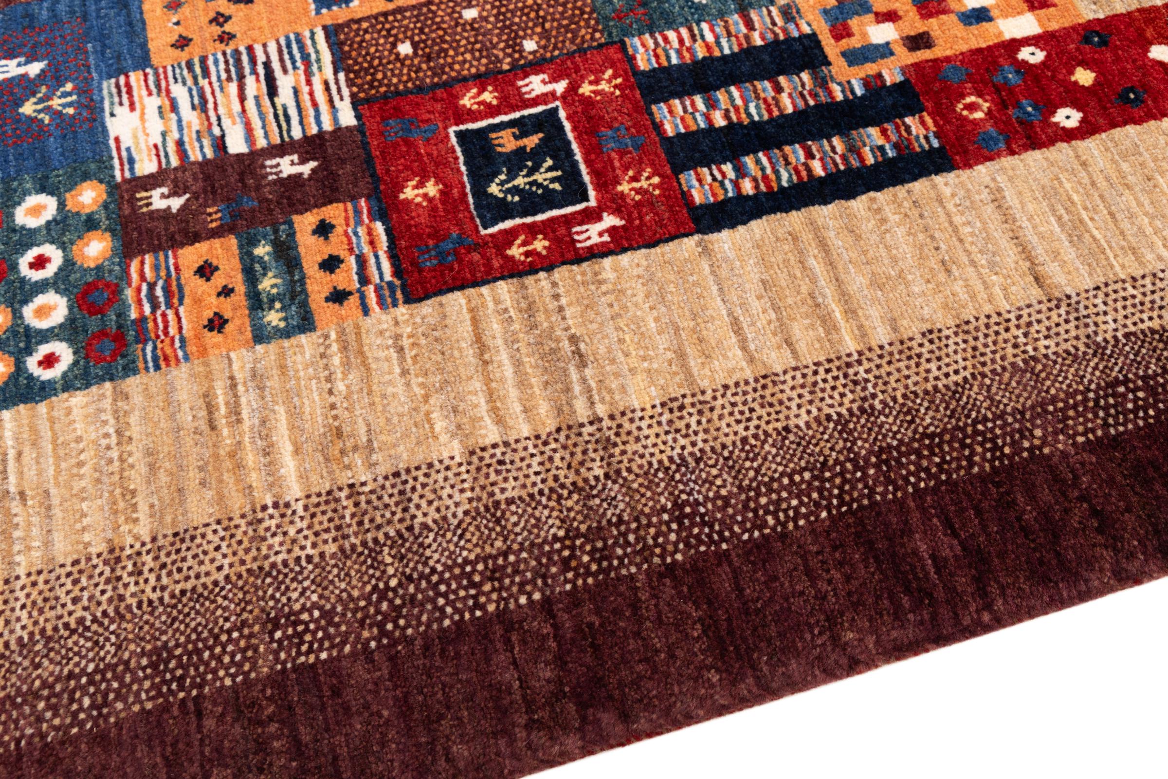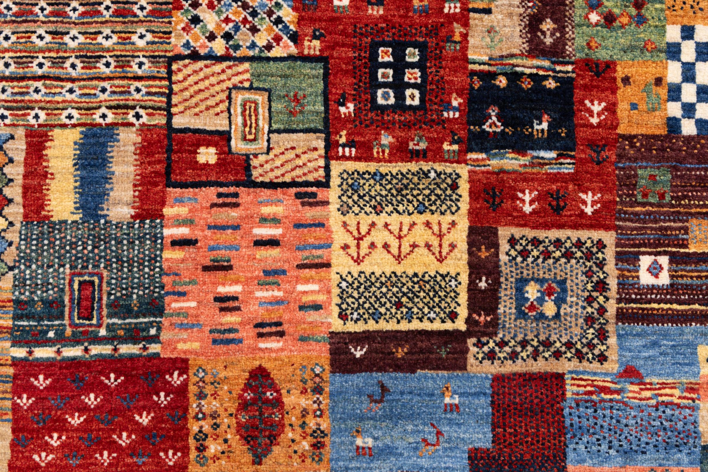 This beautiful rug is a Persian Gabbeh, one of the highest quality Gabbeh rugs available. These rugs are hand-knotted by nomads or semi-nomads in Iran using traditional artisan techniques. The simple motifs and patterns are often inspired by the nomads' immediate surroundings, featuring elements like camels, trees, or bushes. Persian Gabbeh carpets are made from wool sourced from locally raised sheep herds, with the wool typically spun by hand. Thus each of these Oriental rugs thus embodies a unique character steeped in centuries-old culture.