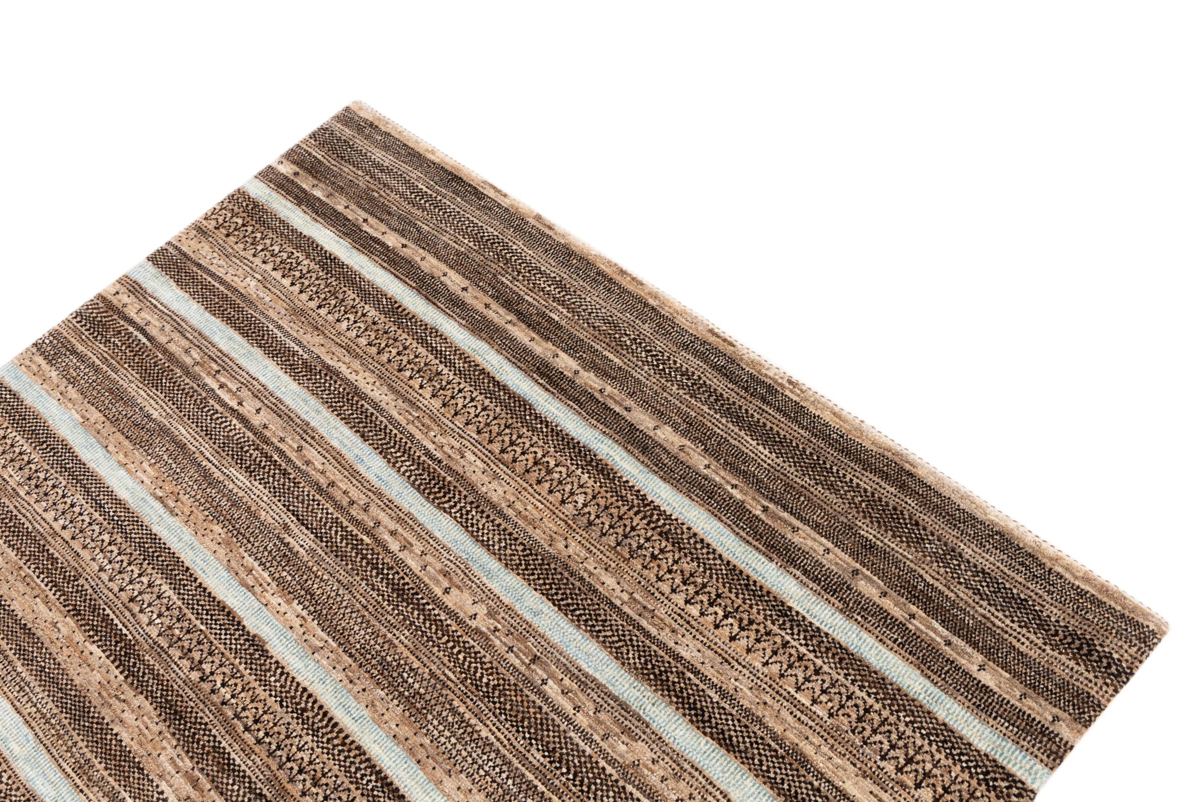 This beautiful rug is a Persian Gabbeh, one of the highest quality Gabbeh rugs available. These rugs are hand-knotted by nomads or semi-nomads in Iran using traditional artisan techniques. The simple motifs and patterns are often inspired by the nomads' immediate surroundings, featuring elements like camels, trees, or bushes. Persian Gabbeh carpets are made from wool sourced from locally raised sheep herds, with the wool typically spun by hand. Thus each of these Oriental rugs thus embodies a unique character steeped in centuries-old culture.