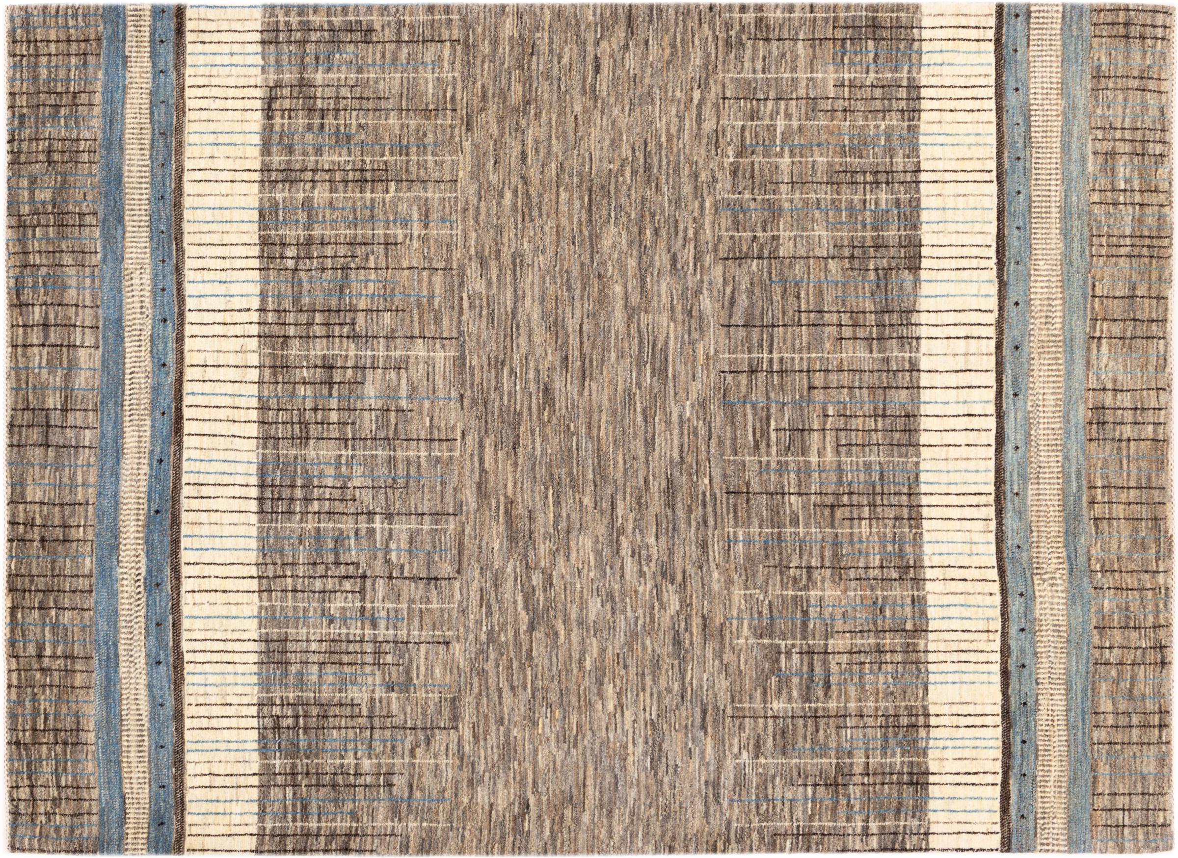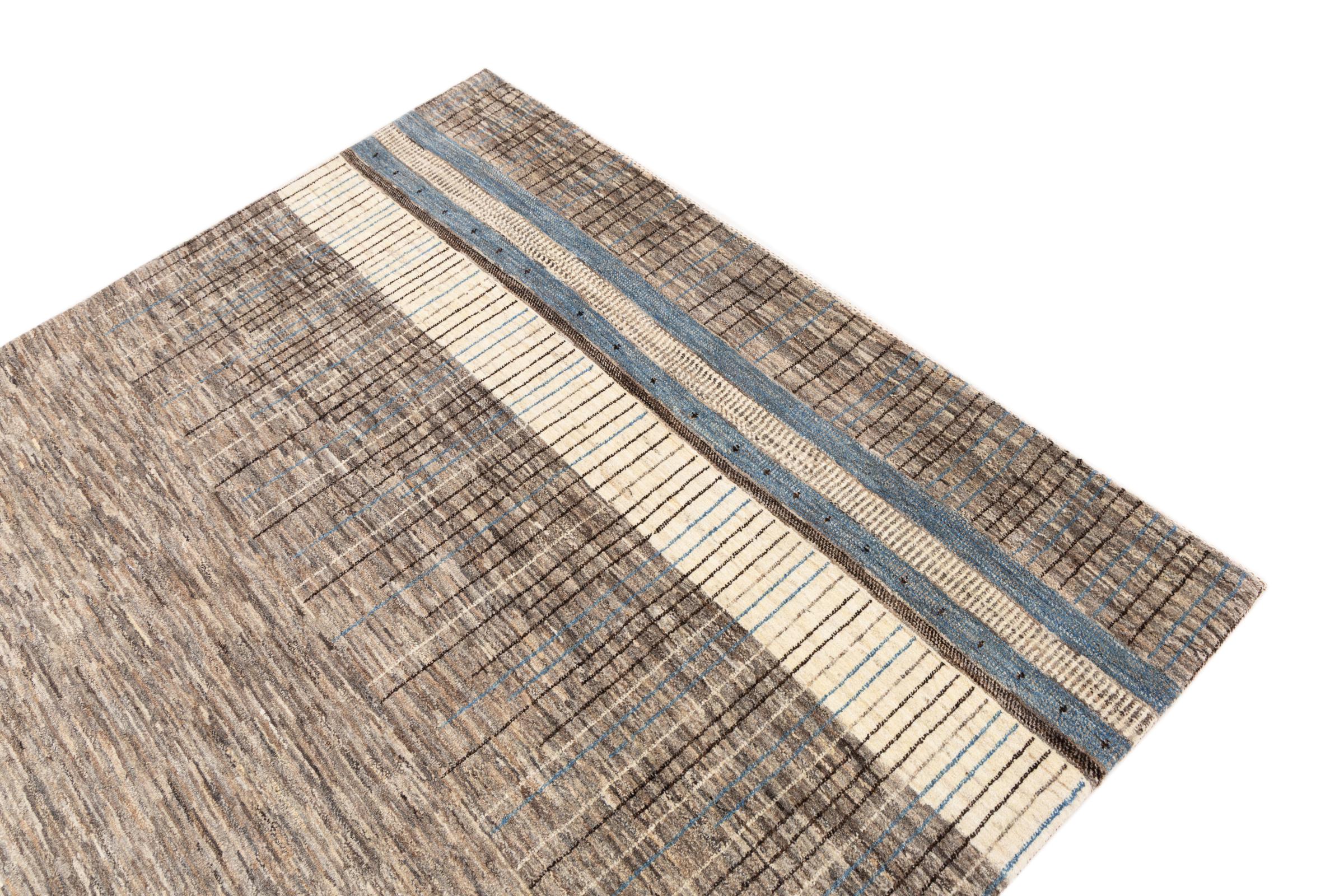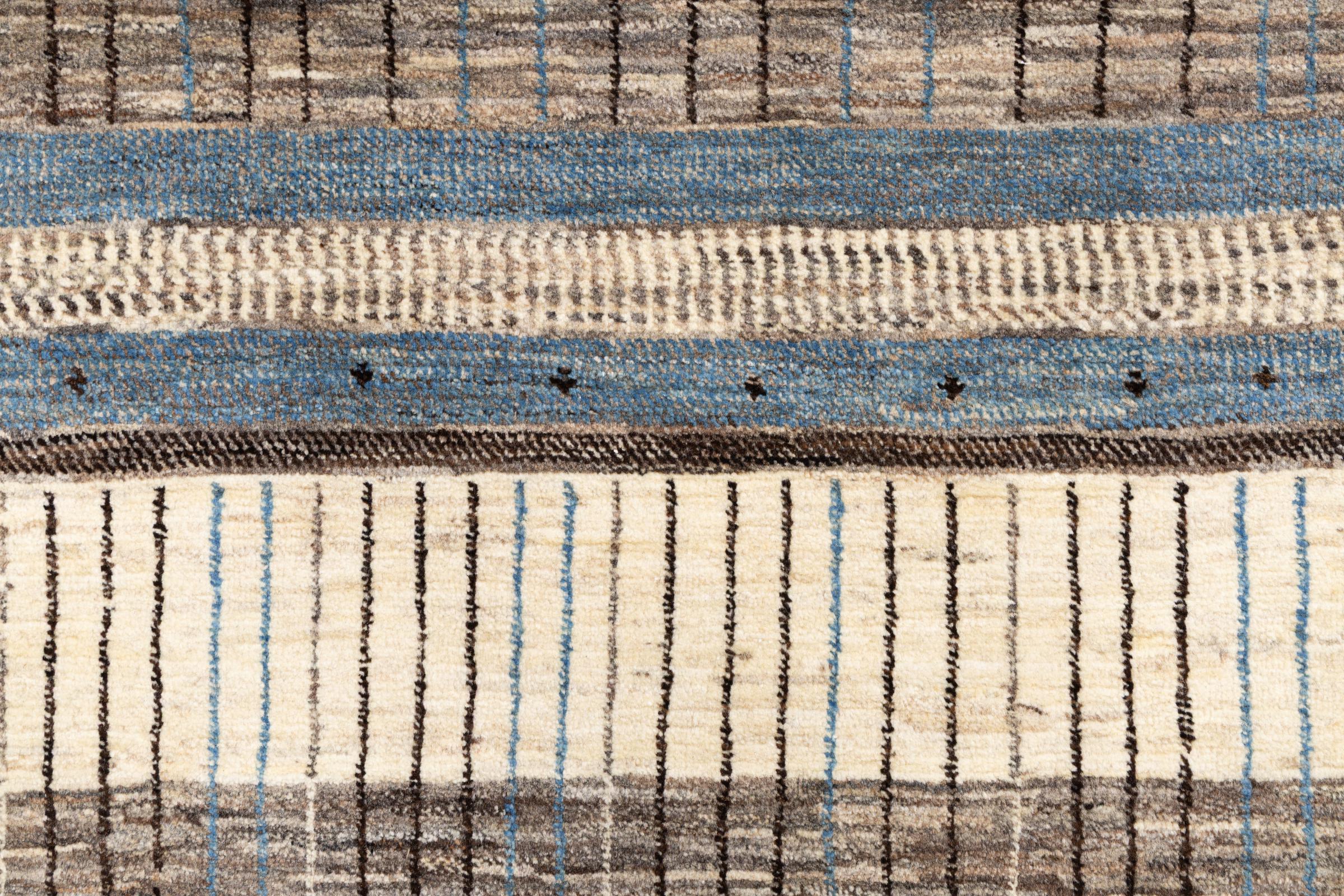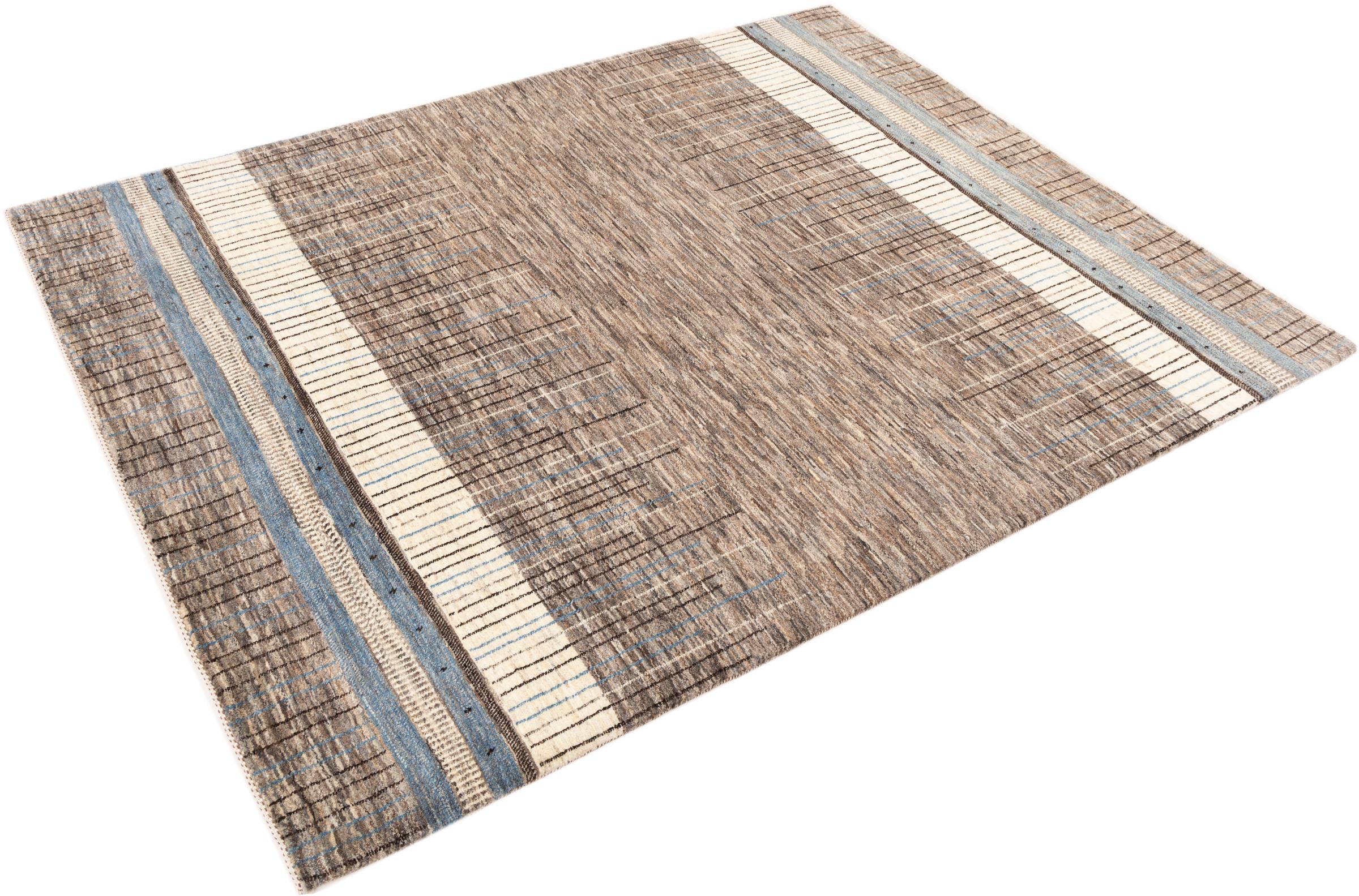 This beautiful rug is a Persian Gabbeh, one of the highest quality Gabbeh rugs available. These rugs are hand-knotted by nomads or semi-nomads in Iran using traditional artisan techniques. The simple motifs and patterns are often inspired by the nomads' immediate surroundings, featuring elements like camels, trees, or bushes. Persian Gabbeh carpets are made from wool sourced from locally raised sheep herds, with the wool typically spun by hand. Thus each of these Oriental rugs thus embodies a unique character steeped in centuries-old culture.