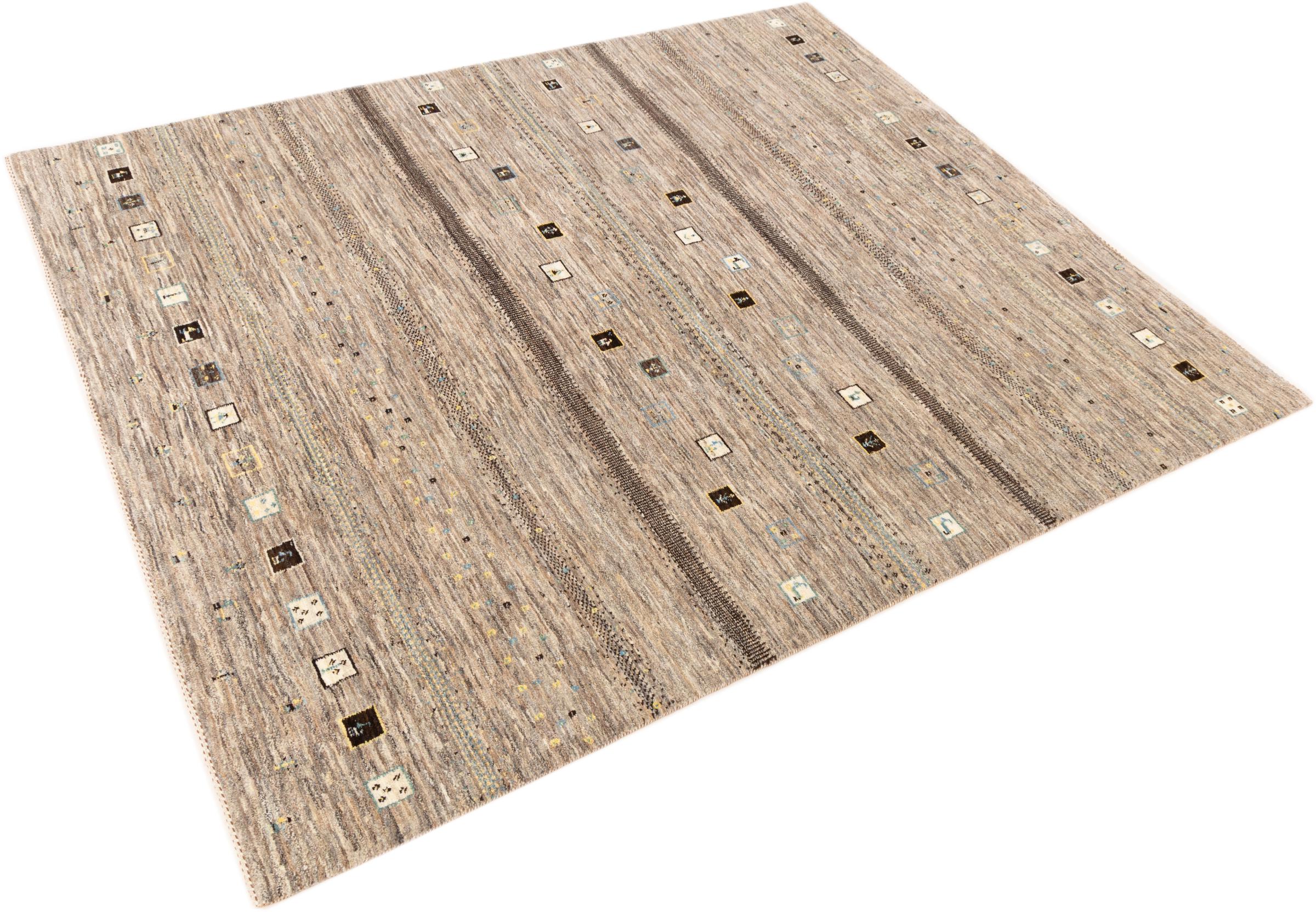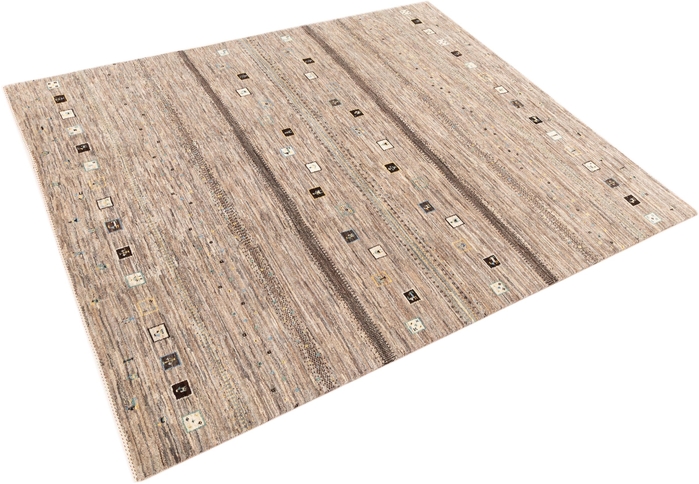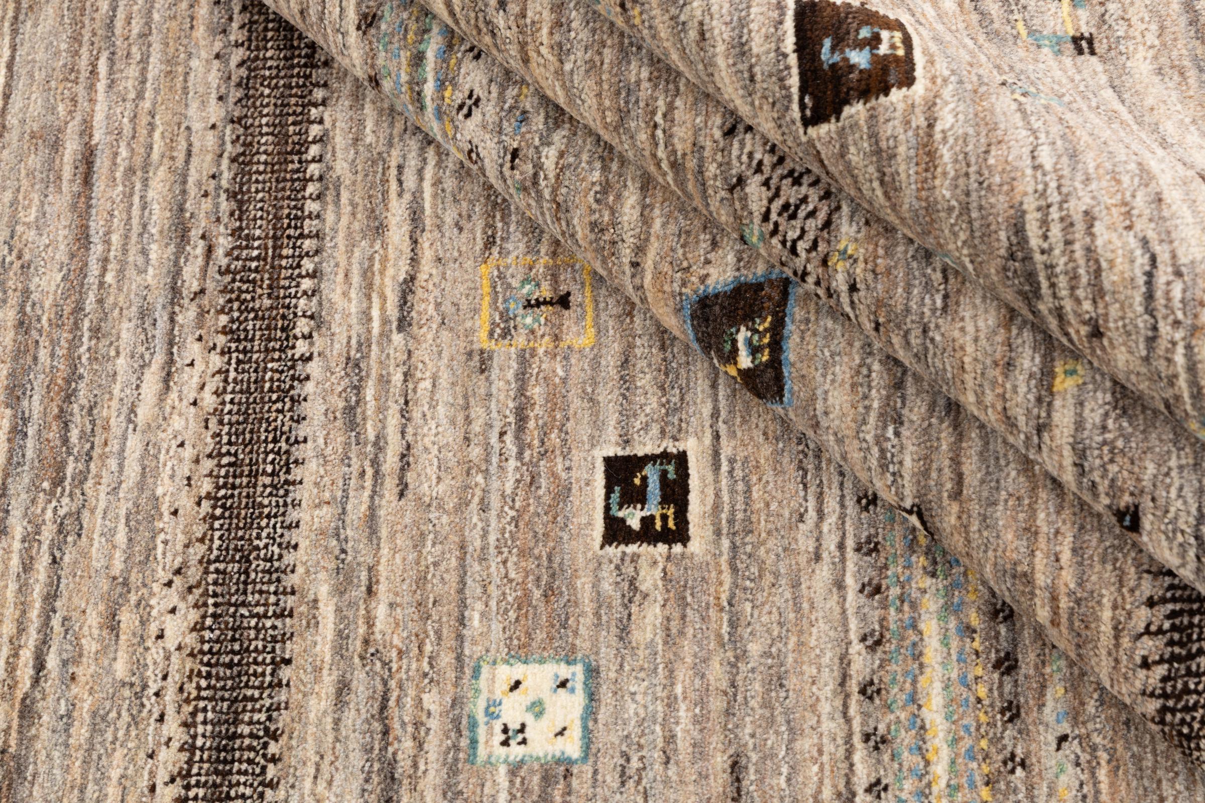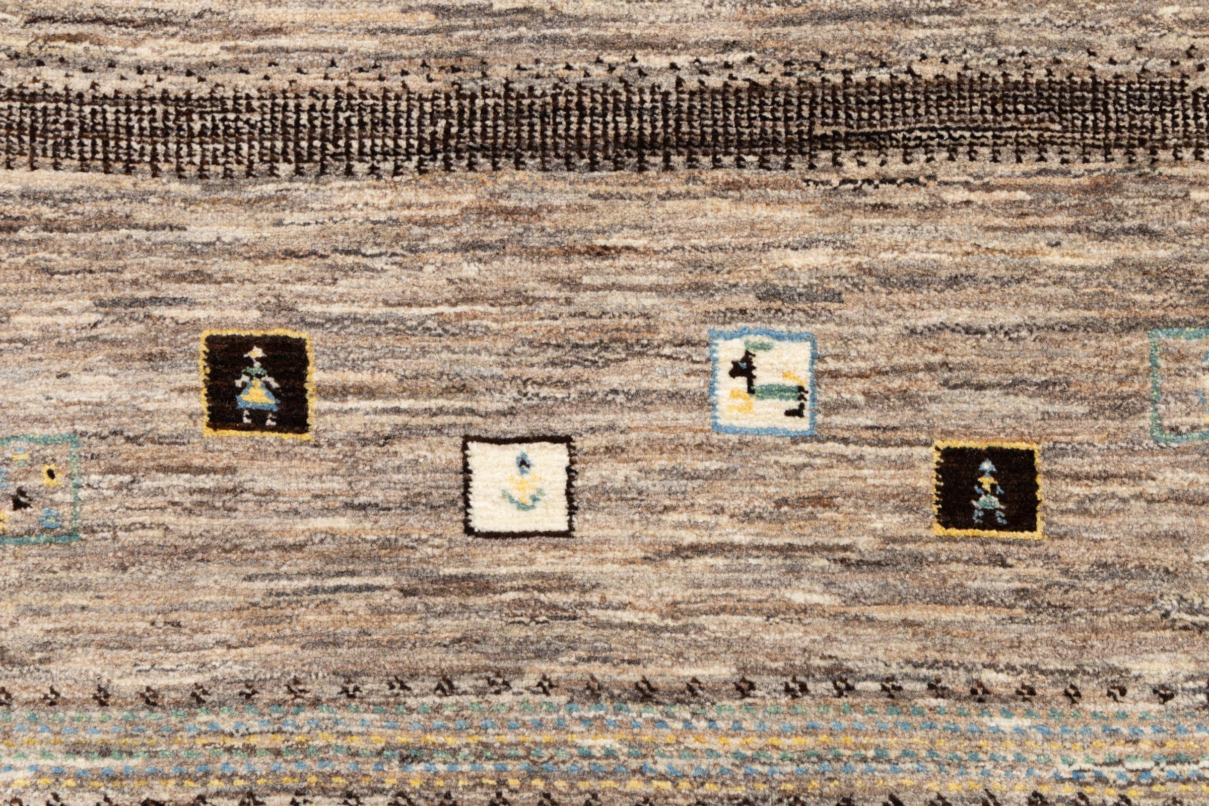 This beautiful rug is a Persian Gabbeh, one of the highest quality Gabbeh rugs available. These rugs are hand-knotted by nomads or semi-nomads in Iran using traditional artisan techniques. The simple motifs and patterns are often inspired by the nomads' immediate surroundings, featuring elements like camels, trees, or bushes. Persian Gabbeh carpets are made from wool sourced from locally raised sheep herds, with the wool typically spun by hand. Thus each of these Oriental rugs thus embodies a unique character steeped in centuries-old culture.