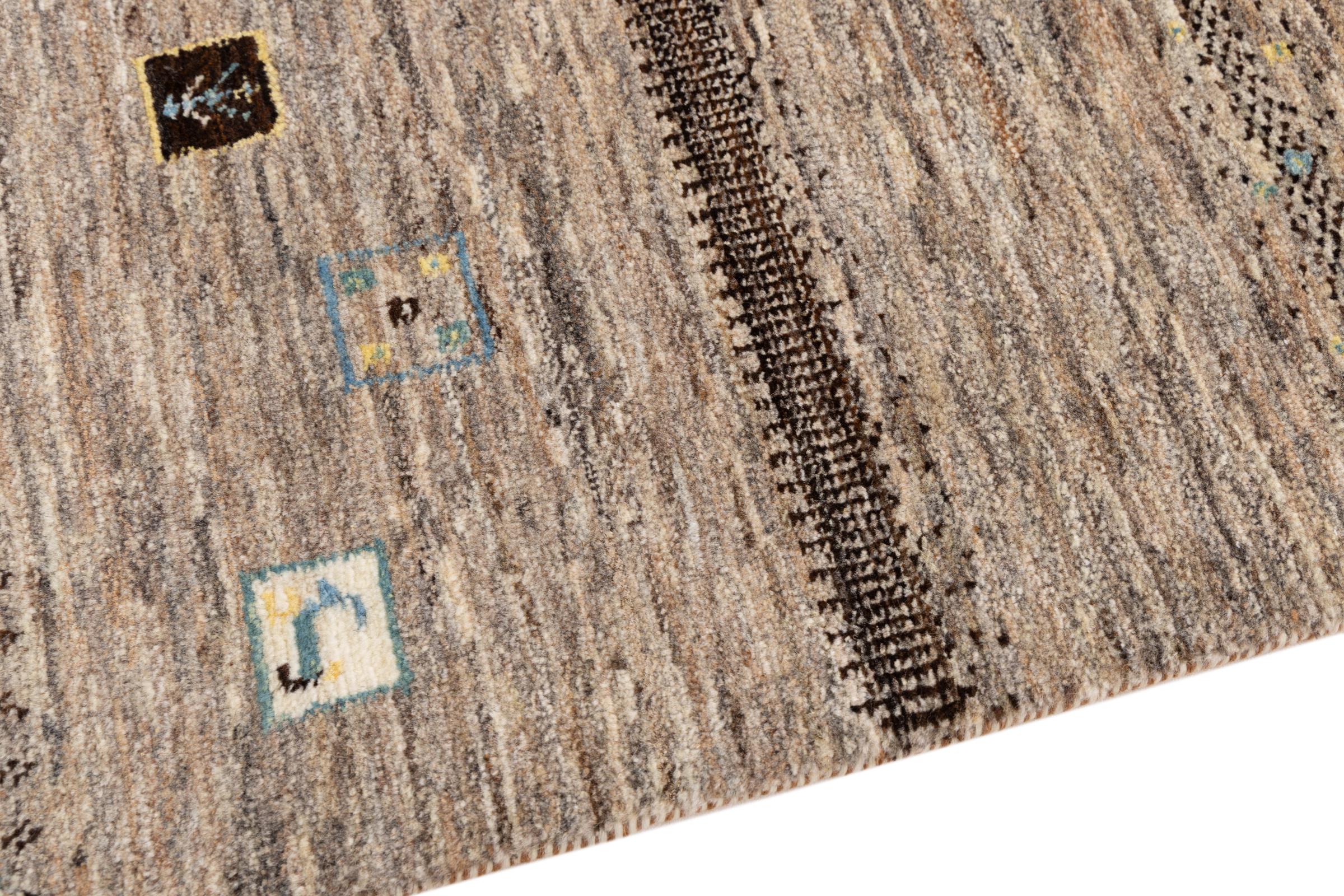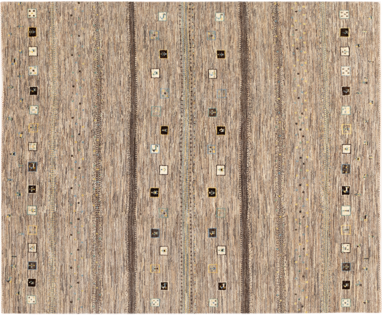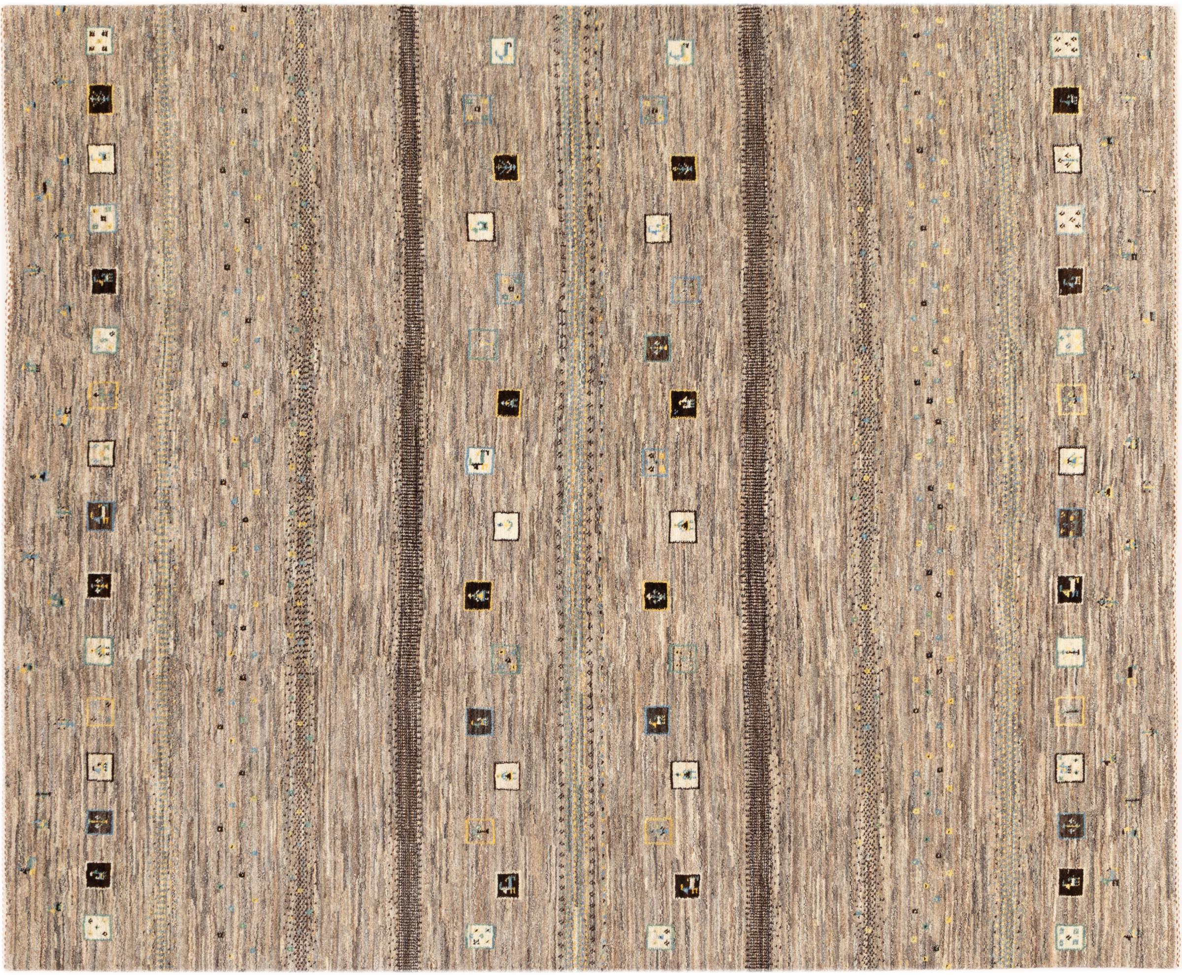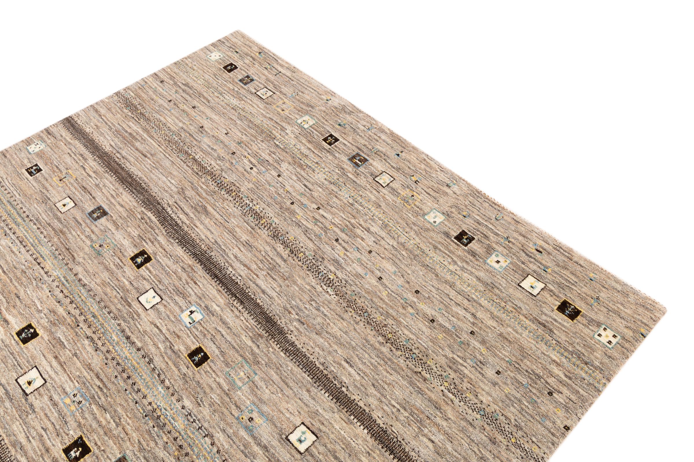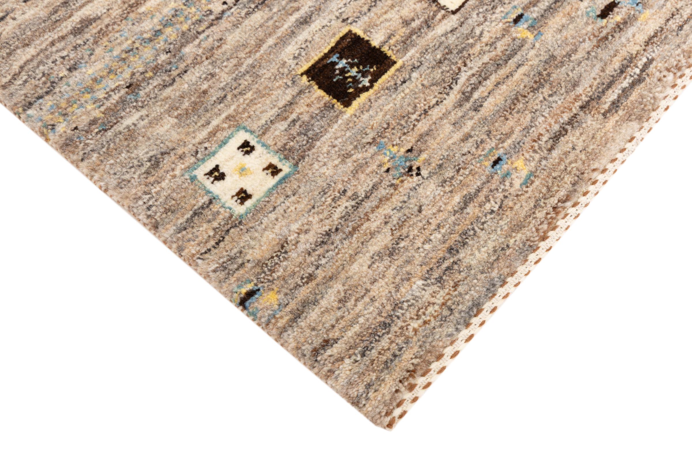 This beautiful rug is a Persian Gabbeh, one of the highest quality Gabbeh rugs available. These rugs are hand-knotted by nomads or semi-nomads in Iran using traditional artisan techniques. The simple motifs and patterns are often inspired by the nomads' immediate surroundings, featuring elements like camels, trees, or bushes. Persian Gabbeh carpets are made from wool sourced from locally raised sheep herds, with the wool typically spun by hand. Thus each of these Oriental rugs thus embodies a unique character steeped in centuries-old culture.