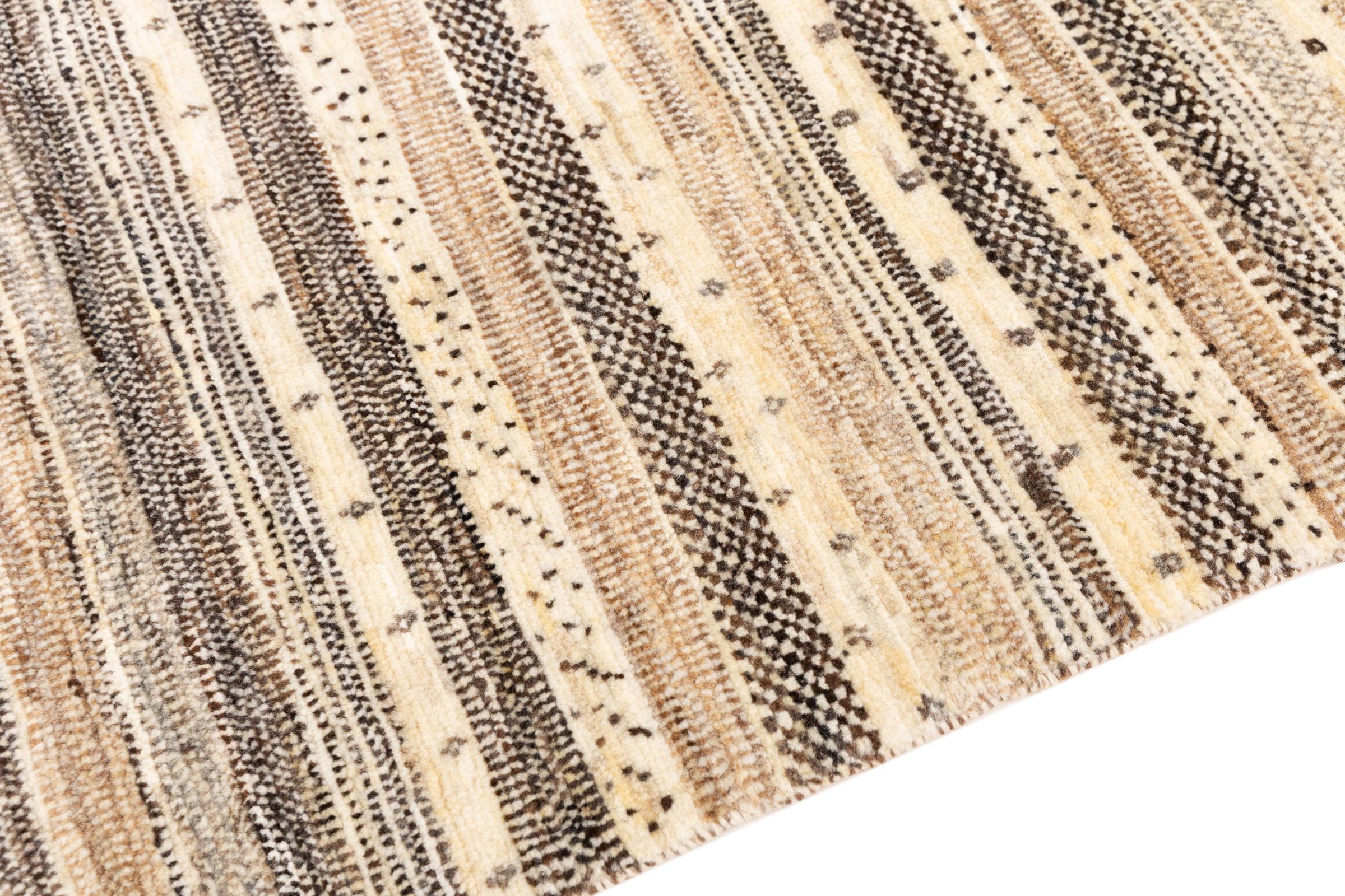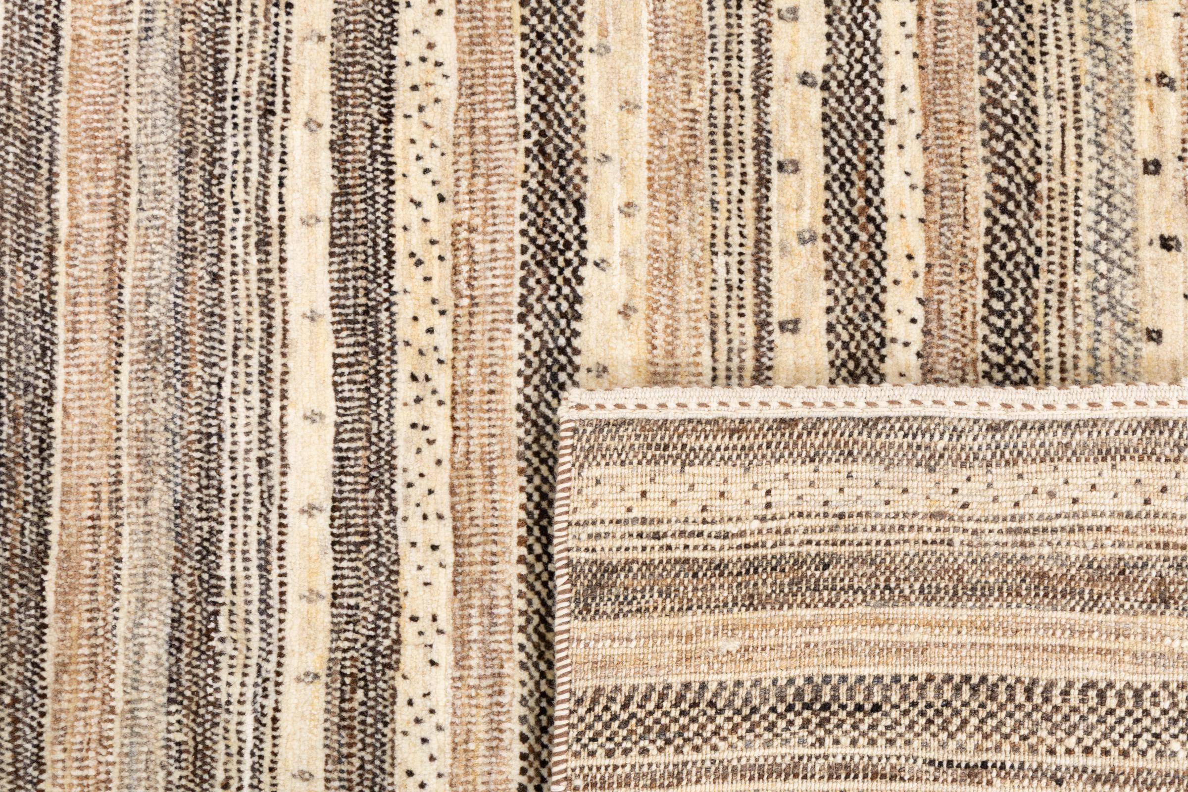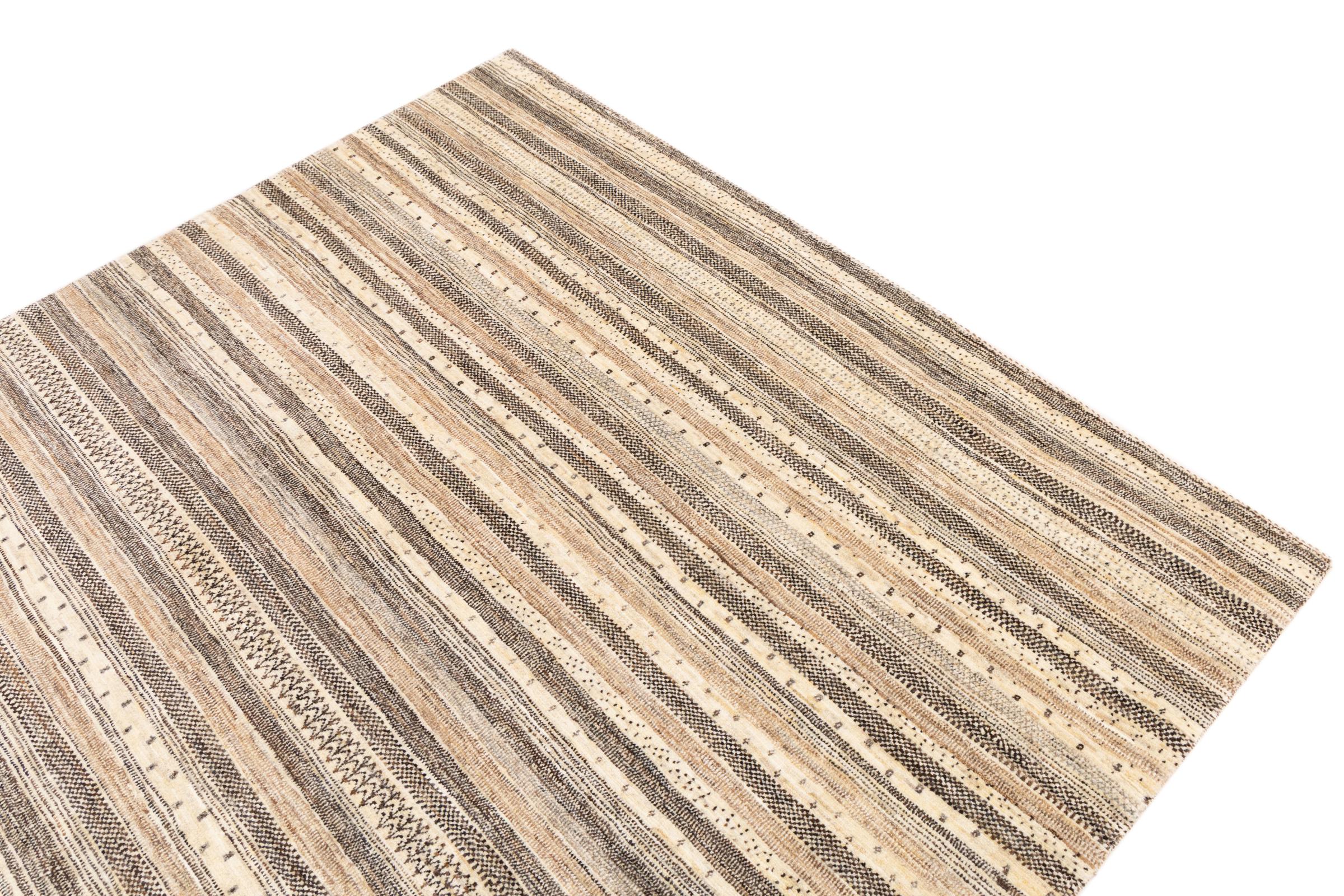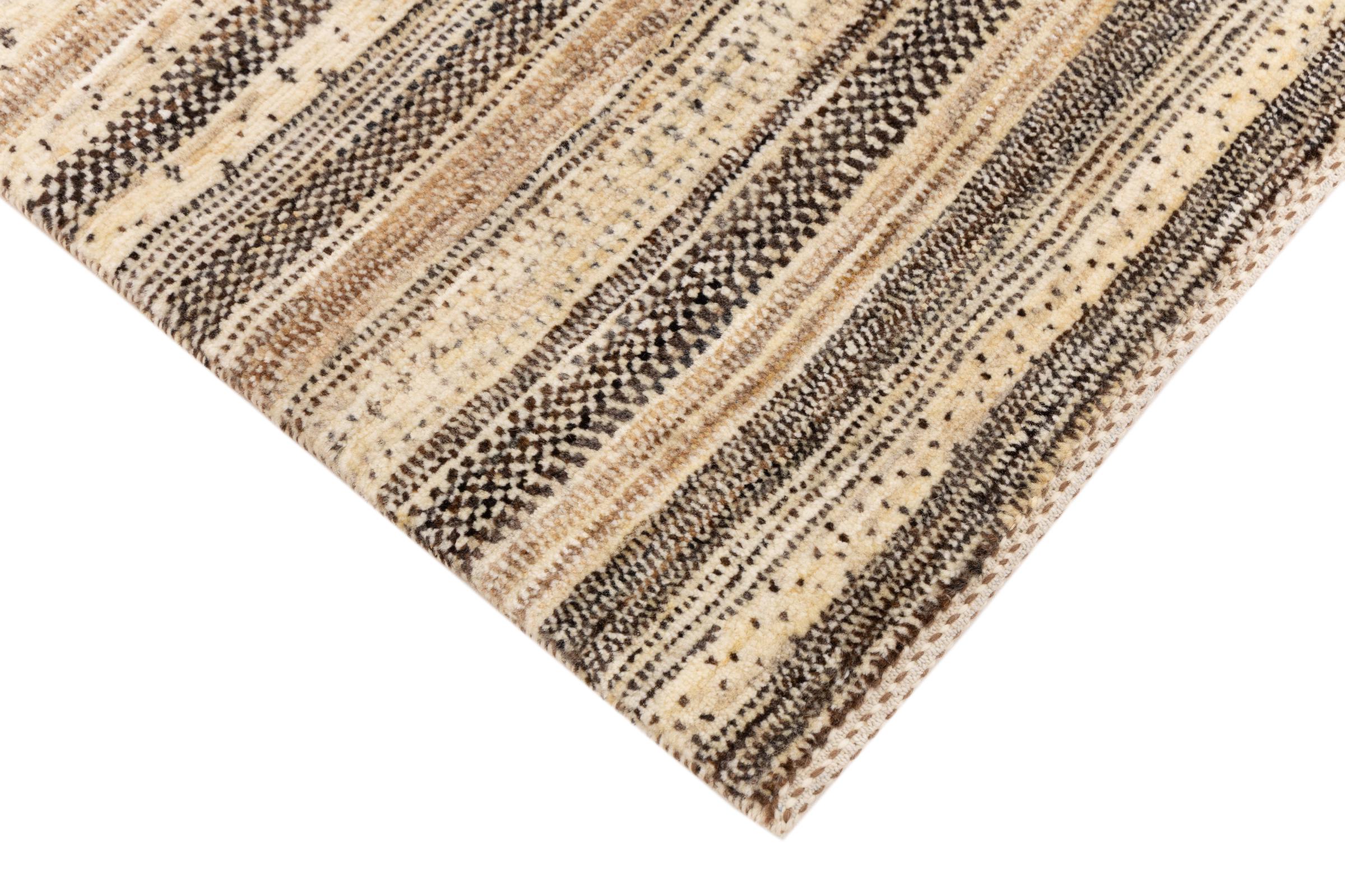 This beautiful rug is a Persian Gabbeh, one of the highest quality Gabbeh rugs available. These rugs are hand-knotted by nomads or semi-nomads in Iran using traditional artisan techniques. The simple motifs and patterns are often inspired by the nomads' immediate surroundings, featuring elements like camels, trees, or bushes. Persian Gabbeh carpets are made from wool sourced from locally raised sheep herds, with the wool typically spun by hand. Thus each of these Oriental rugs thus embodies a unique character steeped in centuries-old culture.