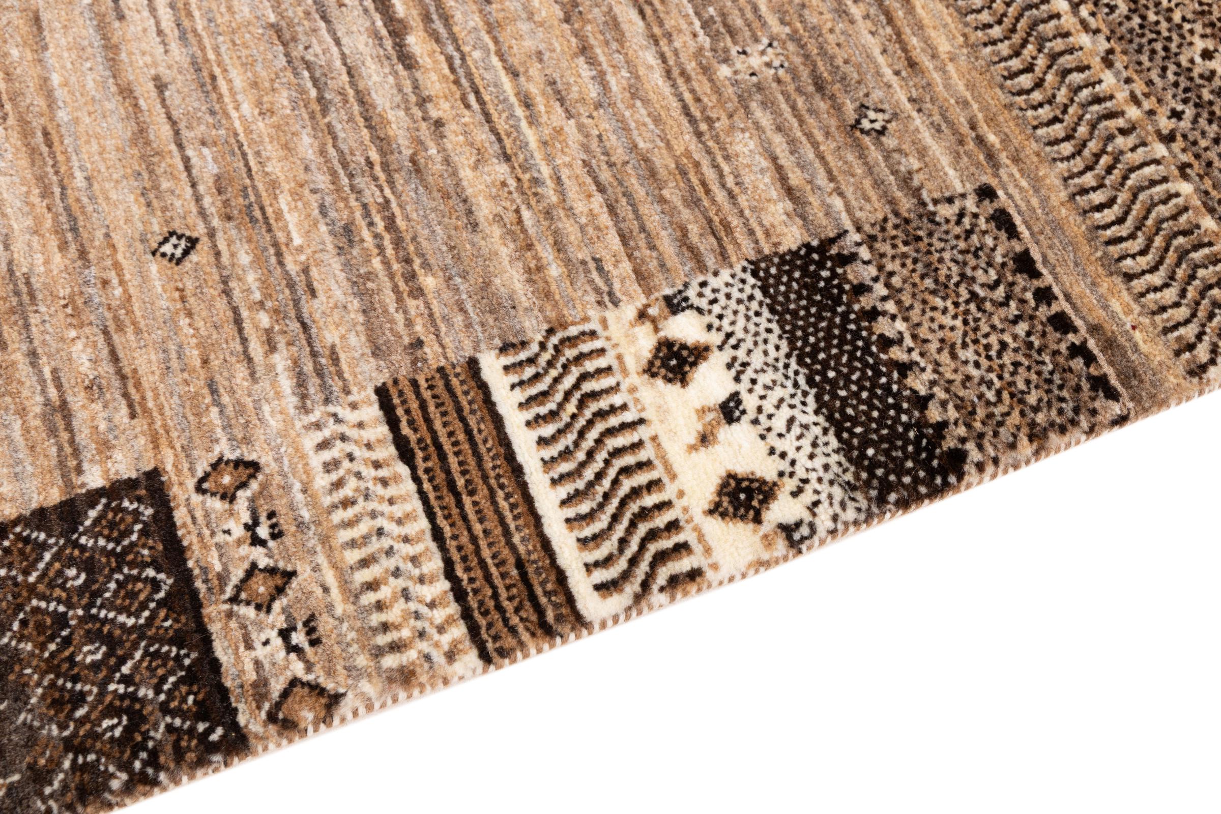 This beautiful rug is a Persian Gabbeh, one of the highest quality Gabbeh rugs available. These rugs are hand-knotted by nomads or semi-nomads in Iran using traditional artisan techniques. The simple motifs and patterns are often inspired by the nomads' immediate surroundings, featuring elements like camels, trees, or bushes. Persian Gabbeh carpets are made from wool sourced from locally raised sheep herds, with the wool typically spun by hand. Thus each of these Oriental rugs thus embodies a unique character steeped in centuries-old culture.