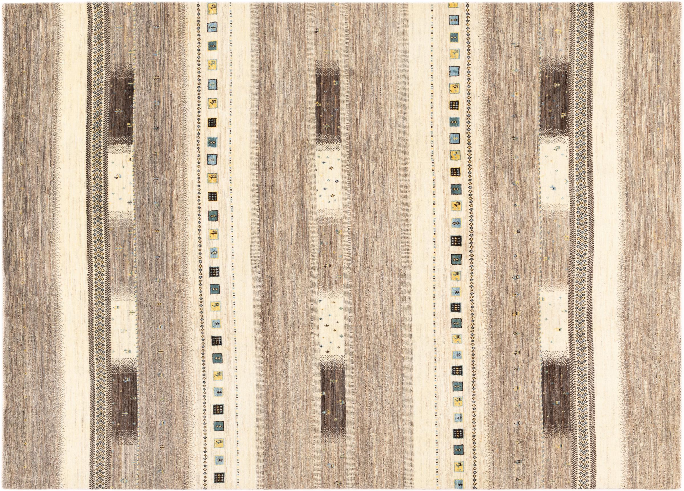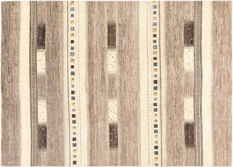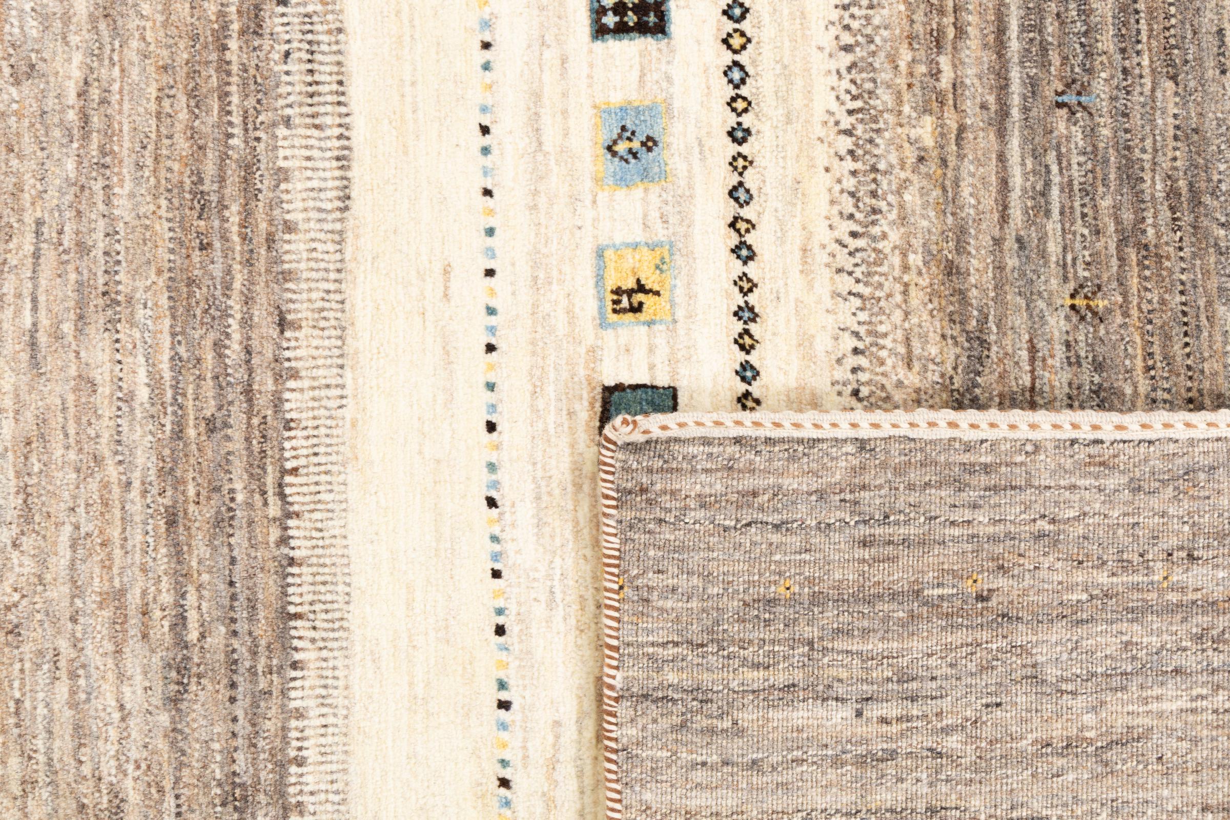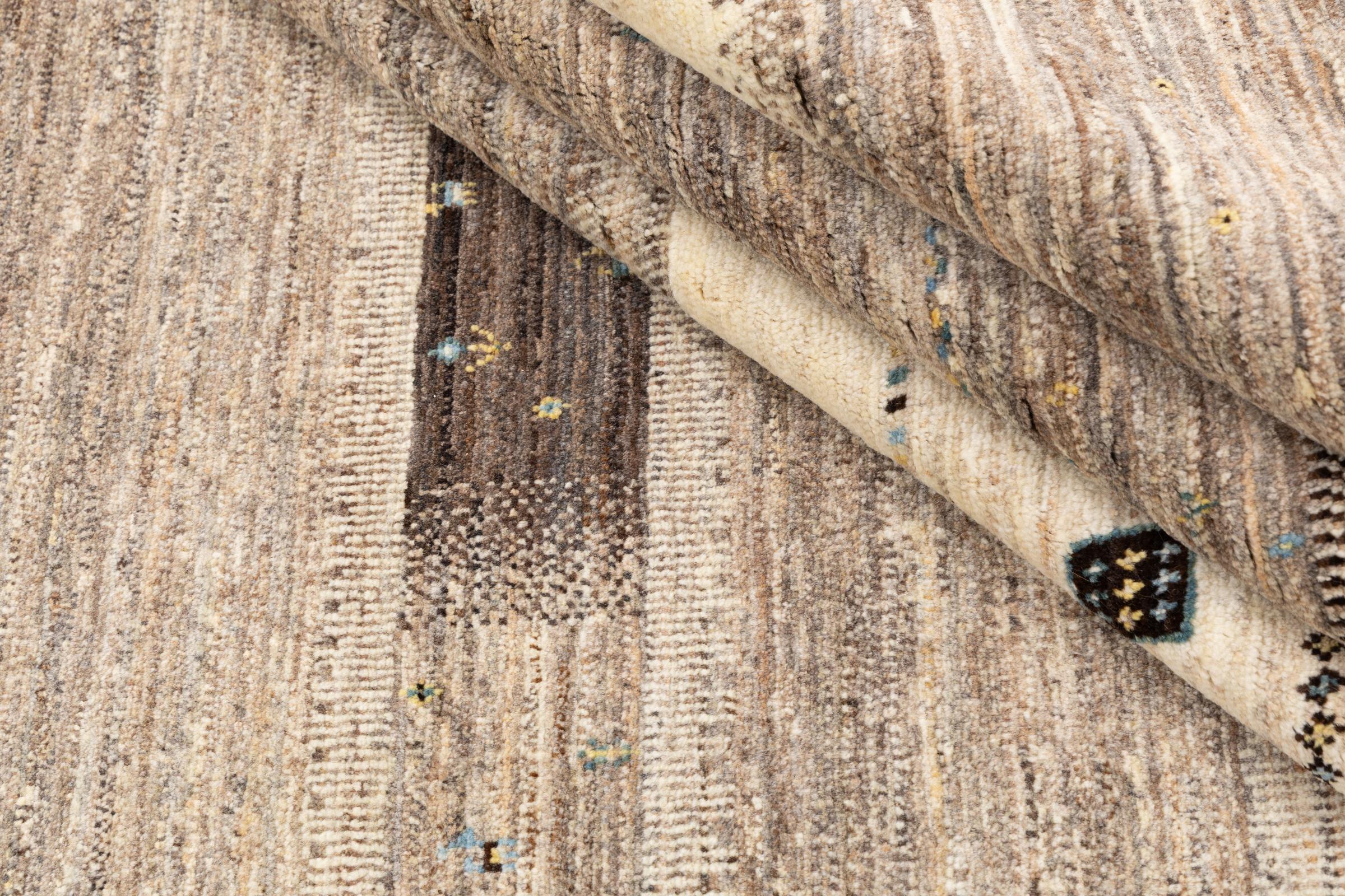This beautiful rug is a Persian Gabbeh, one of the highest quality Gabbeh rugs available. These rugs are hand-knotted by nomads or semi-nomads in Iran using traditional artisan techniques. The simple motifs and patterns are often inspired by the nomads' immediate surroundings, featuring elements like camels, trees, or bushes. Persian Gabbeh carpets are made from wool sourced from locally raised sheep herds, with the wool typically spun by hand. Thus each of these Oriental rugs thus embodies a unique character steeped in centuries-old culture.