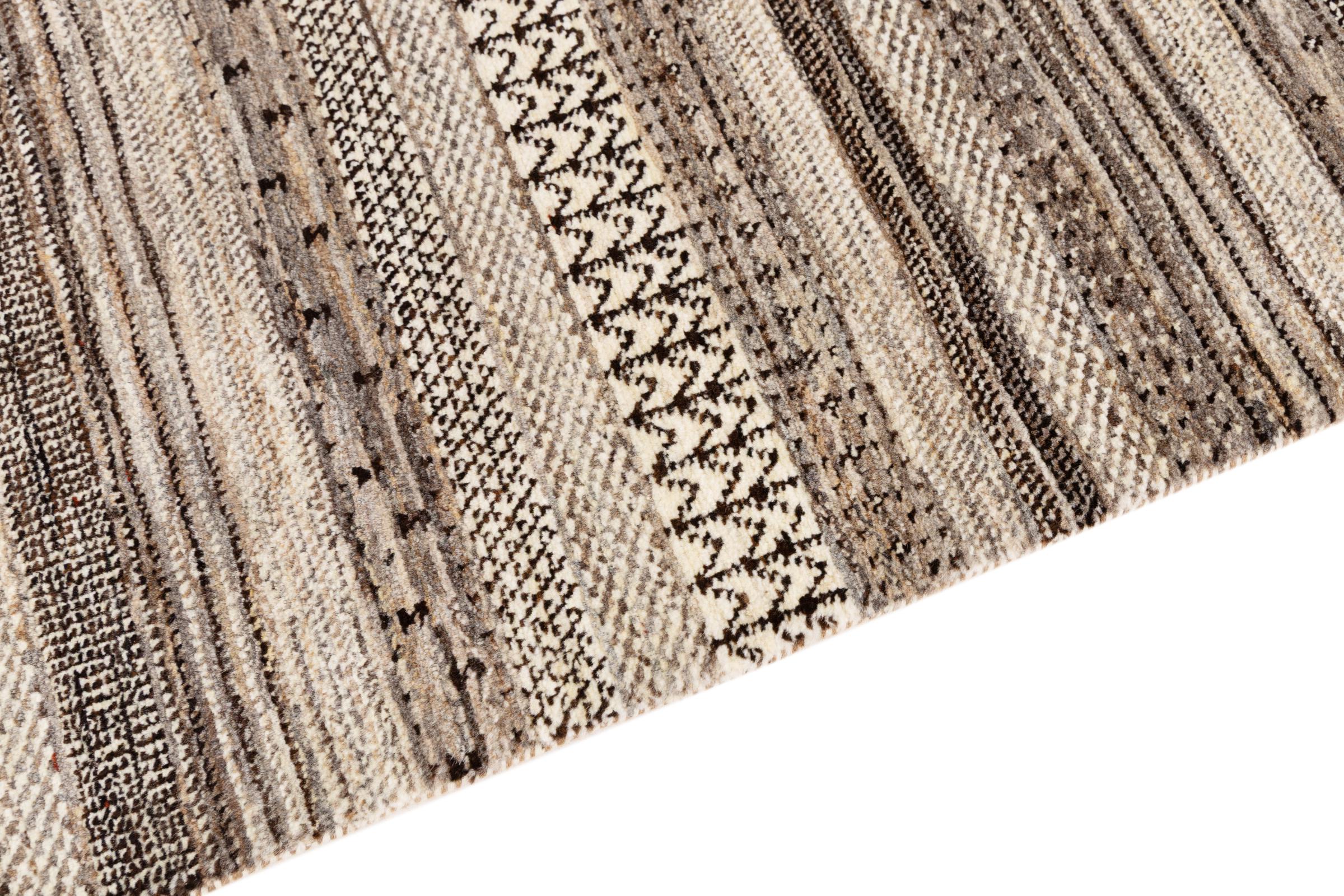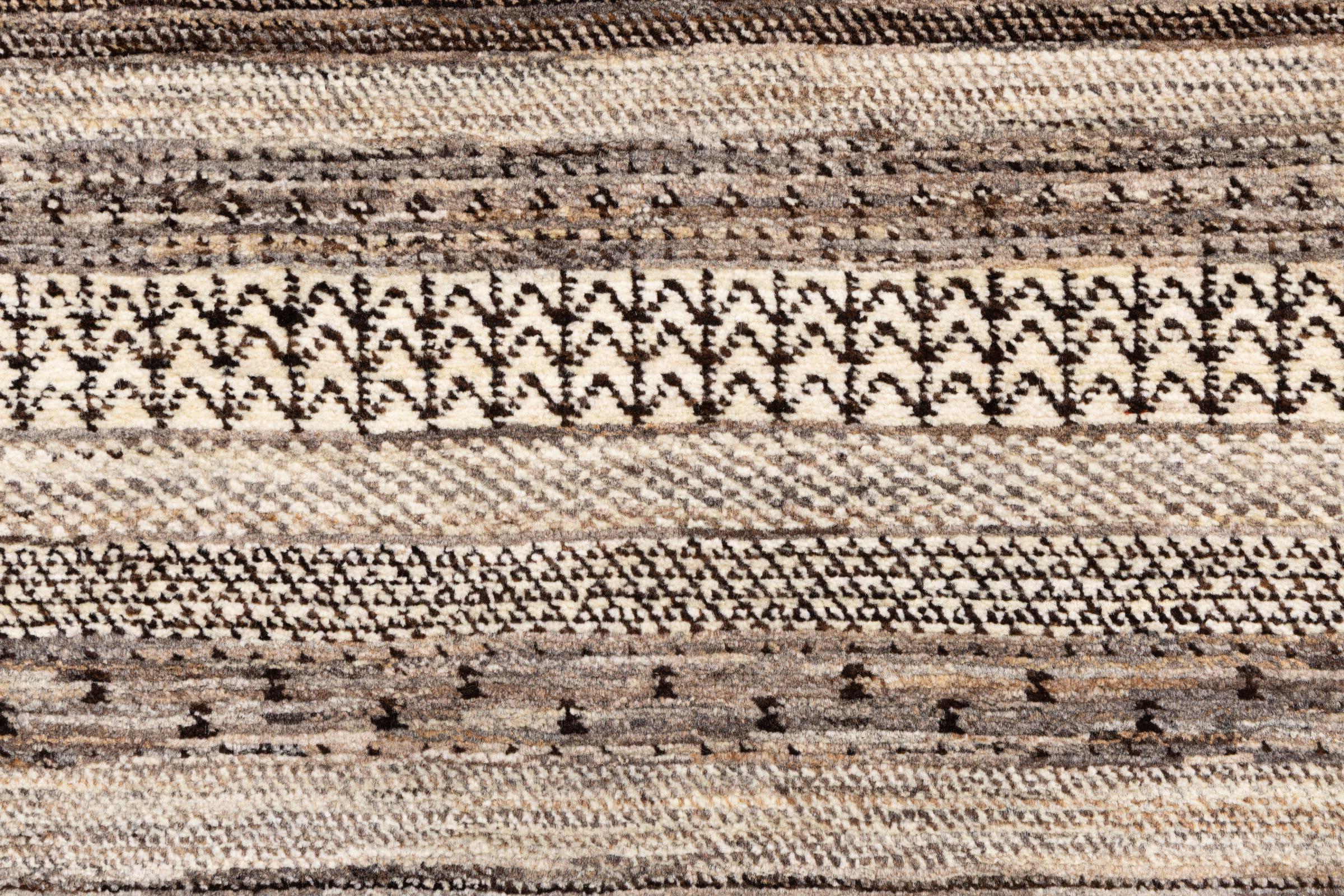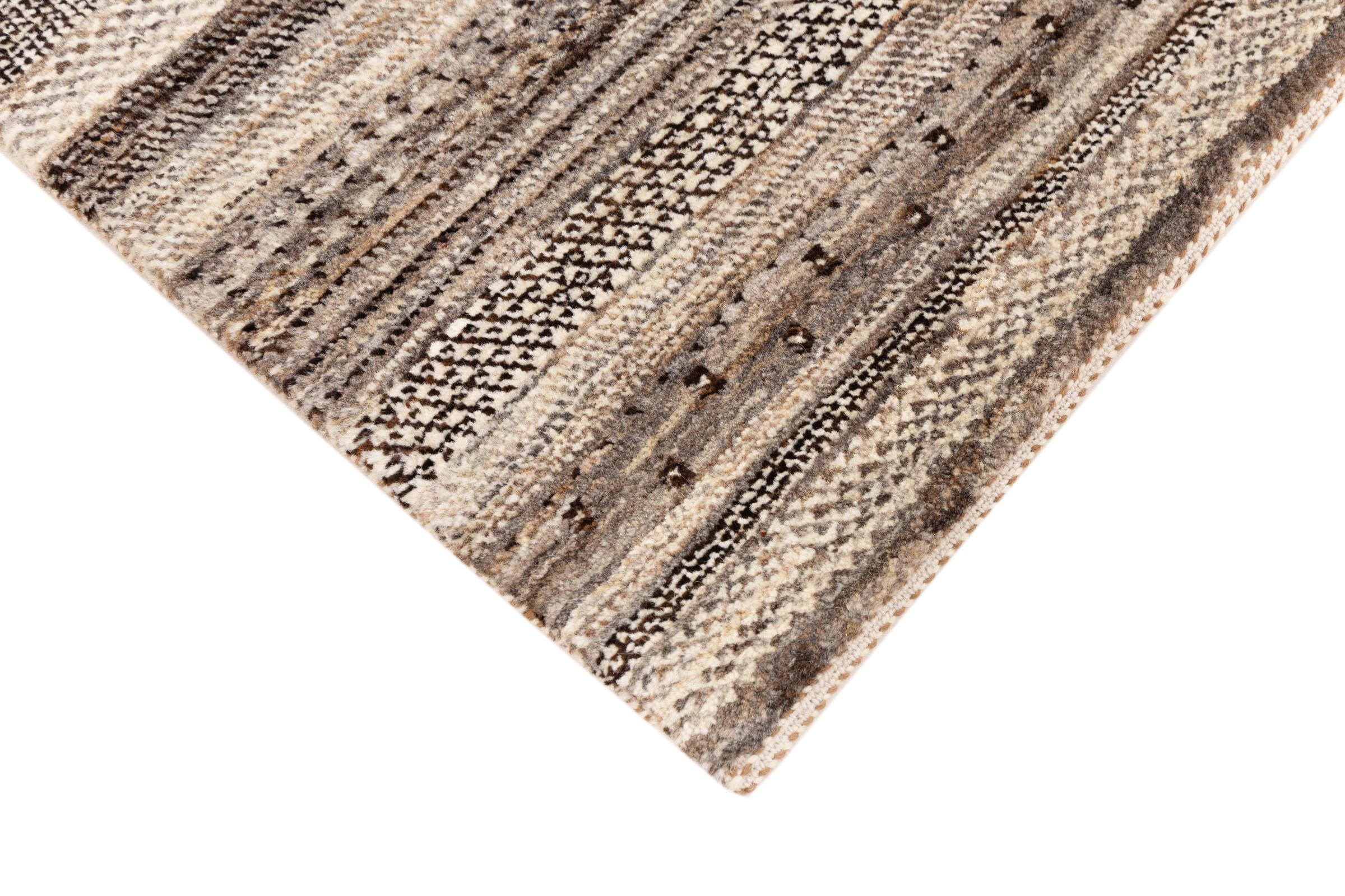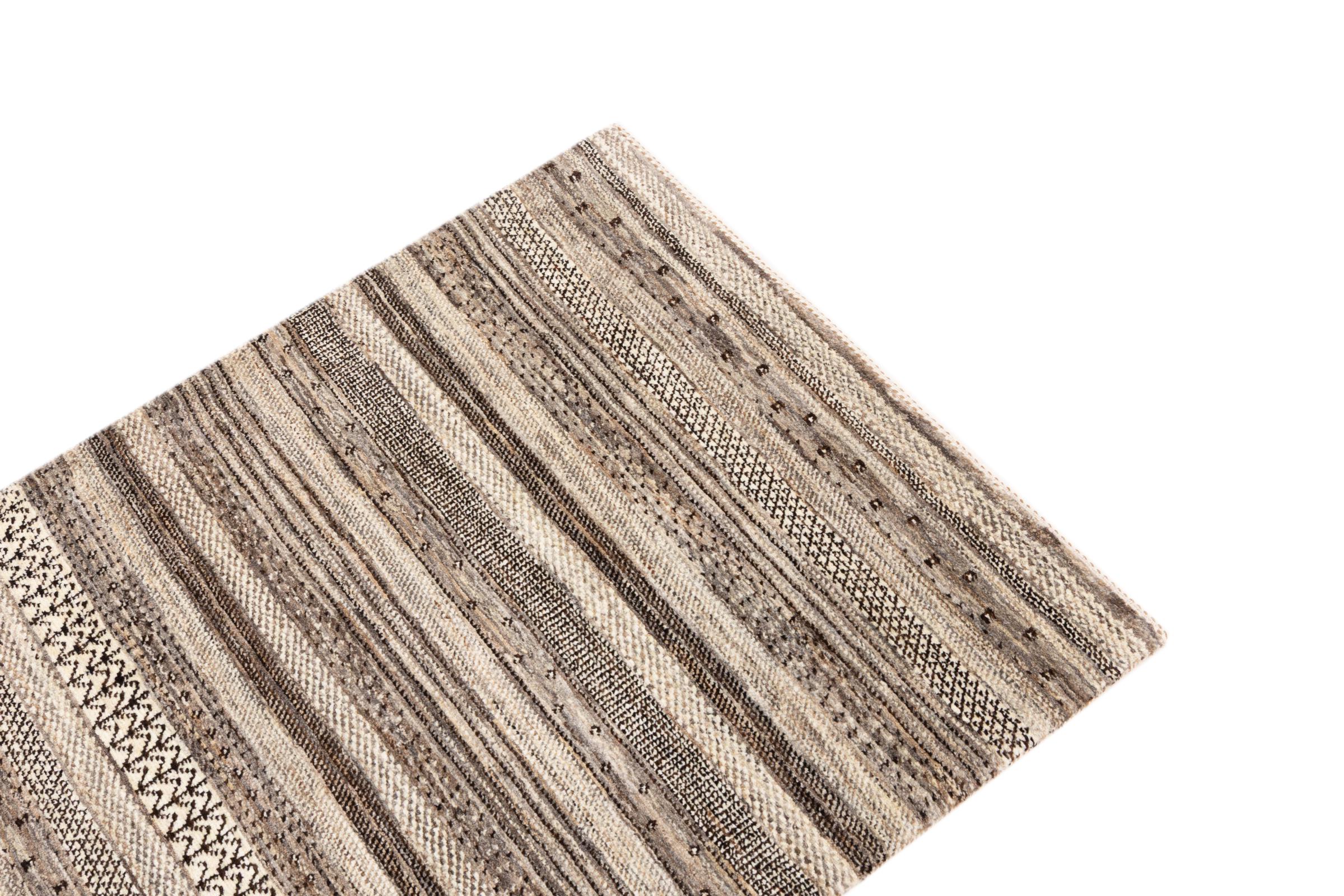 This beautiful rug is a Persian Gabbeh, one of the highest quality Gabbeh rugs available. These rugs are hand-knotted by nomads or semi-nomads in Iran using traditional artisan techniques. The simple motifs and patterns are often inspired by the nomads' immediate surroundings, featuring elements like camels, trees, or bushes. Persian Gabbeh carpets are made from wool sourced from locally raised sheep herds, with the wool typically spun by hand. Thus each of these Oriental rugs thus embodies a unique character steeped in centuries-old culture.