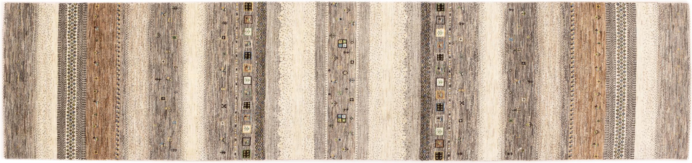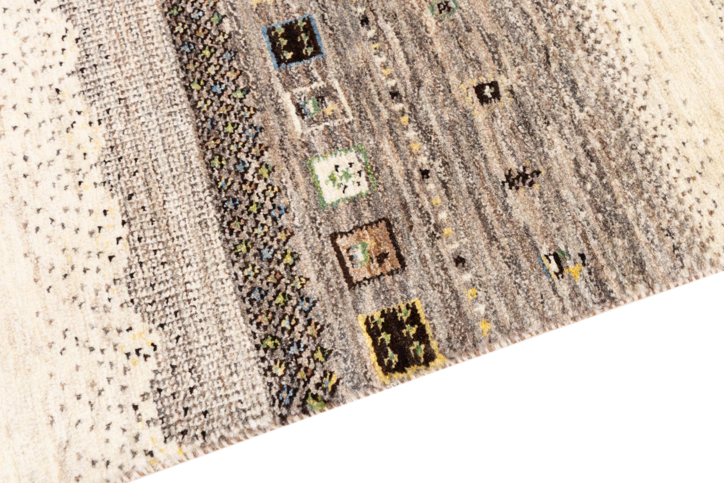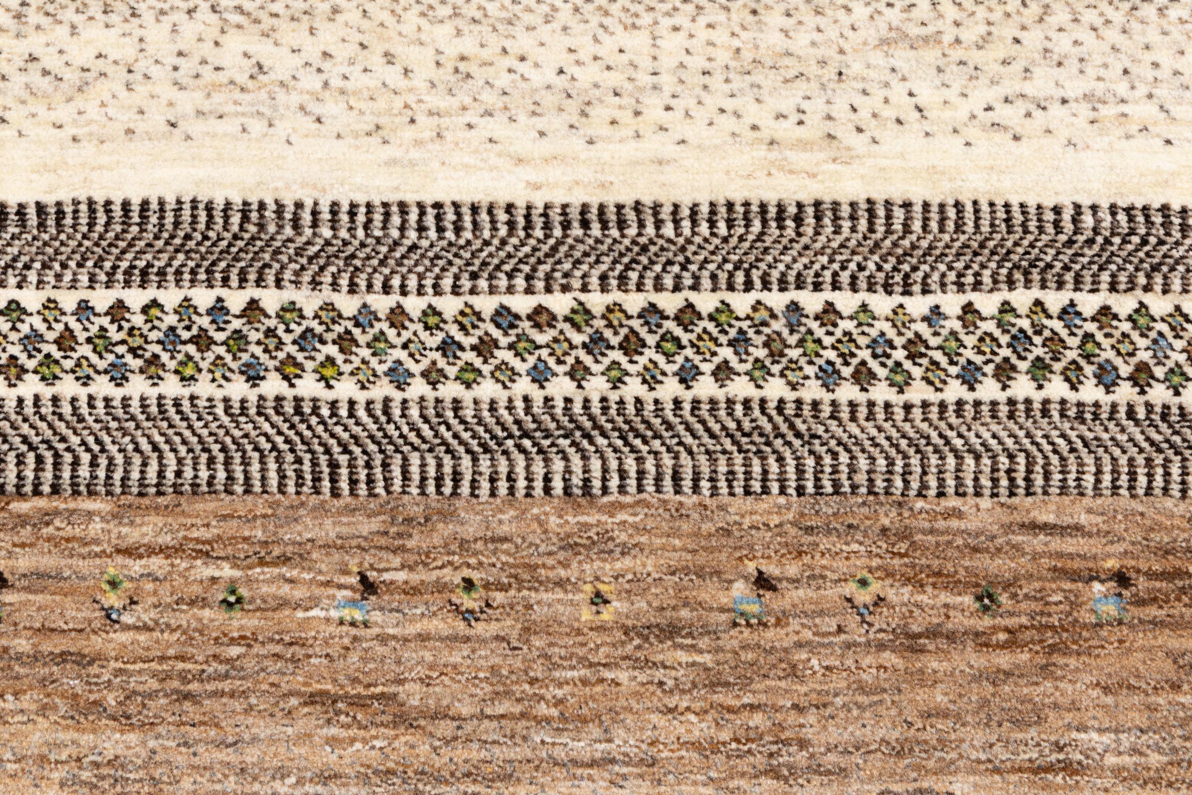 This beautiful rug is a Persian Gabbeh, one of the highest quality Gabbeh rugs available. These rugs are hand-knotted by nomads or semi-nomads in Iran using traditional artisan techniques. The simple motifs and patterns are often inspired by the nomads' immediate surroundings, featuring elements like camels, trees, or bushes. Persian Gabbeh carpets are made from wool sourced from locally raised sheep herds, with the wool typically spun by hand. Thus each of these Oriental rugs thus embodies a unique character steeped in centuries-old culture.