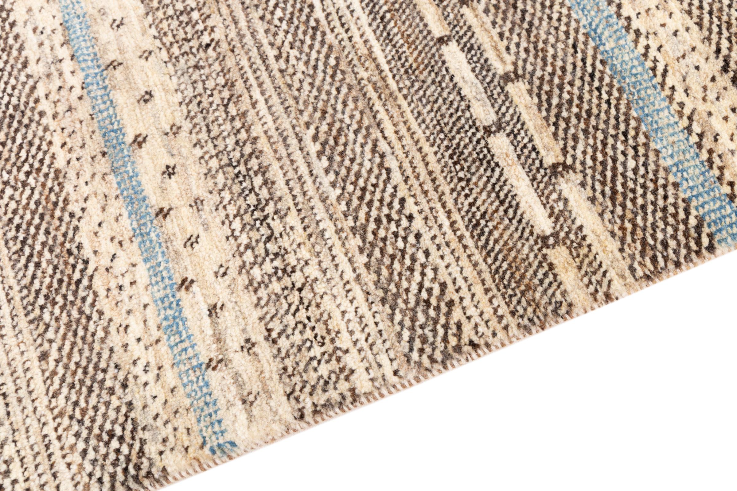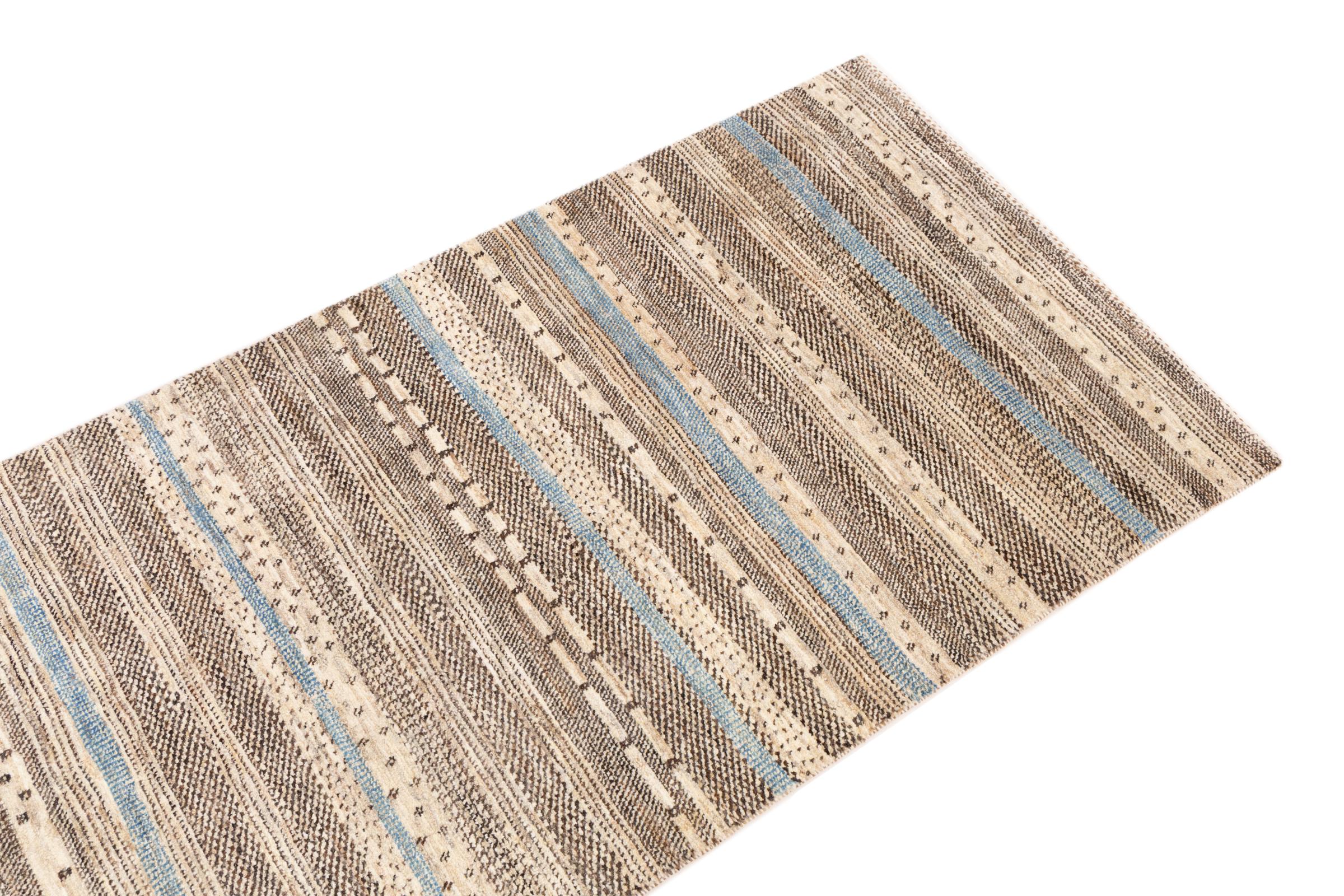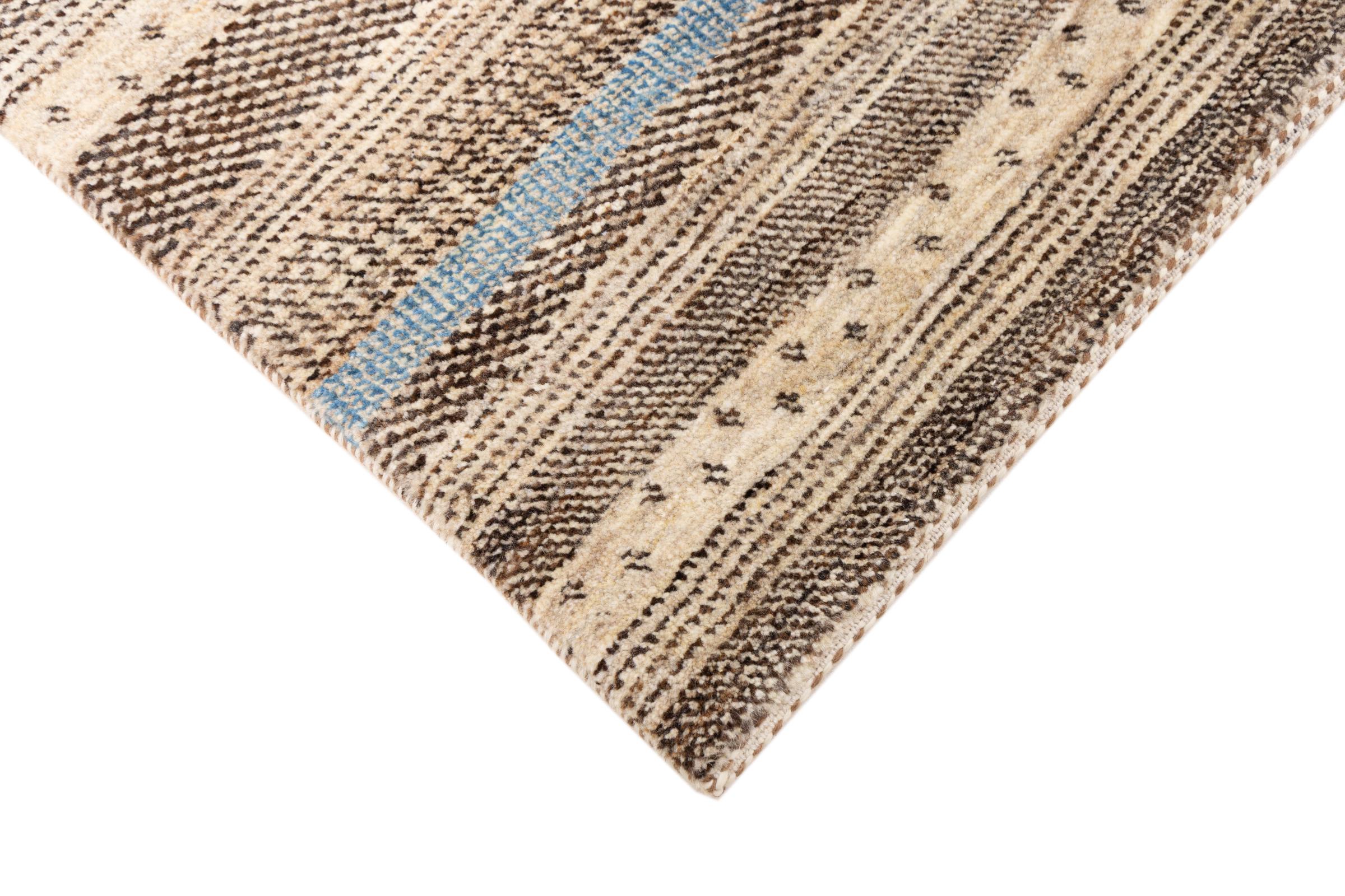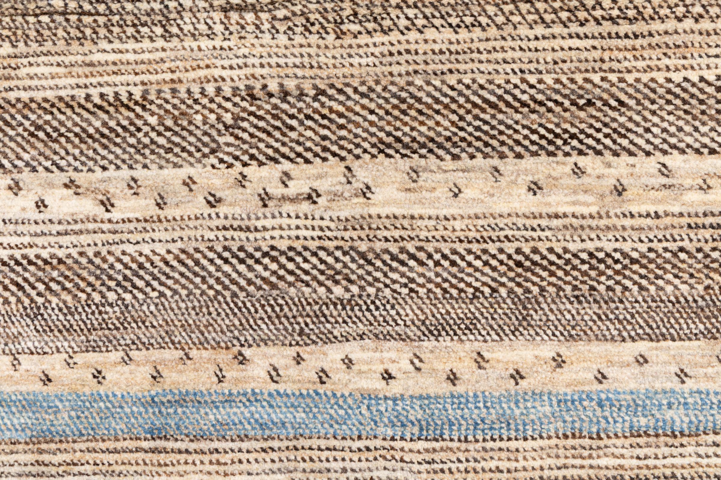 This beautiful rug is a Persian Gabbeh, one of the highest quality Gabbeh rugs available. These rugs are hand-knotted by nomads or semi-nomads in Iran using traditional artisan techniques. The simple motifs and patterns are often inspired by the nomads' immediate surroundings, featuring elements like camels, trees, or bushes. Persian Gabbeh carpets are made from wool sourced from locally raised sheep herds, with the wool typically spun by hand. Thus each of these Oriental rugs thus embodies a unique character steeped in centuries-old culture.