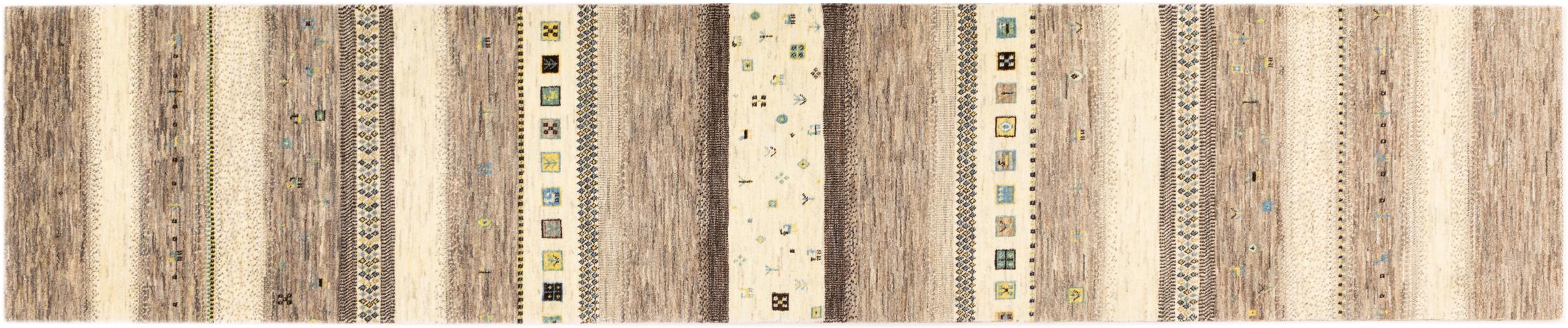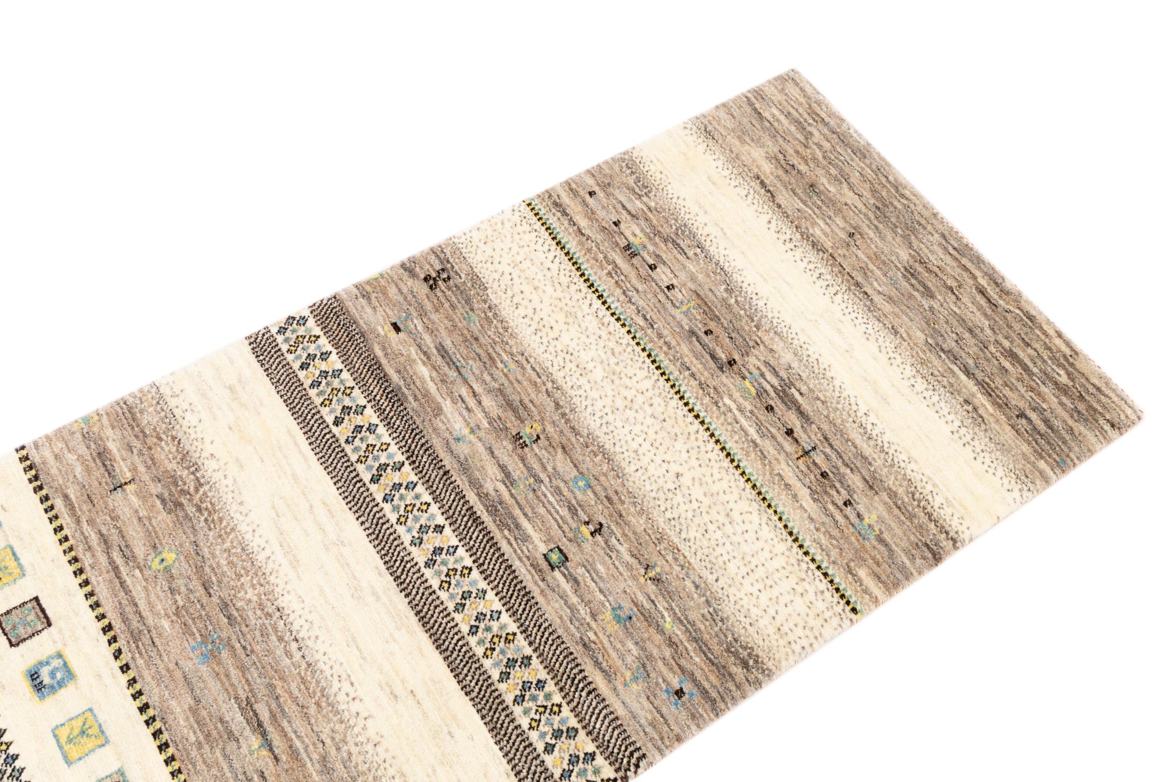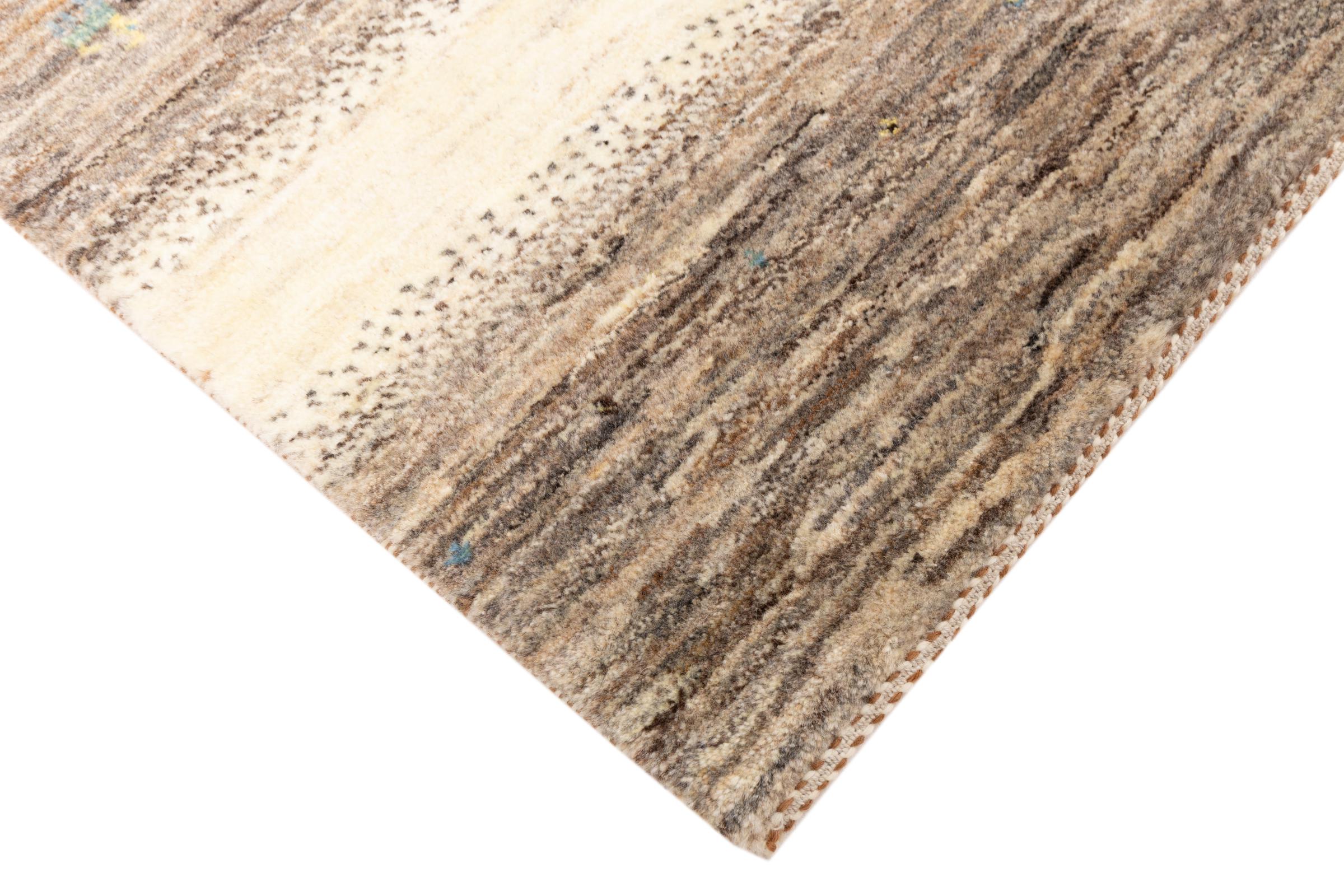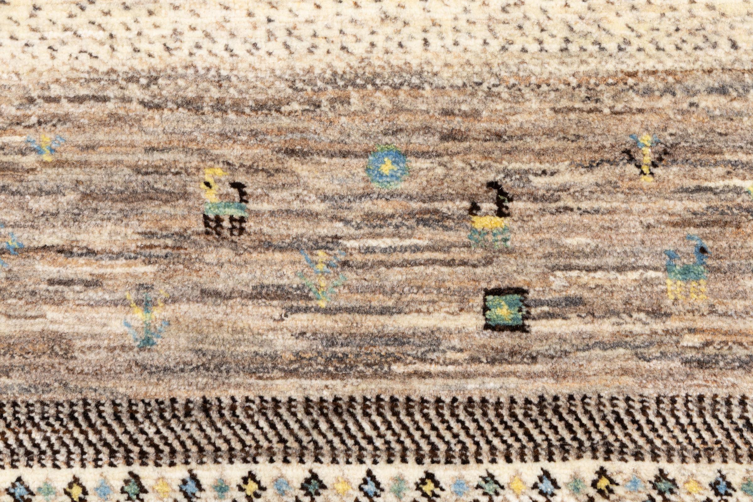 This beautiful rug is a Persian Gabbeh, one of the highest quality Gabbeh rugs available. These rugs are hand-knotted by nomads or semi-nomads in Iran using traditional artisan techniques. The simple motifs and patterns are often inspired by the nomads' immediate surroundings, featuring elements like camels, trees, or bushes. Persian Gabbeh carpets are made from wool sourced from locally raised sheep herds, with the wool typically spun by hand. Thus each of these Oriental rugs thus embodies a unique character steeped in centuries-old culture.