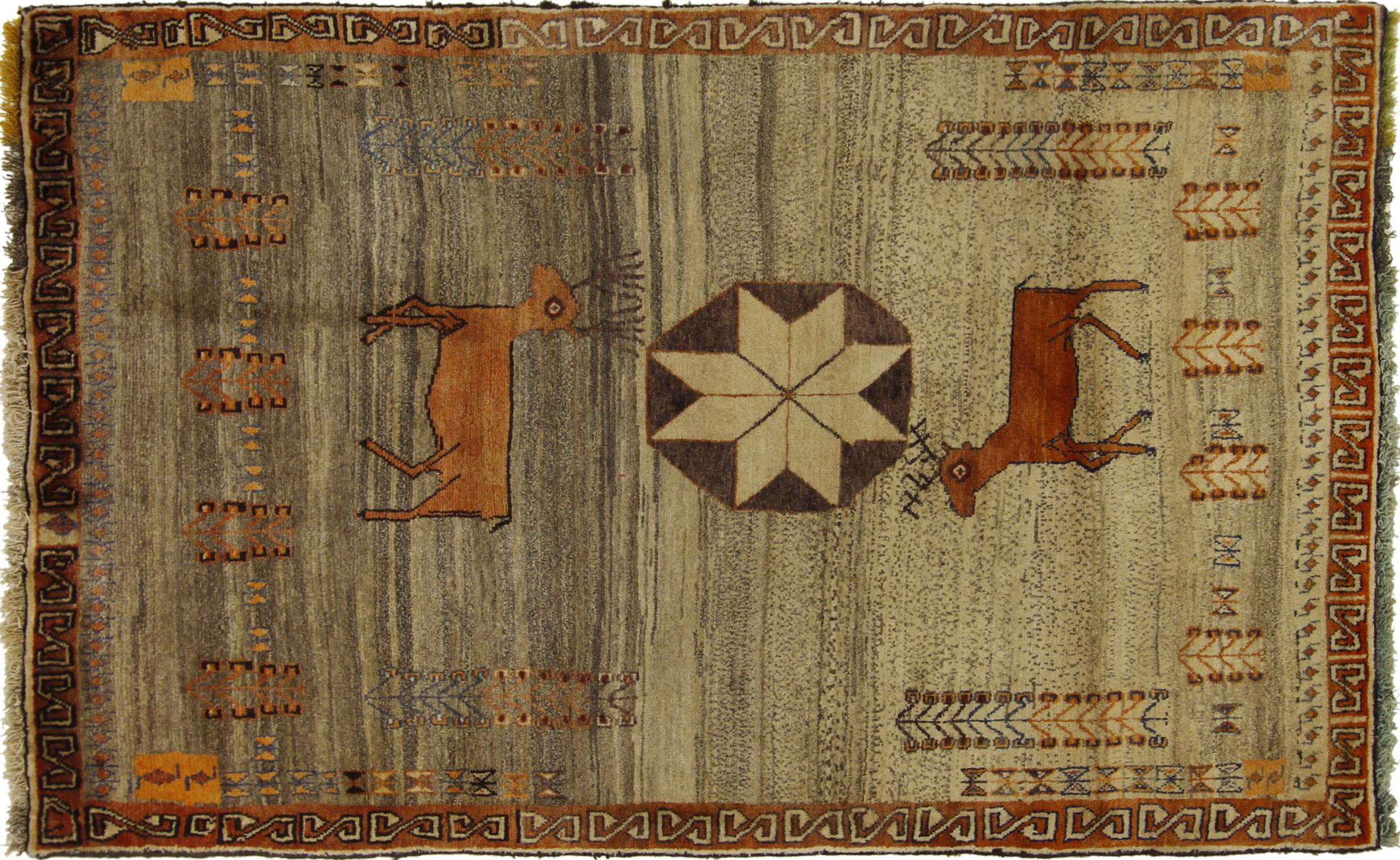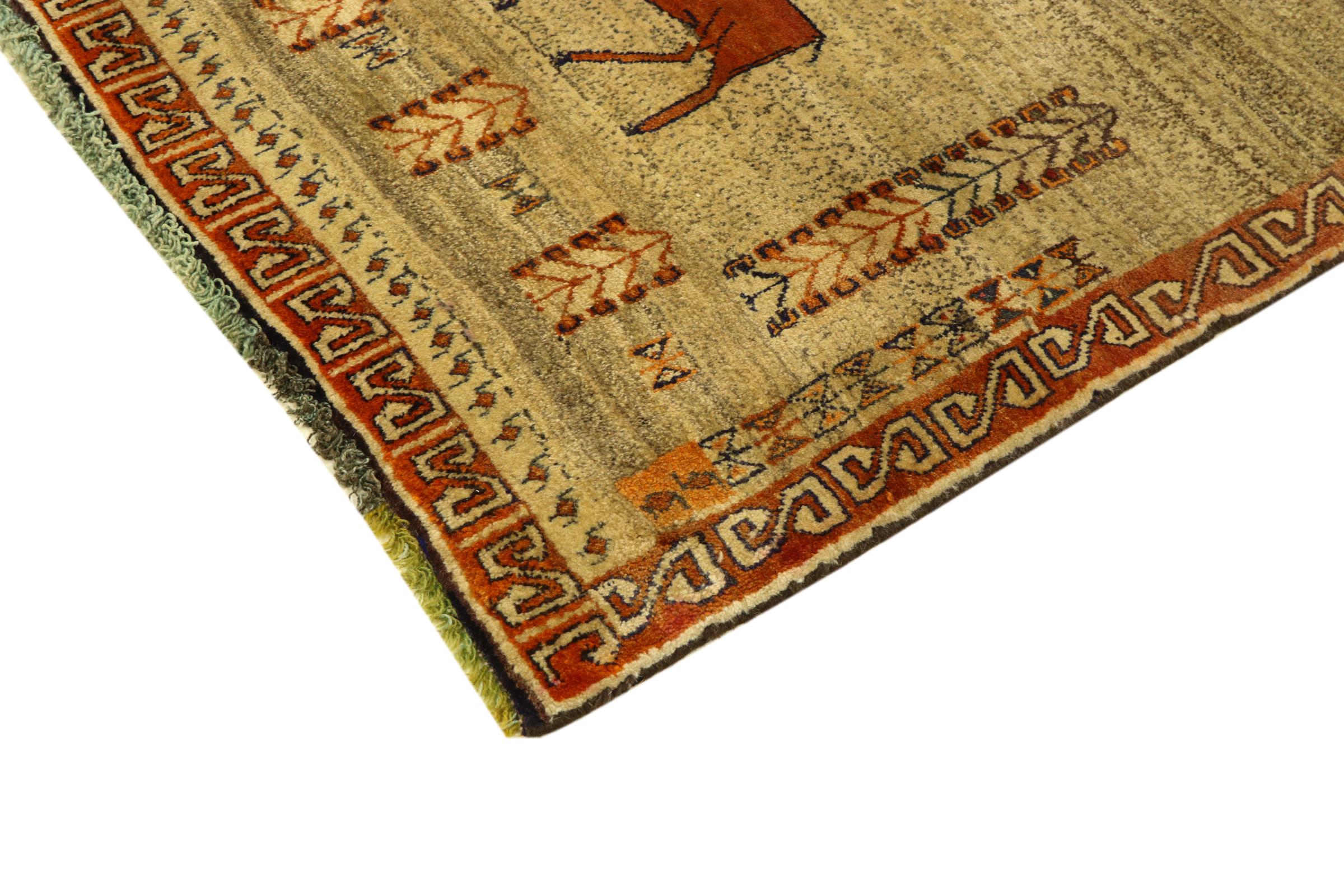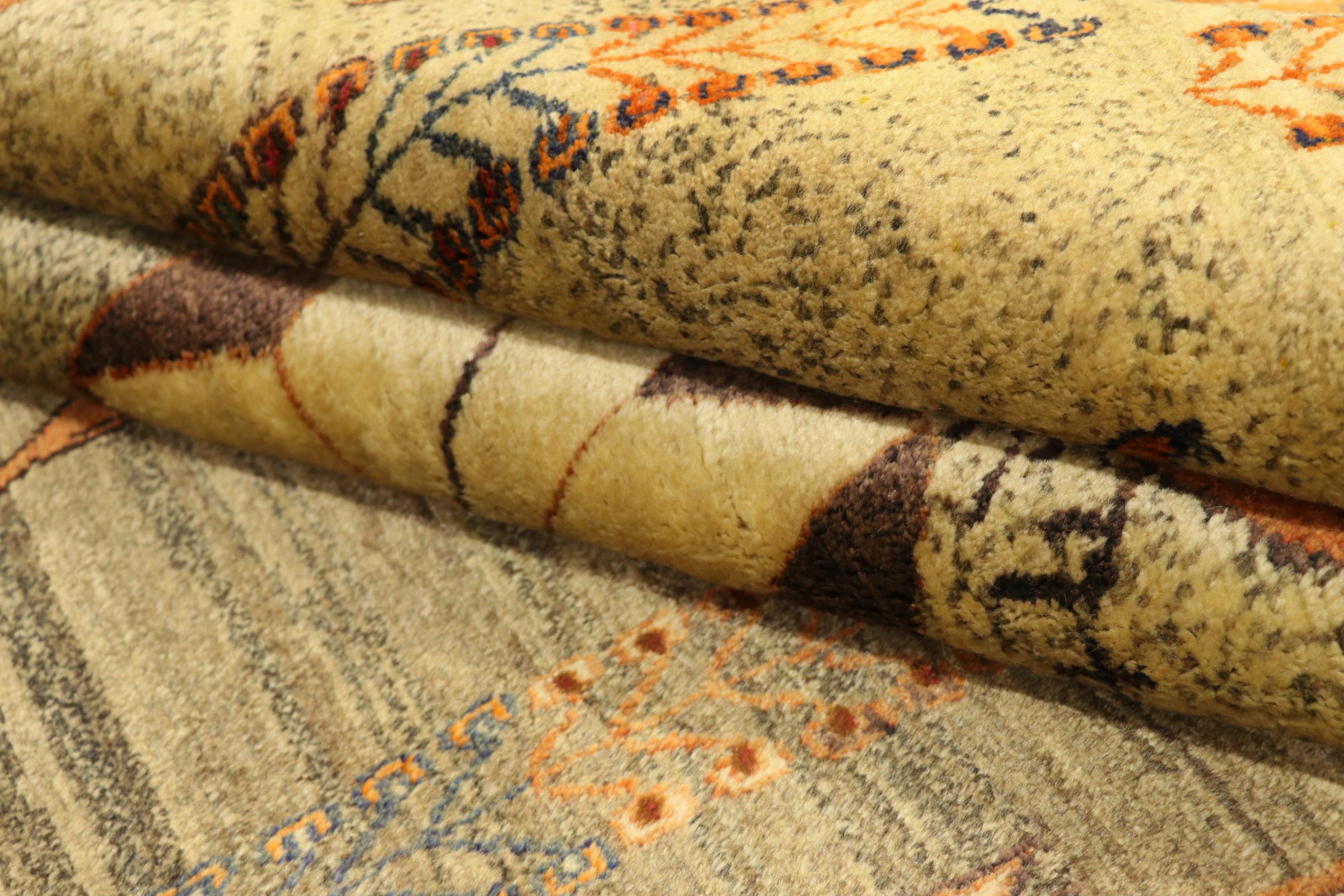 This beautiful rug is a Persian Gabbeh, one of the highest quality Gabbeh rugs available. These rugs are hand-knotted by nomads or semi-nomads in Iran using traditional artisan techniques. The simple motifs and patterns are often inspired by the nomads' immediate surroundings, featuring elements like camels, trees, or bushes. Persian Gabbeh carpets are made from wool sourced from locally raised sheep herds, with the wool typically spun by hand. Thus each of these Oriental rugs thus embodies a unique character steeped in centuries-old culture.