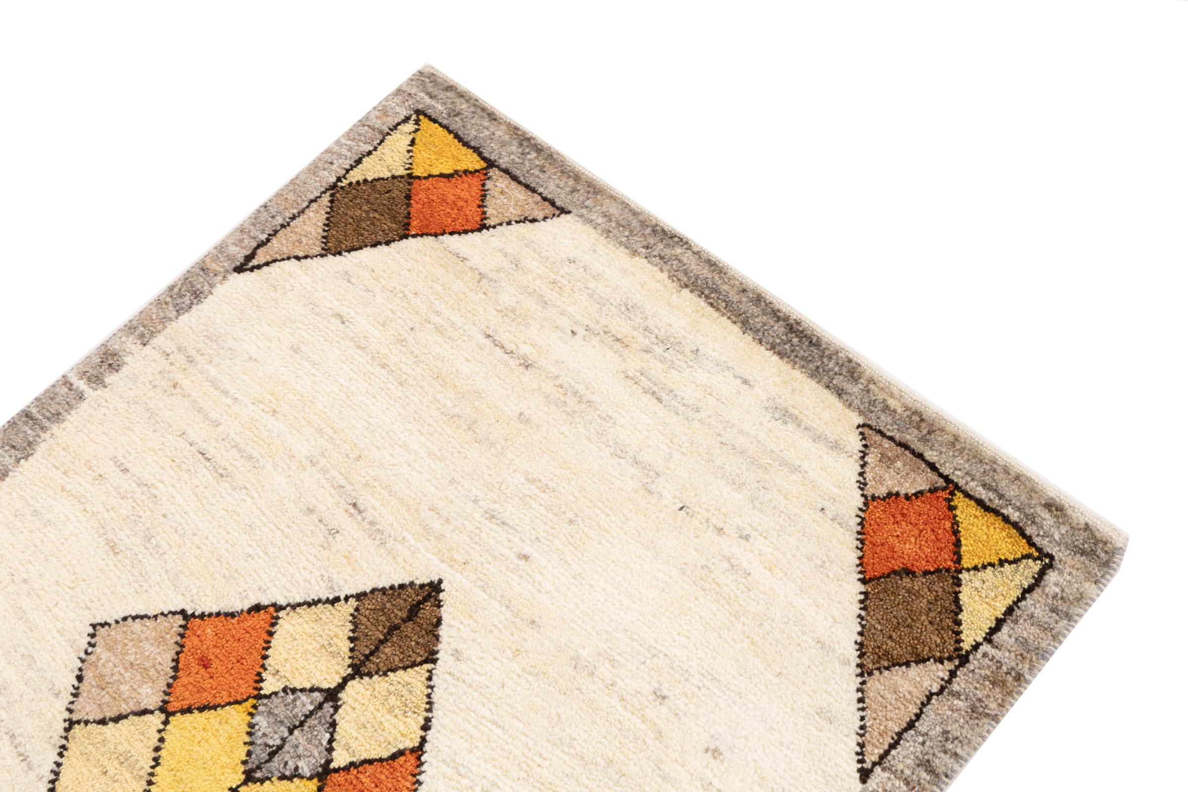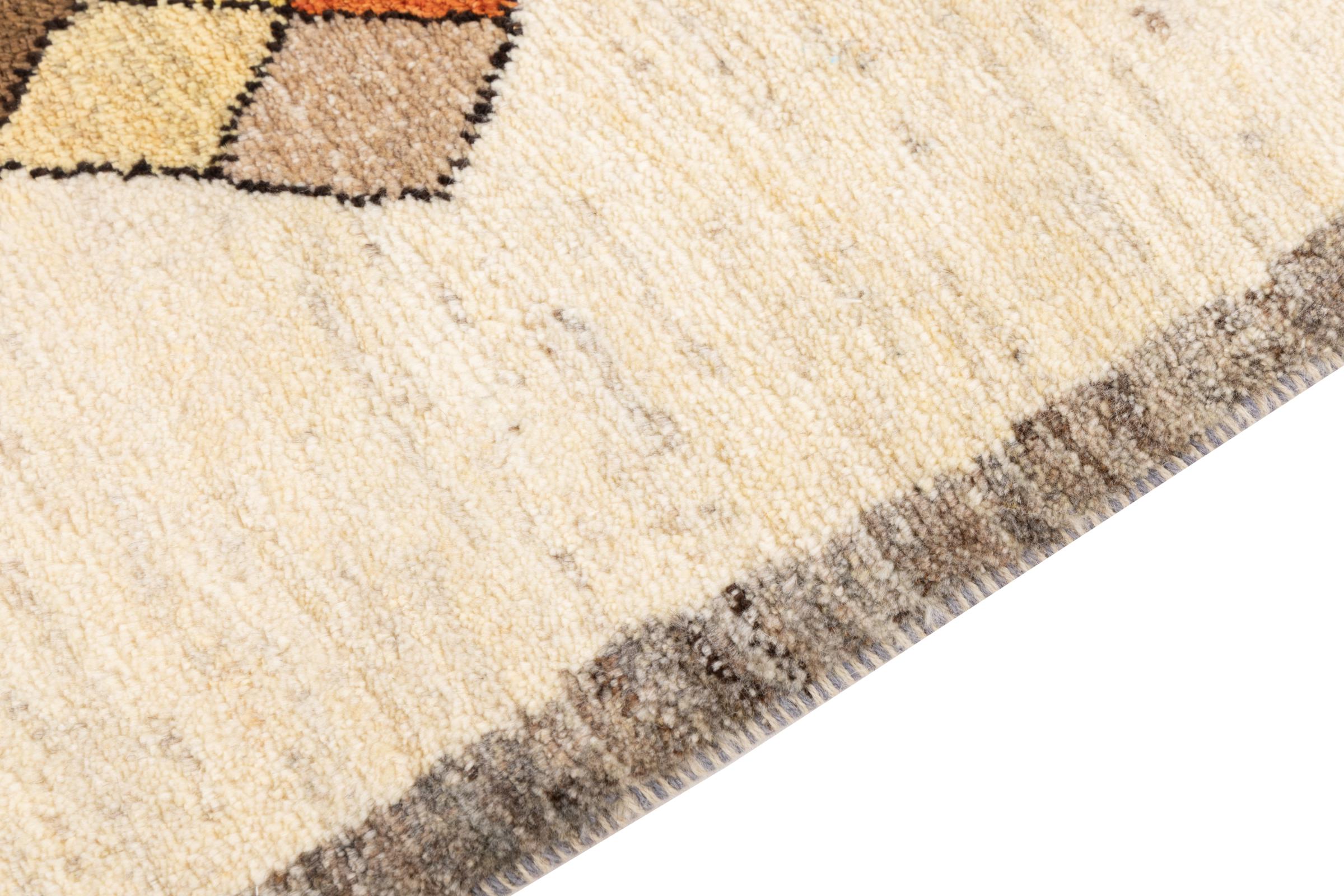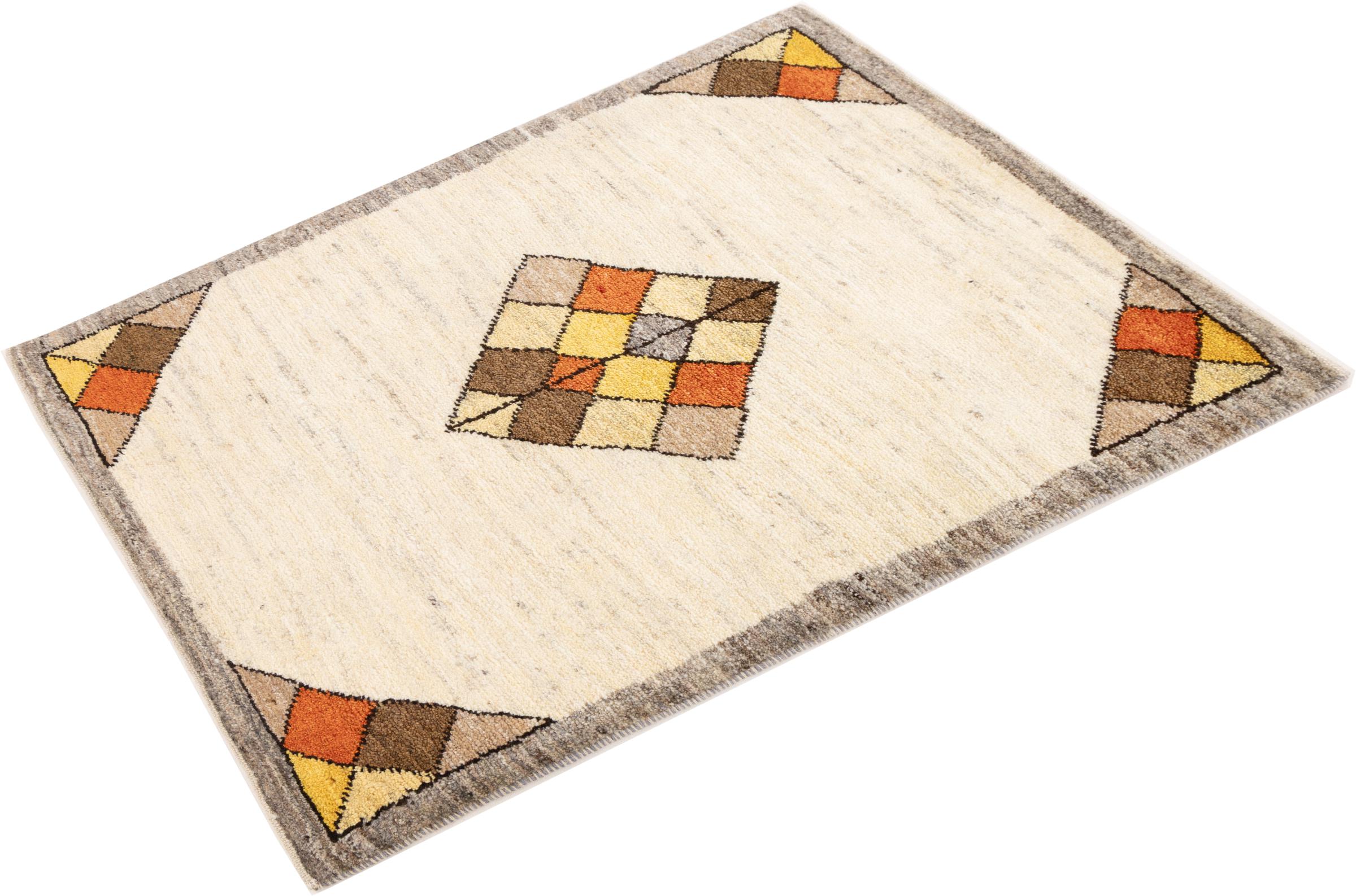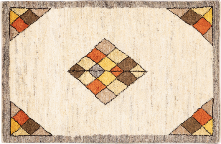This beautiful rug is a Persian Gabbeh, one of the highest quality Gabbeh rugs available. These rugs are hand-knotted by nomads or semi-nomads in Iran using traditional artisan techniques. The simple motifs and patterns are often inspired by the nomads' immediate surroundings, featuring elements like camels, trees, or bushes. Persian Gabbeh carpets are made from wool sourced from locally raised sheep herds, with the wool typically spun by hand. Thus each of these Oriental rugs thus embodies a unique character steeped in centuries-old culture.