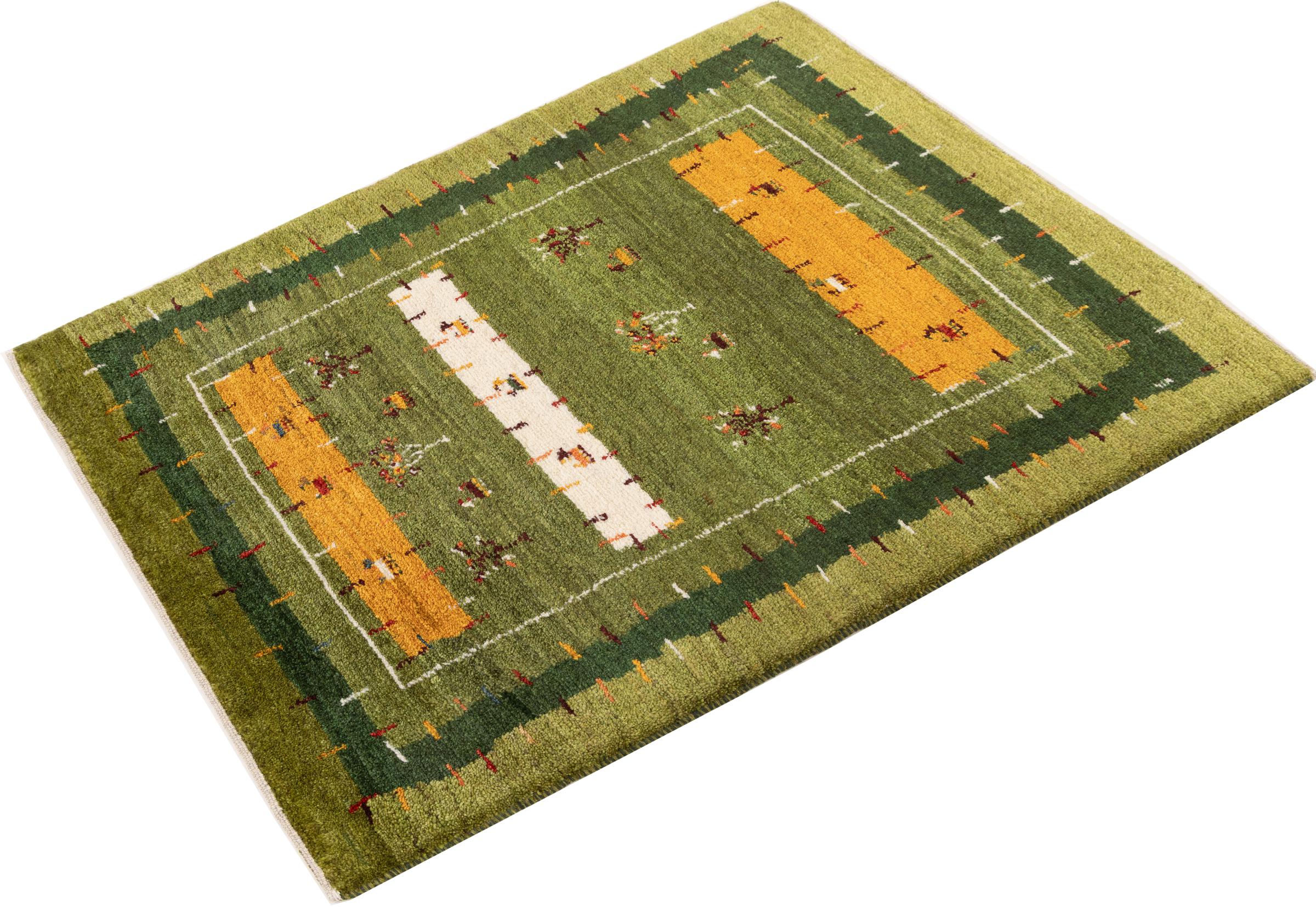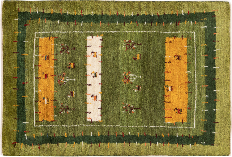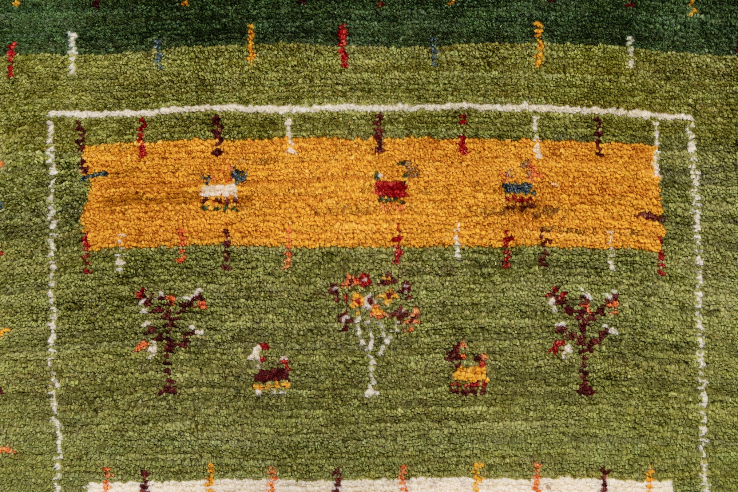 This beautiful rug is a Persian Gabbeh, one of the highest quality Gabbeh rugs available. These rugs are hand-knotted by nomads or semi-nomads in Iran using traditional artisan techniques. The simple motifs and patterns are often inspired by the nomads' immediate surroundings, featuring elements like camels, trees, or bushes. Persian Gabbeh carpets are made from wool sourced from locally raised sheep herds, with the wool typically spun by hand. Thus each of these Oriental rugs thus embodies a unique character steeped in centuries-old culture.