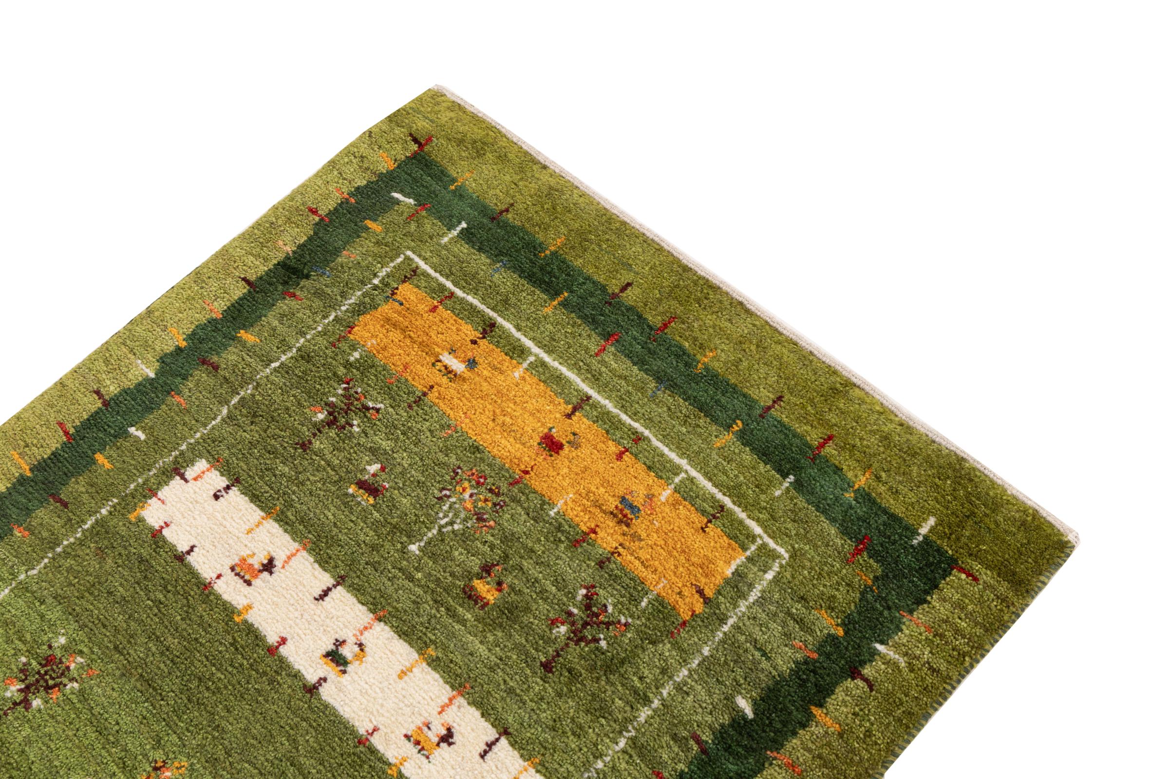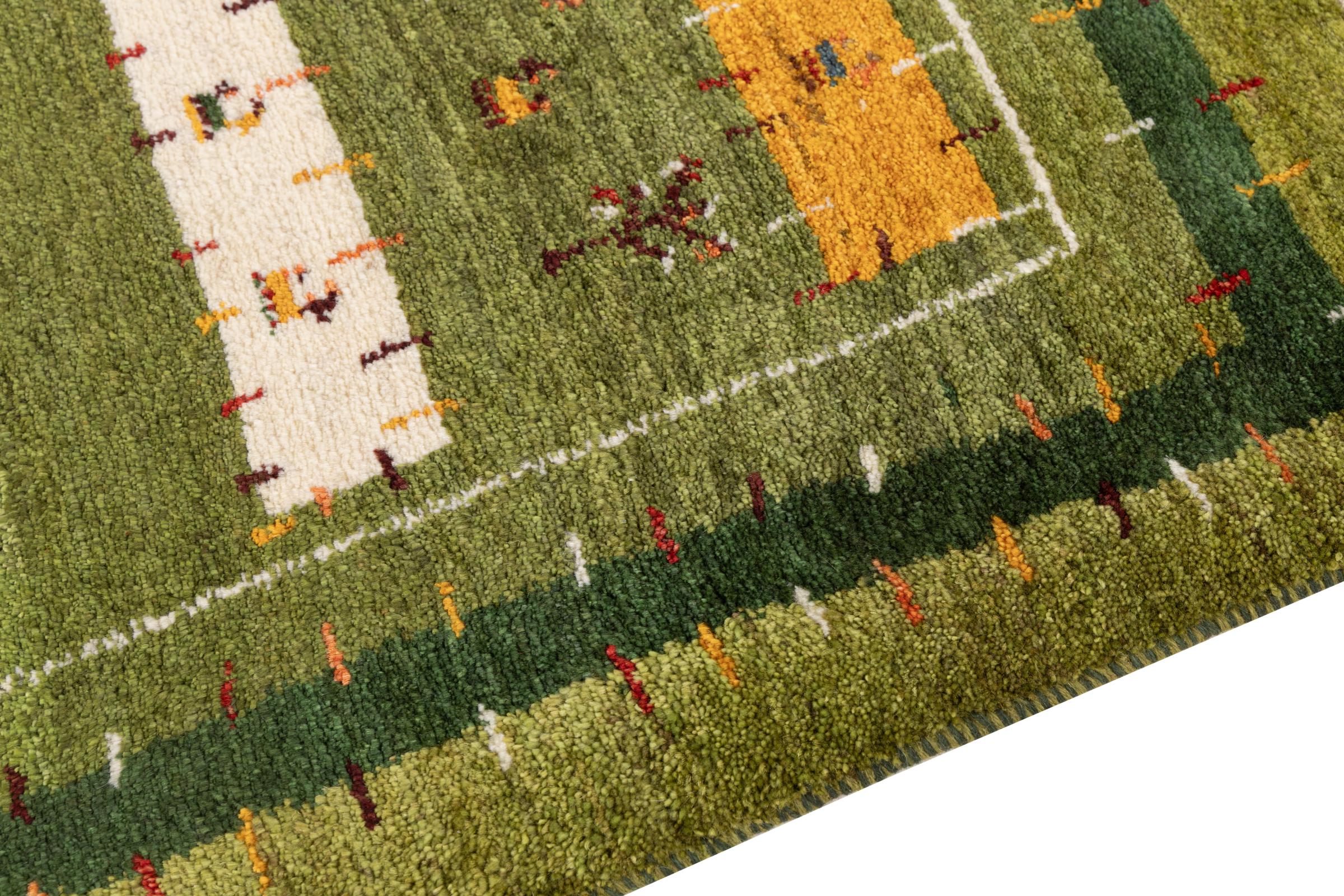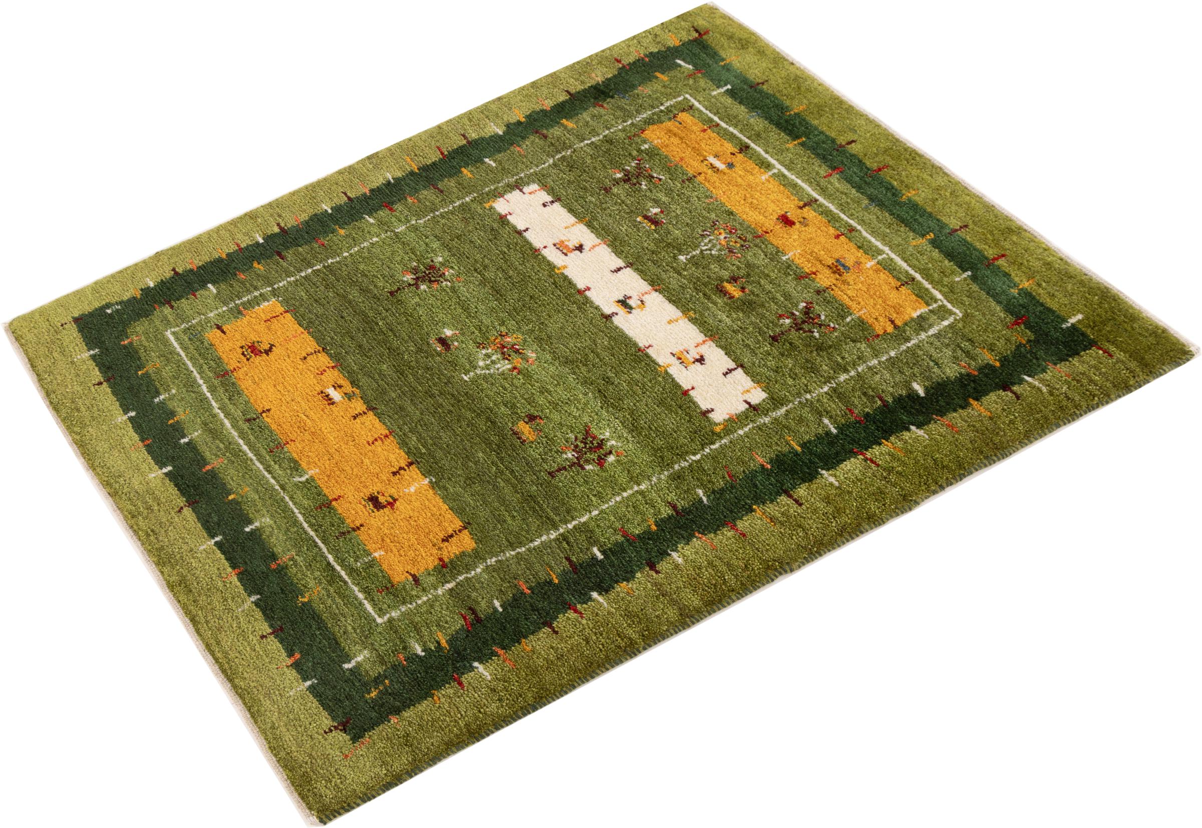 This beautiful rug is a Persian Gabbeh, one of the highest quality Gabbeh rugs available. These rugs are hand-knotted by nomads or semi-nomads in Iran using traditional artisan techniques. The simple motifs and patterns are often inspired by the nomads' immediate surroundings, featuring elements like camels, trees, or bushes. Persian Gabbeh carpets are made from wool sourced from locally raised sheep herds, with the wool typically spun by hand. Thus each of these Oriental rugs thus embodies a unique character steeped in centuries-old culture.