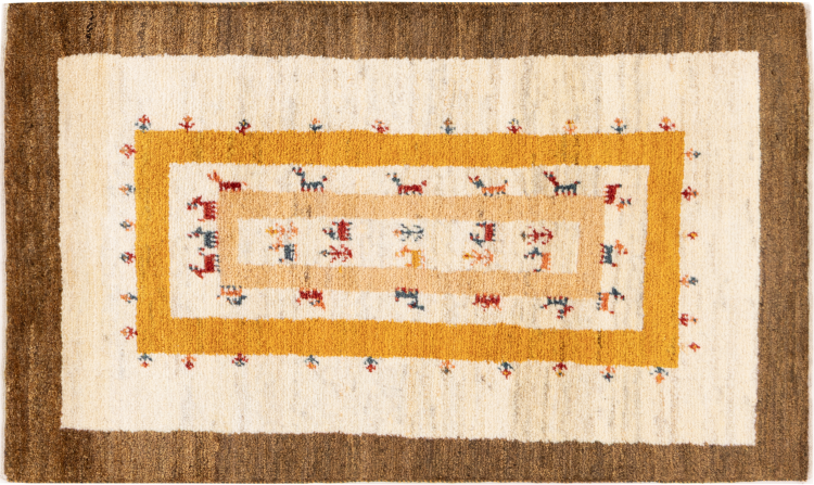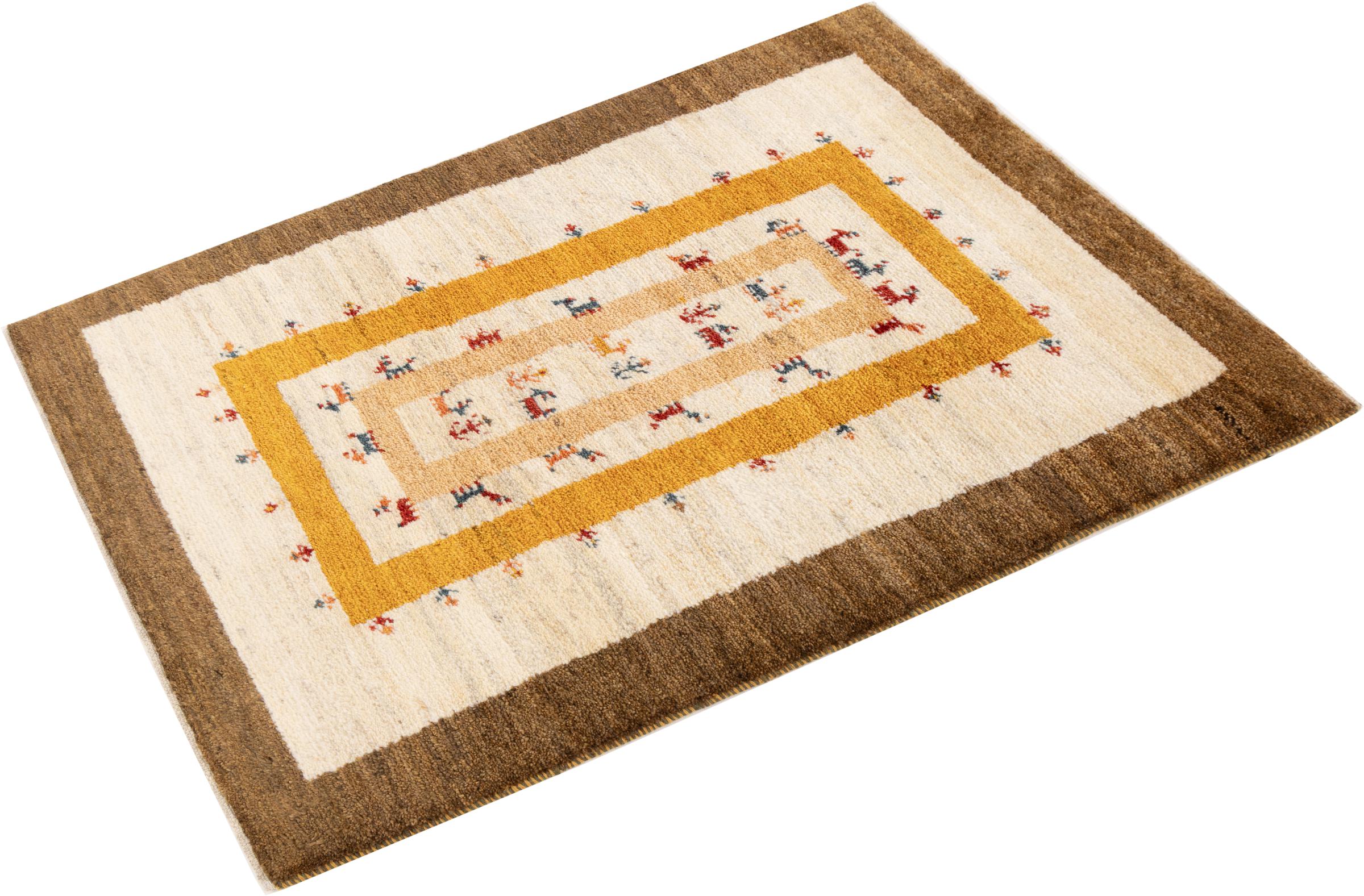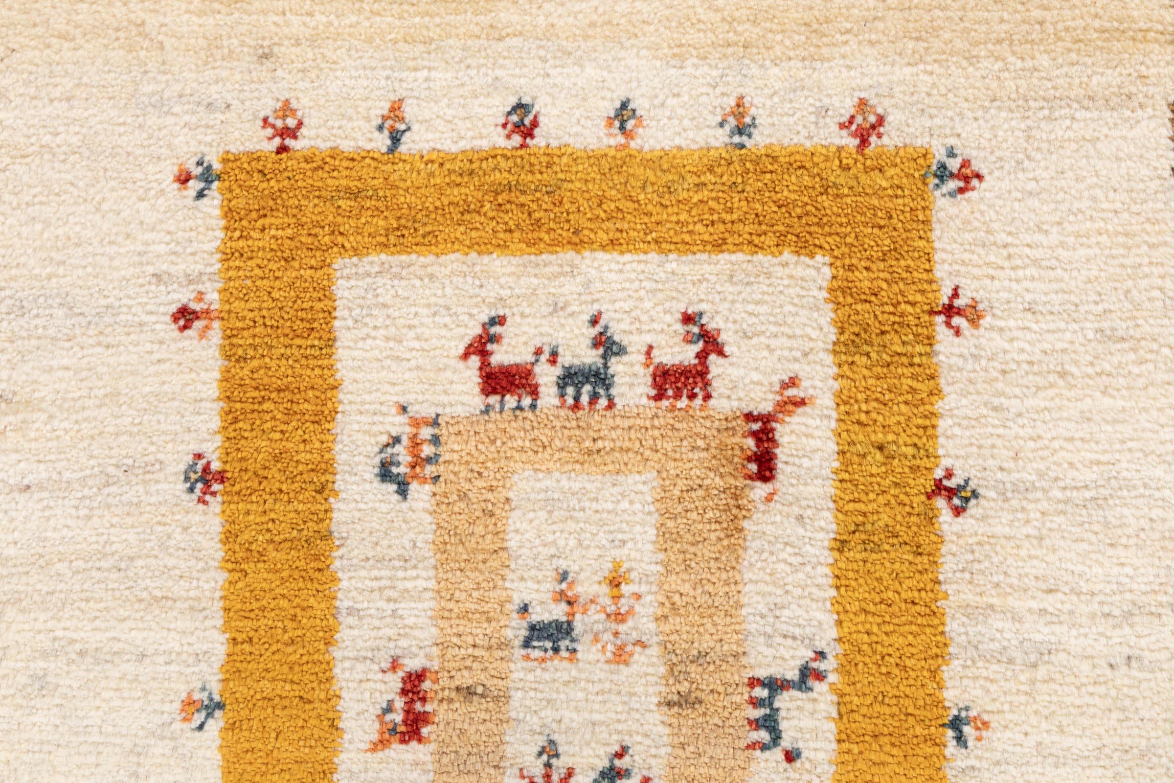 This beautiful rug is a Persian Gabbeh, one of the highest quality Gabbeh rugs available. These rugs are hand-knotted by nomads or semi-nomads in Iran using traditional artisan techniques. The simple motifs and patterns are often inspired by the nomads' immediate surroundings, featuring elements like camels, trees, or bushes. Persian Gabbeh carpets are made from wool sourced from locally raised sheep herds, with the wool typically spun by hand. Thus each of these Oriental rugs thus embodies a unique character steeped in centuries-old culture.