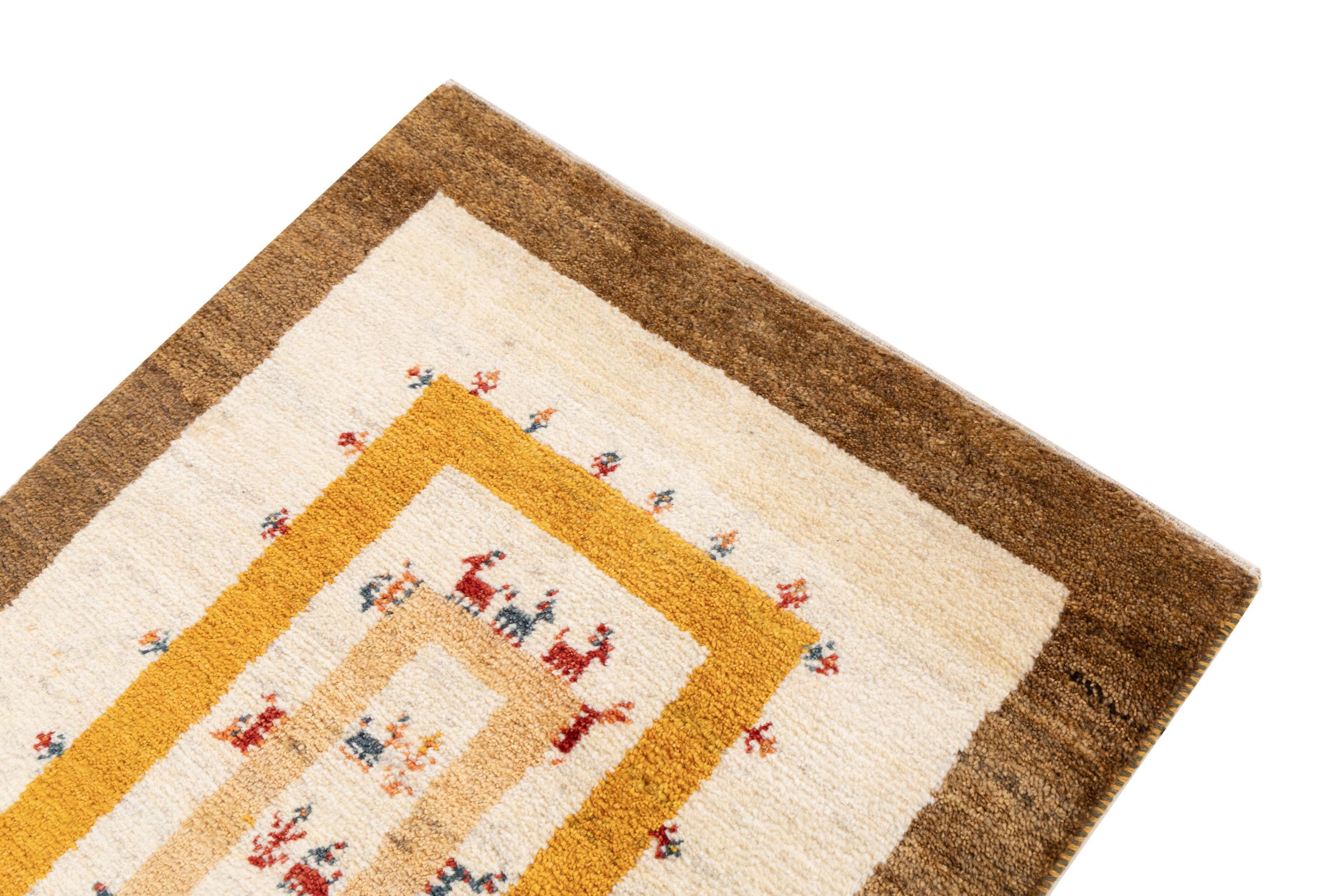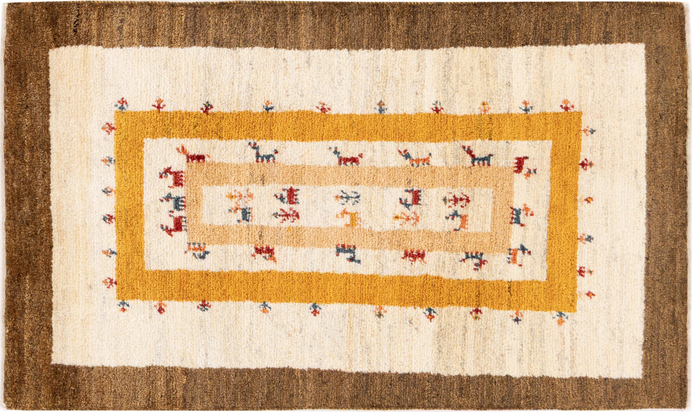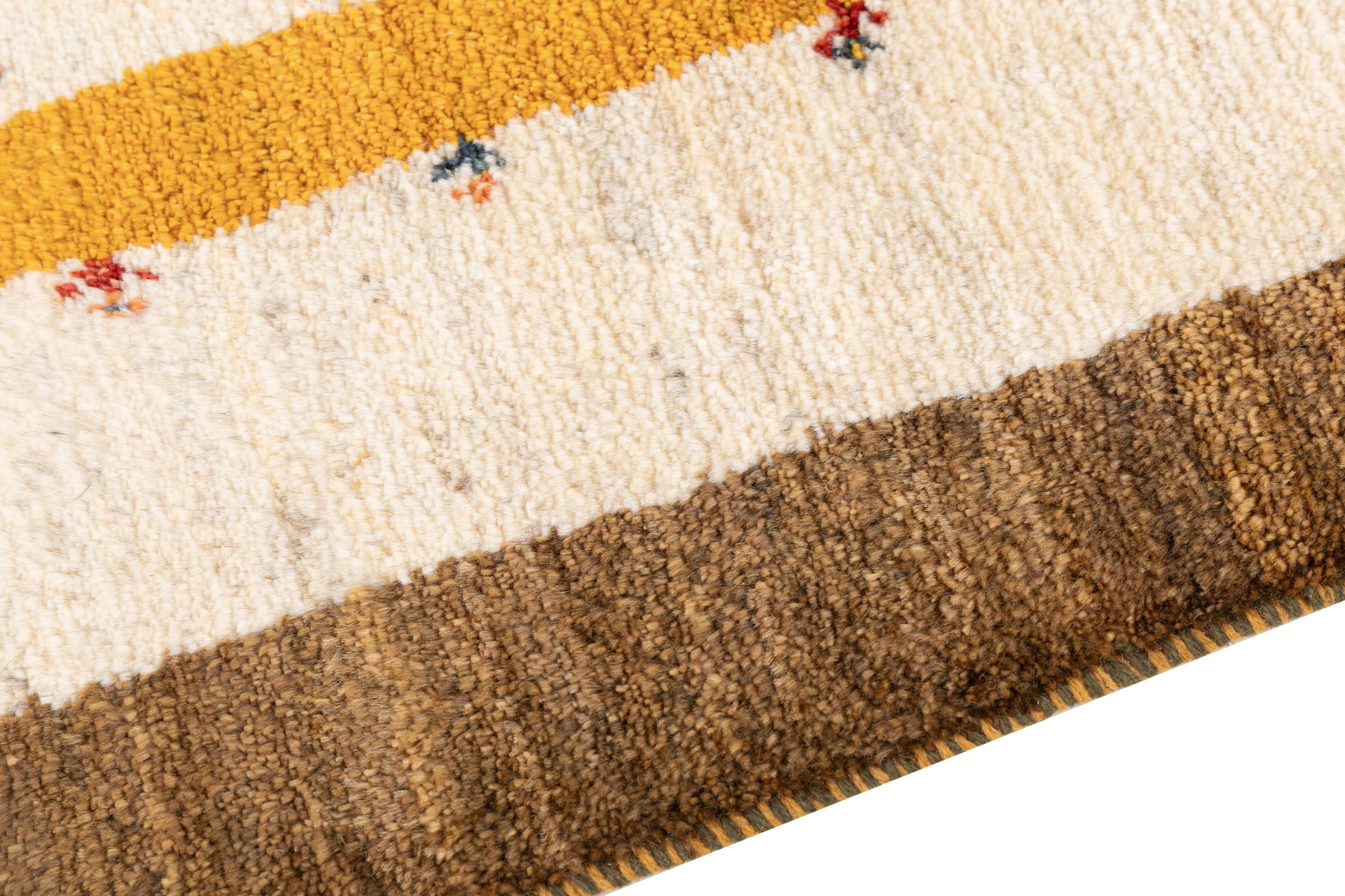 This beautiful rug is a Persian Gabbeh, one of the highest quality Gabbeh rugs available. These rugs are hand-knotted by nomads or semi-nomads in Iran using traditional artisan techniques. The simple motifs and patterns are often inspired by the nomads' immediate surroundings, featuring elements like camels, trees, or bushes. Persian Gabbeh carpets are made from wool sourced from locally raised sheep herds, with the wool typically spun by hand. Thus each of these Oriental rugs thus embodies a unique character steeped in centuries-old culture.