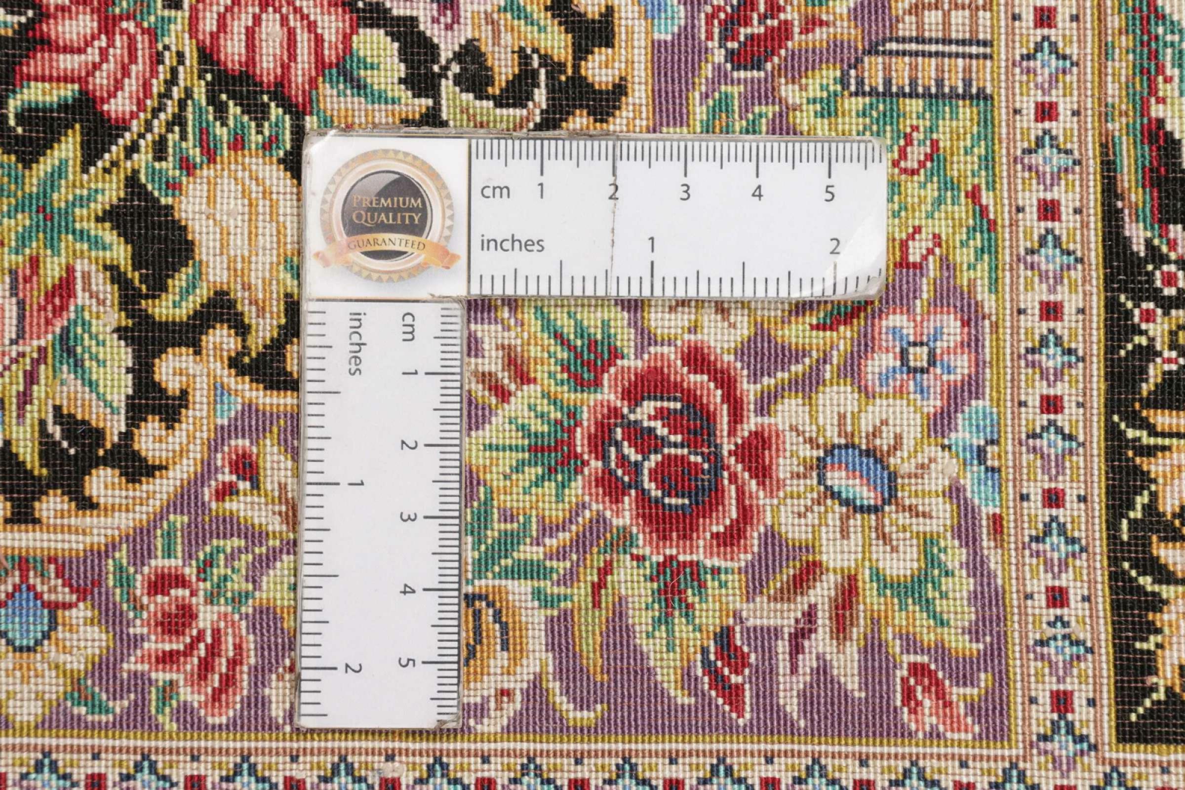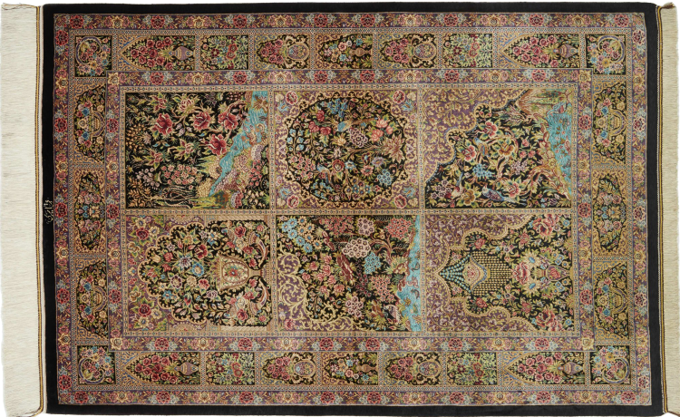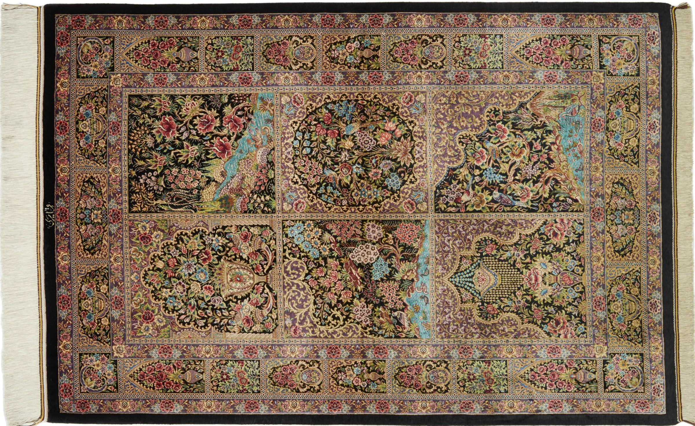 Rug ID: 247204003564989 Size: 4'11"x3'4" ft Thickness: ap. 0.16 in Knot density: 645 / square inch Manufacturing: Knotted by hand Pile: Silk Warp: Silk Origin: Persia / Iran Age: New Weight: ap. 7 lb In stock: Unique - Only 1 in stock