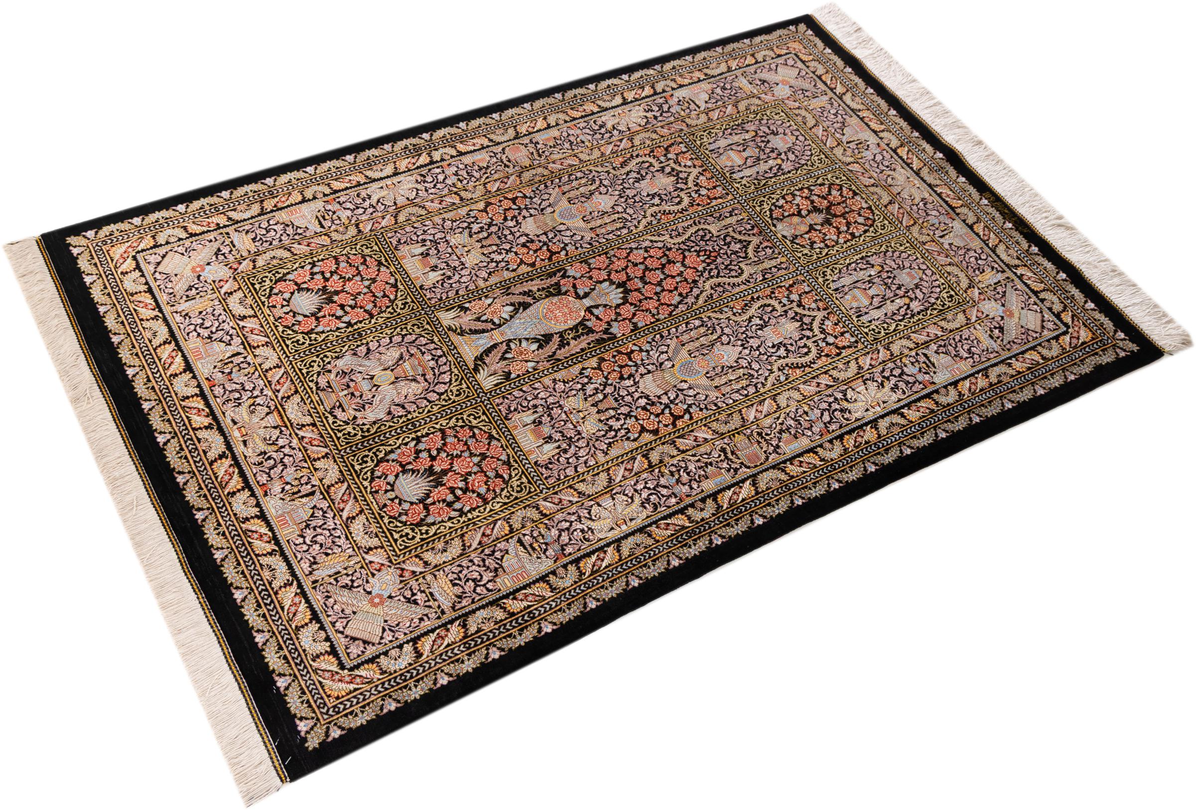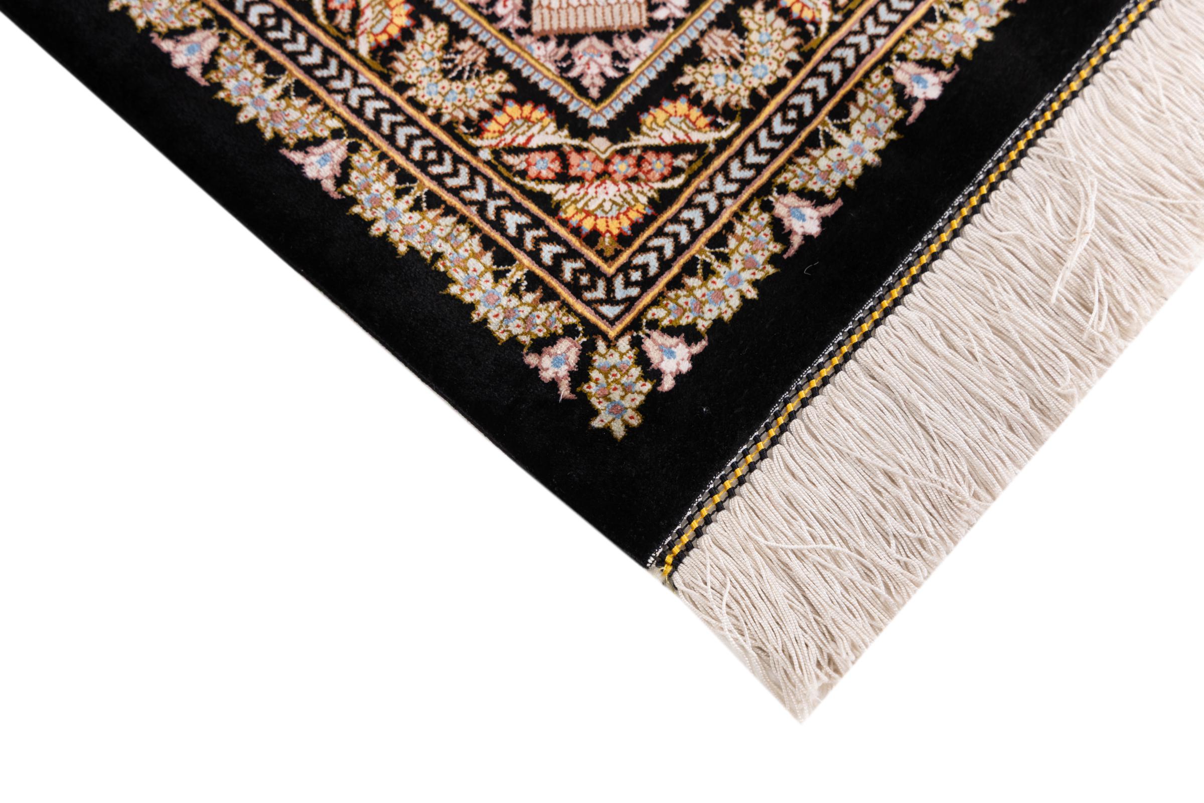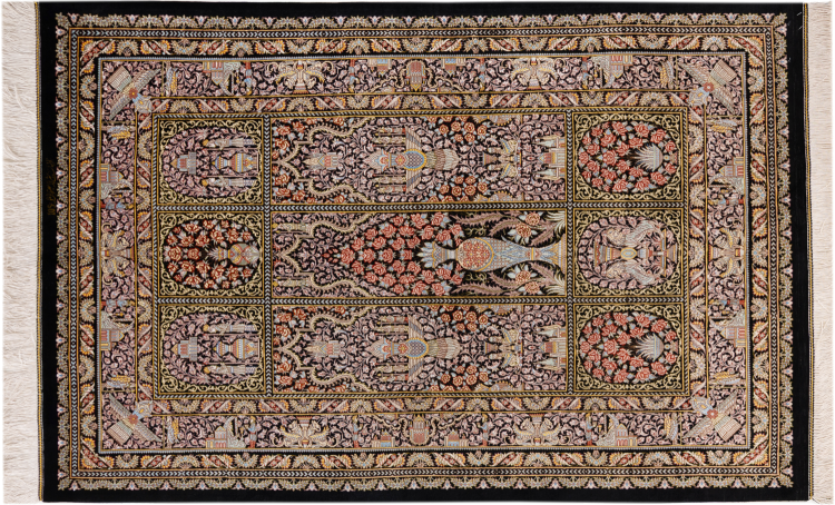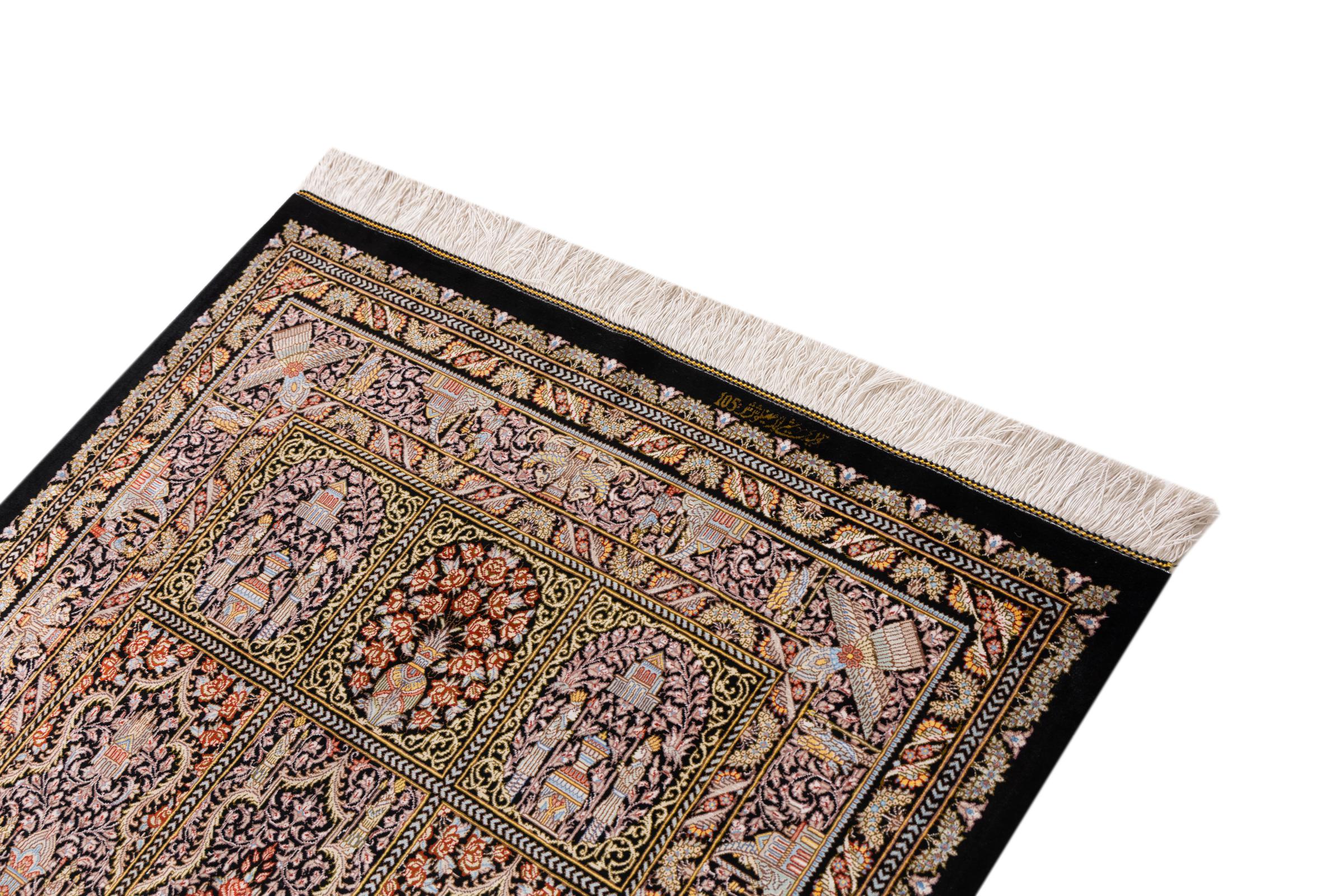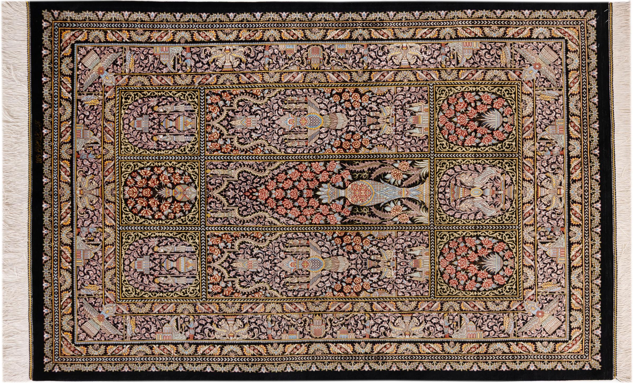 Rug ID: 1226100228020 Size: 5'0"x3'3" ft Thickness: ap. 0.16 in Knot density: 645 / square inch Manufacturing: Knotted by hand Pile: Silk Warp: Silk Origin: Persia / Iran Age: New Weight: ap. 7 lb In stock: Unique - Only 1 in stock